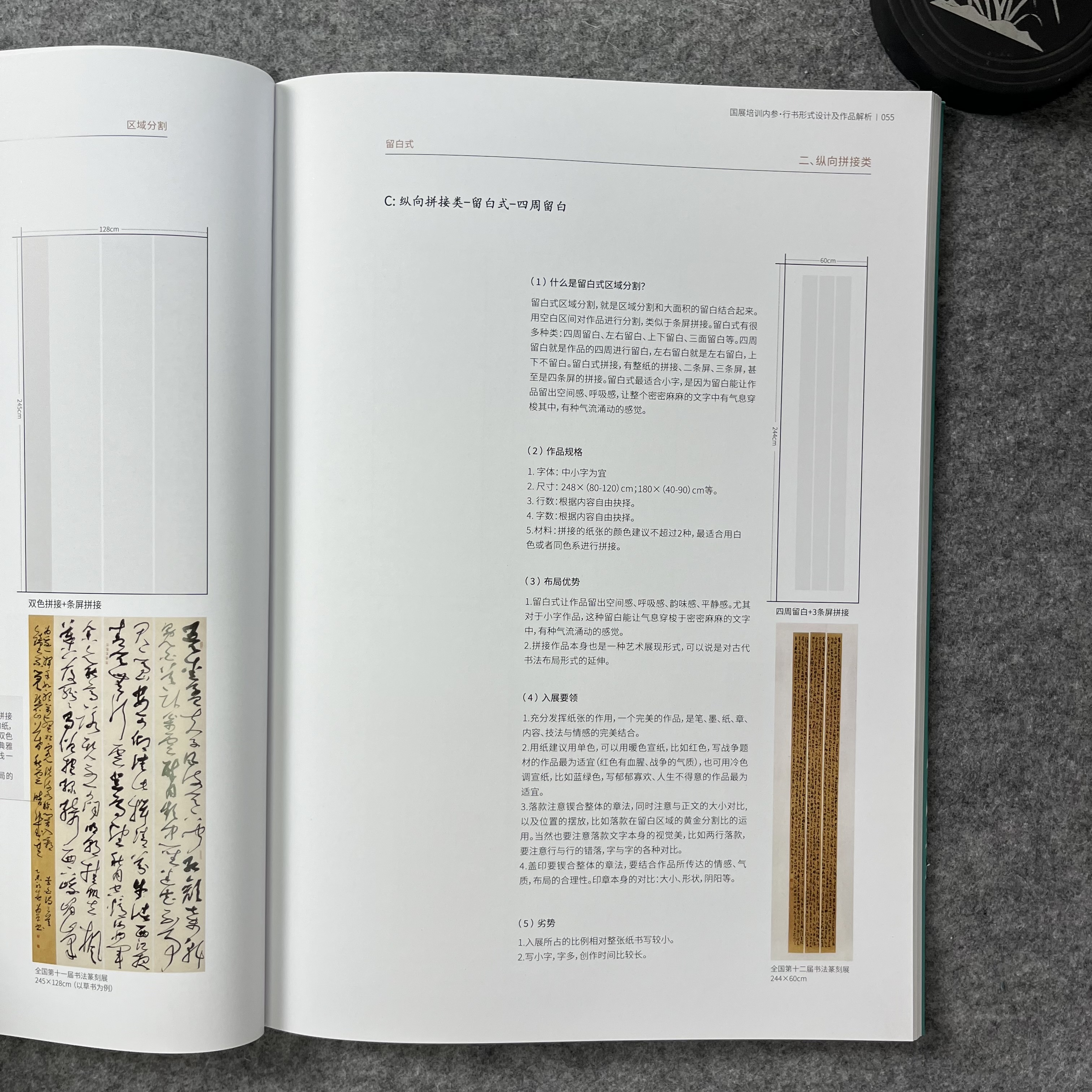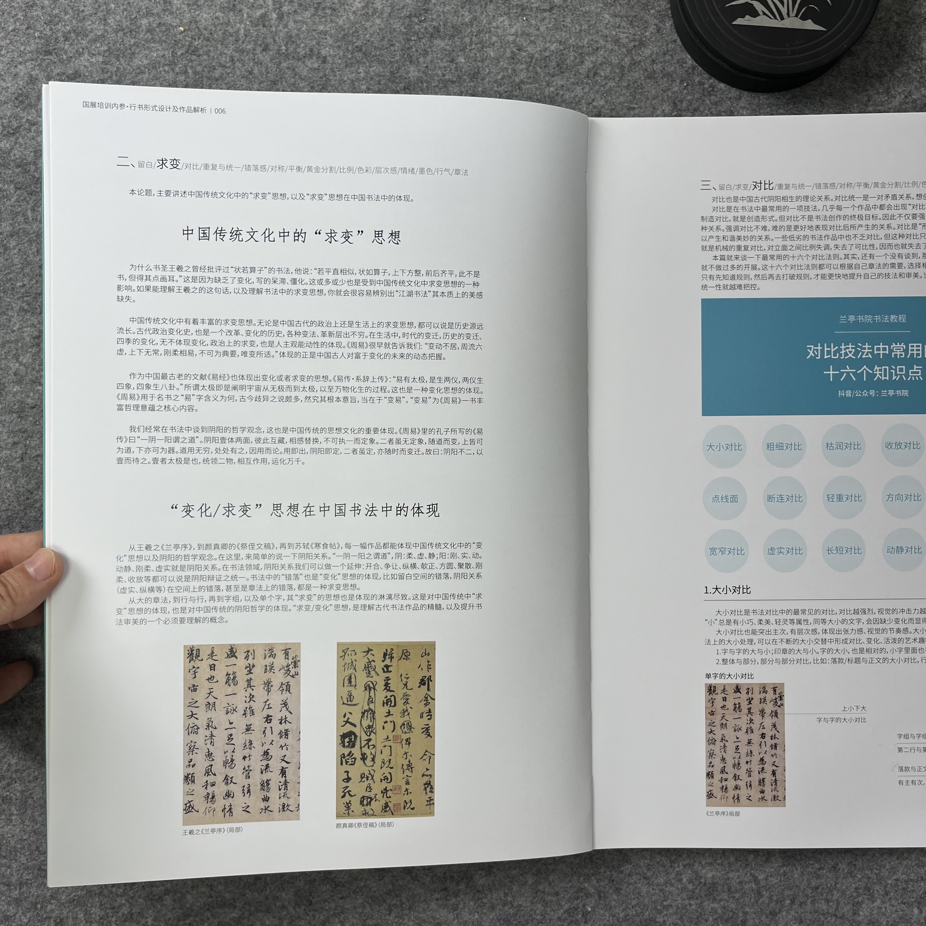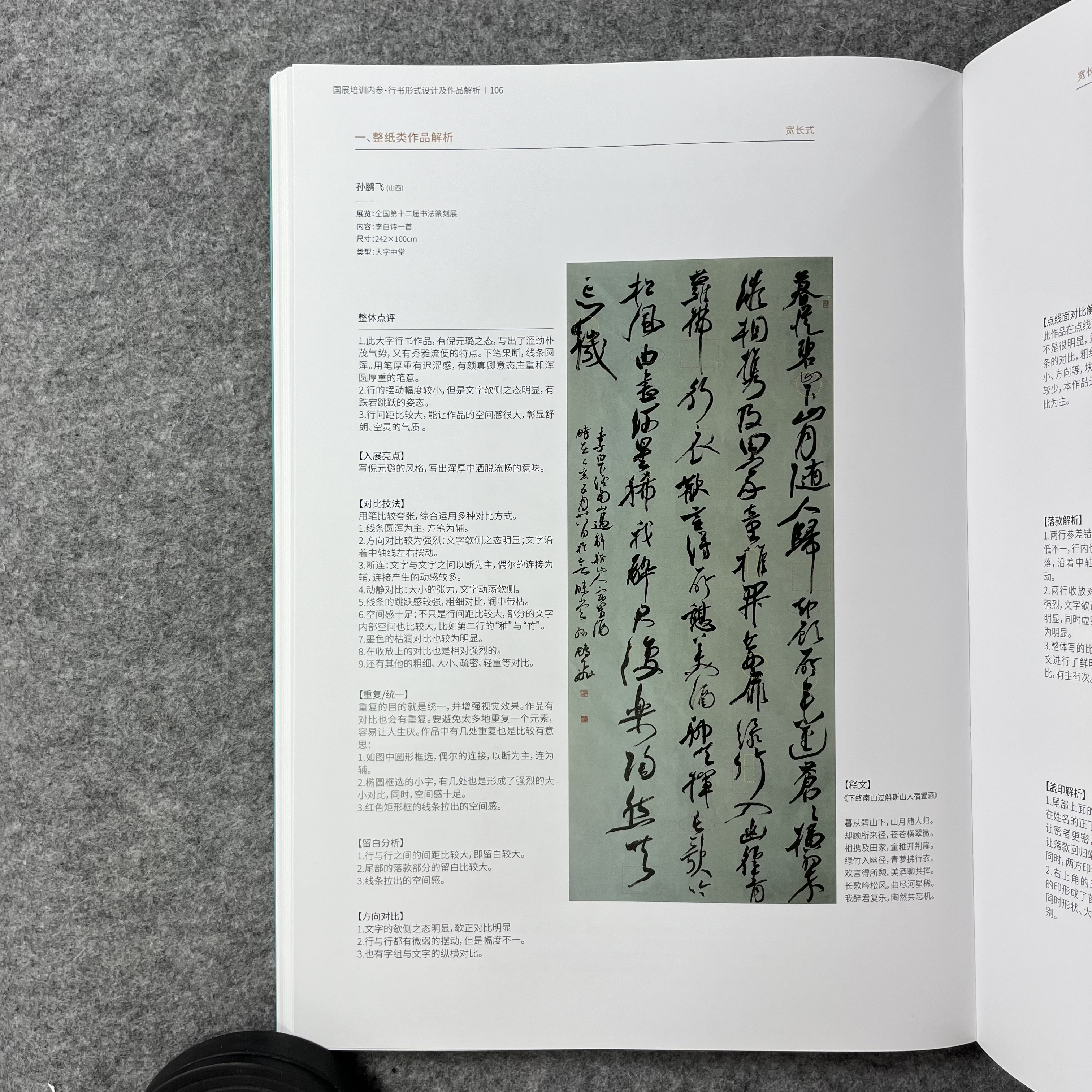 《国展内参-行书形式设计及作品解析》国展培训内部资料,从理论,到形式,再到作品的详细分析,让你知其然,知其所以然。兰亭书院制作,大八开,155页, A. 本书提供最全的形式设计,解决形式设计烦恼。 B. 从西方美学和东方美学的角度重新解读国展作品。从章法,留白,墨色,虚实等角度对作品进行详细分析,特别提到了16种对比技法,匠心之作。 C. 本书目录: 一.理论篇(西方美学解读国展作品) 1.留白的运用 2.对比技法:点线面,虚实,长短,宽窄,空间,颜色,疏密,方圆,轻重,断连,收放,方向,动静,粗细,枯润,大小等对比。 3.重复与统一/4.色彩/5.对称/6.平衡/7.黄金分割/8.比例/9.错落/10层次/11错落/12情绪等 二. 形式设计 八大形式与改版 三. 作品解读
