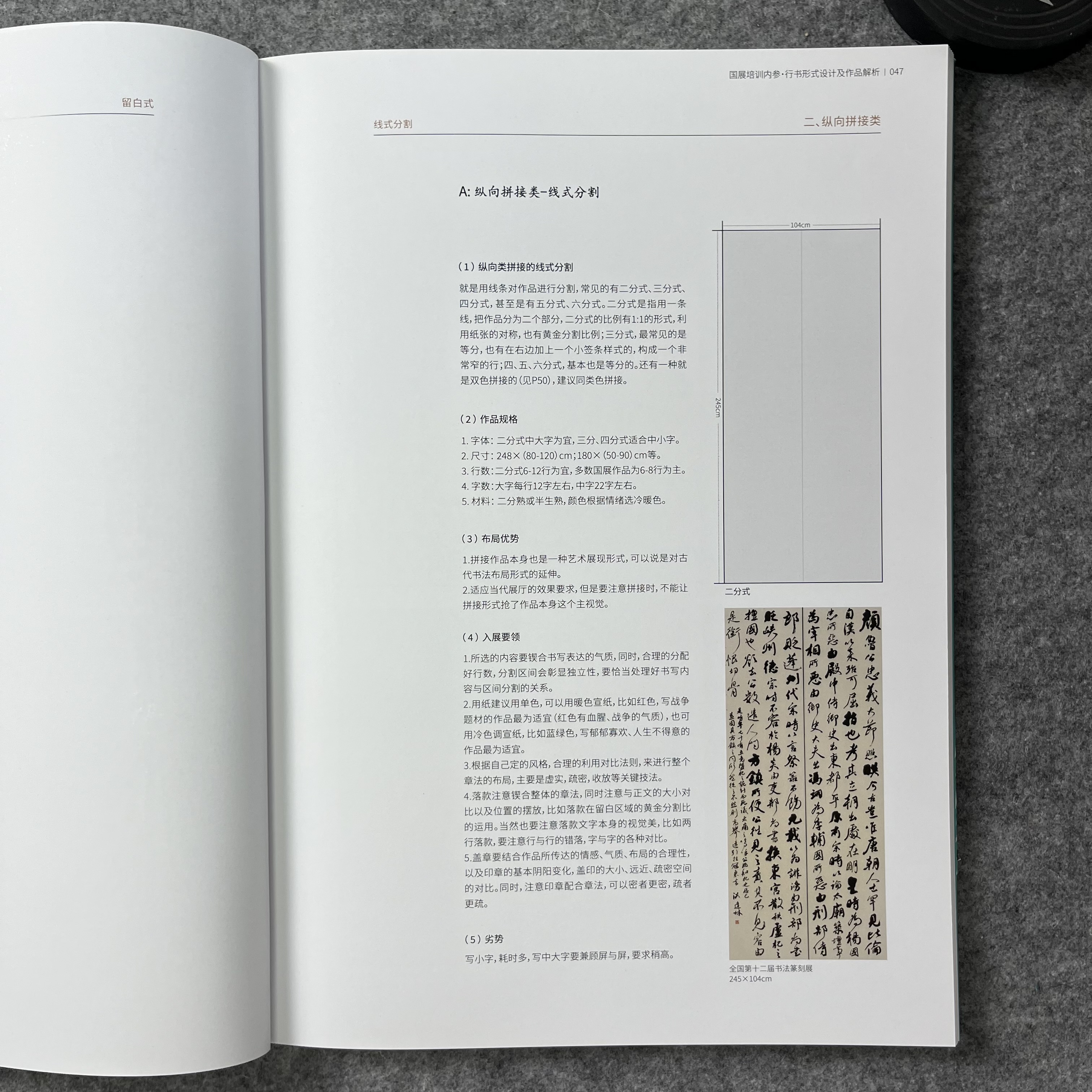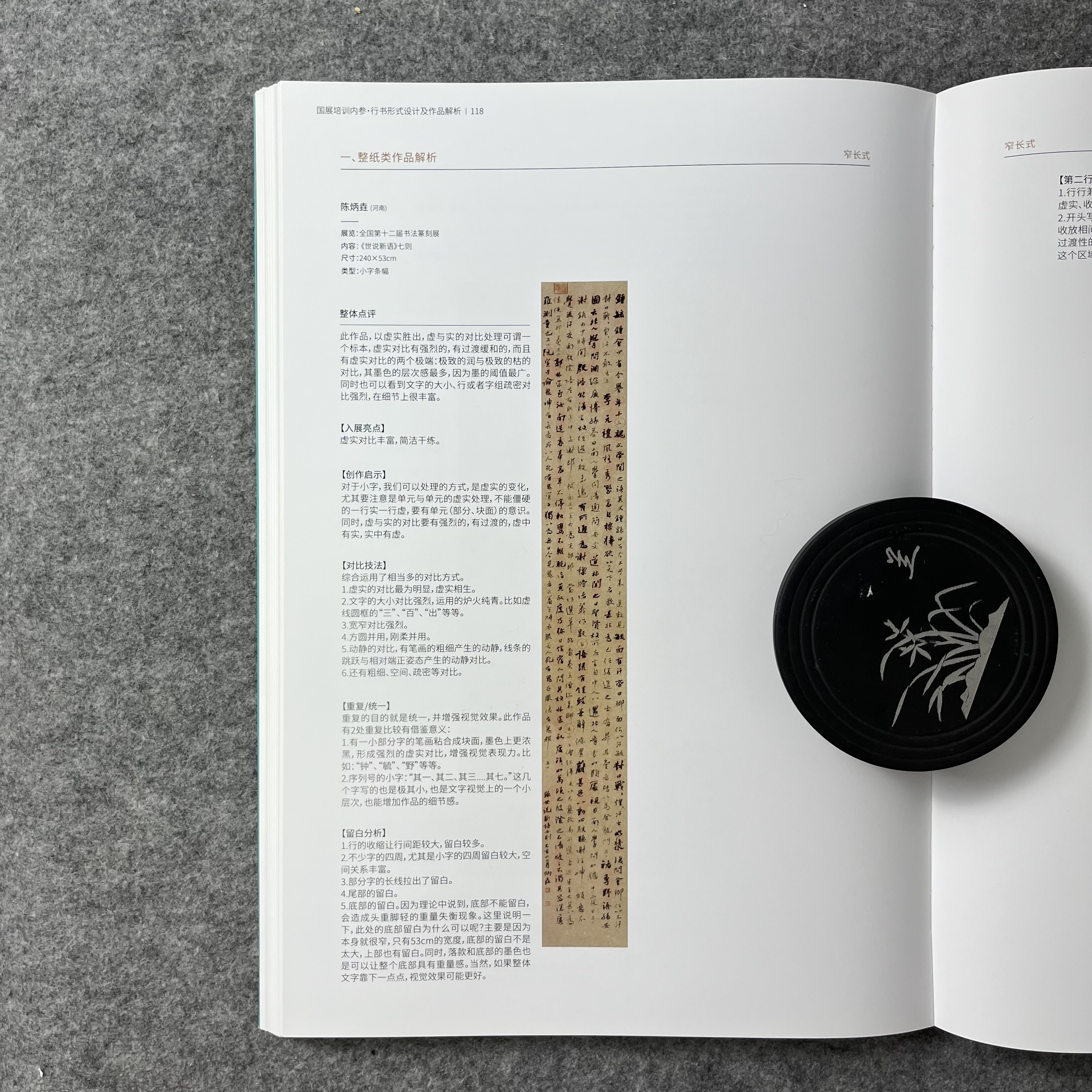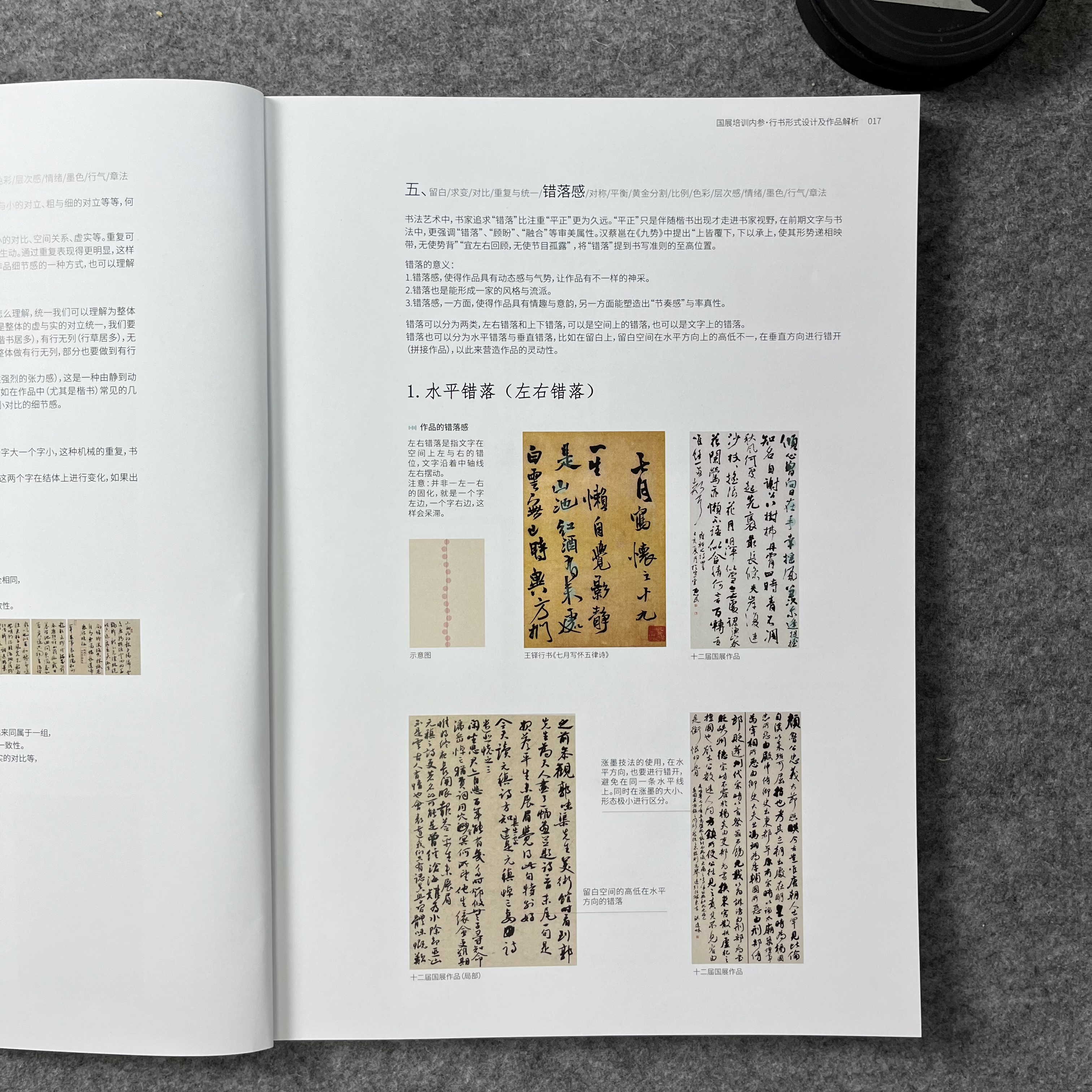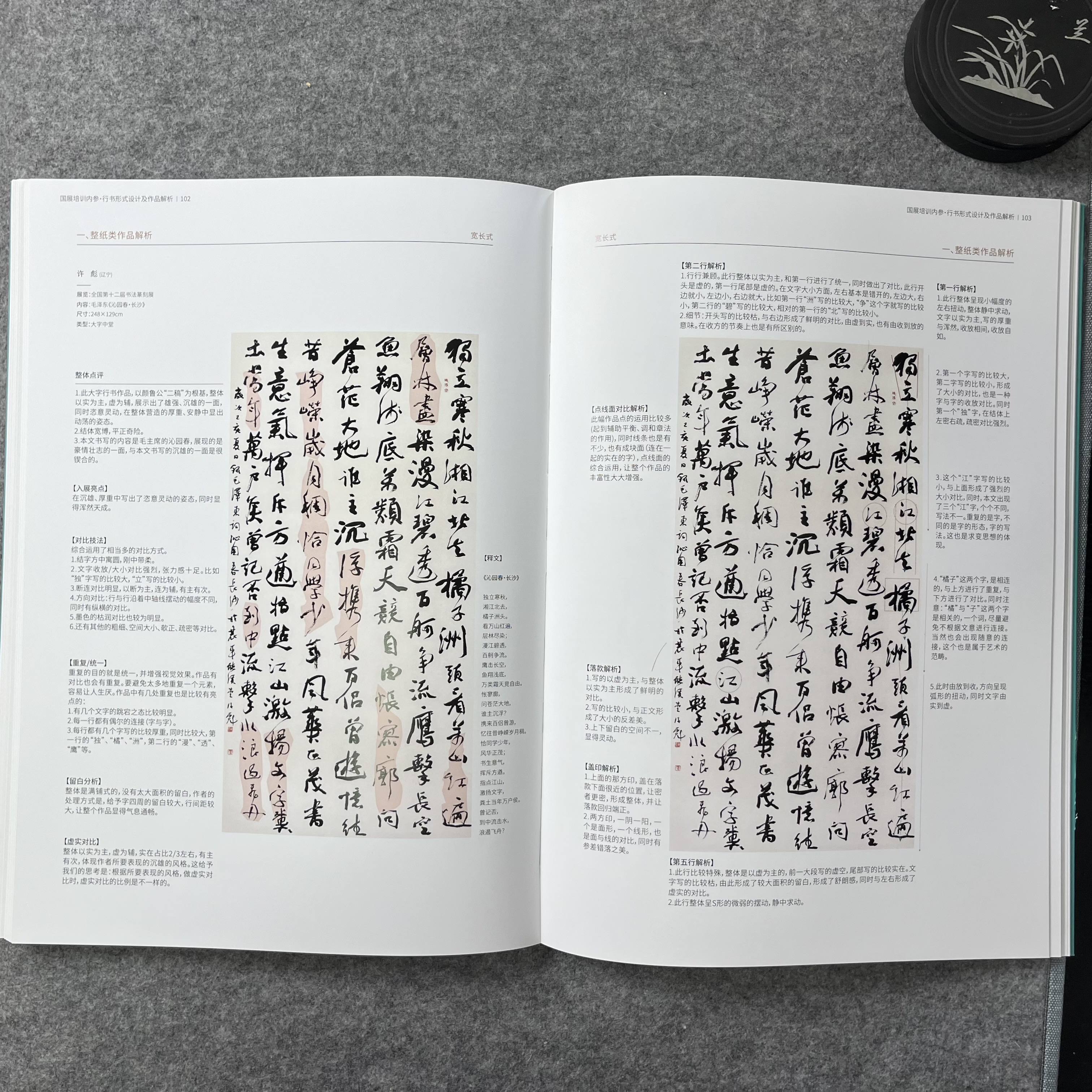 《国展内参-行书形式设计及作品解析》国展培训内部资料,从理论,到形式,再到作品的详细分析,让你知其然,知其所以然。兰亭书院制作,大八开,155页, A. 本书提供最全的形式设计,解决形式设计烦恼。 B. 从西方美学和东方美学的角度重新解读国展作品。从章法,留白,墨色,虚实等角度对作品进行详细分析,特别提到了16种对比技法,匠心之作。 C. 本书目录: 一.理论篇(西方美学解读国展作品) 1.留白的运用 2.对比技法:点线面,虚实,长短,宽窄,空间,颜色,疏密,方圆,轻重,断连,收放,方向,动静,粗细,枯润,大小等对比。 3.重复与统一/4.色彩/5.对称/6.平衡/7.黄金分割/8.比例/9.错落/10层次/11错落/12情绪等 二. 形式设计 八大形式与改版 三. 作品解读