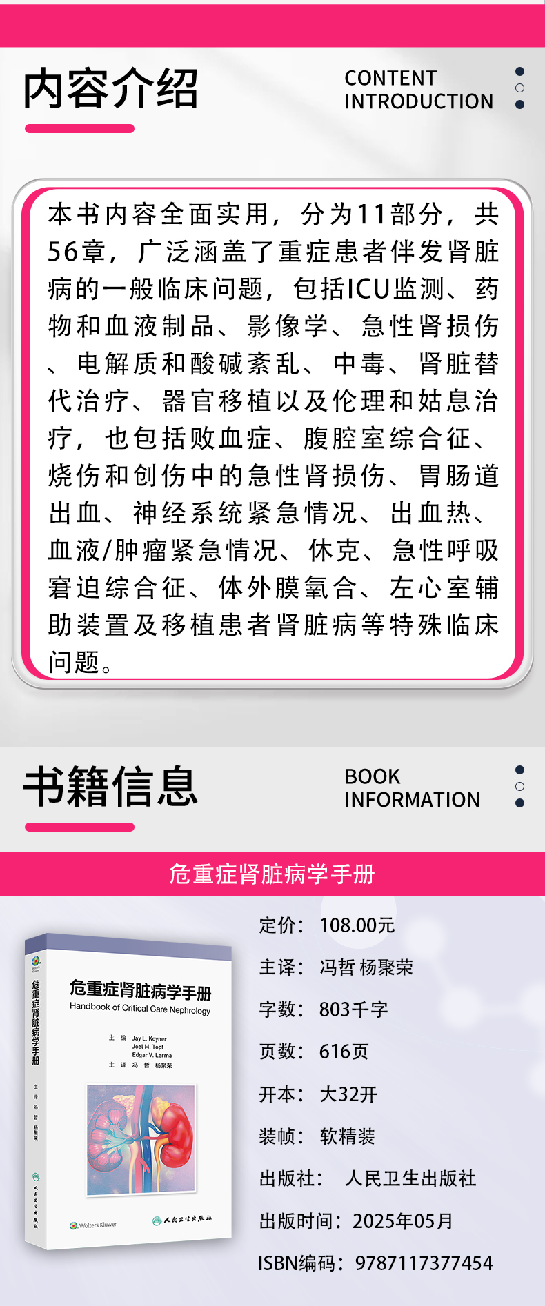本书内容全面实用,分为11部分,共56章,广泛涵盖了重症患者伴发肾脏病的一般临床问题,包括 ICU监测、药物和血液制品、影像学、急性肾损伤、电解质和酸碱紊乱、中毒、肾脏替代治疗、器官移植以及伦理和姑息治疗,也包括败血症、腹腔室综合征、烧伤和创伤中的急性肾损伤、胃肠道出血、神经系统紧急情况、出血热、血液/肿瘤紧急情况、休克、急性呼吸窘迫综合征、体外膜氧合、左心室辅助装置及移植患者肾脏病等特殊临床问题。