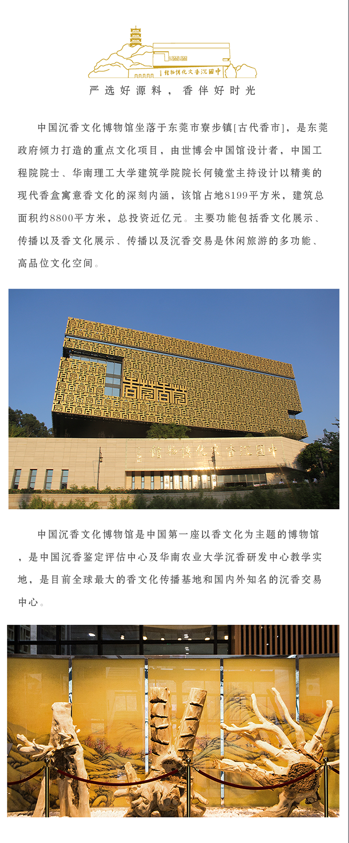 中国沉香文化博物馆坐落于古代[香市]东莞市寮步镇,是东莞政府倾力打造的重点文化项目,由世博会中国馆设计者,中国工程院院士、华南理工大学建筑学院院长何镜堂主持设计,以精美的现代[香盒]寓意香文化的深刻内