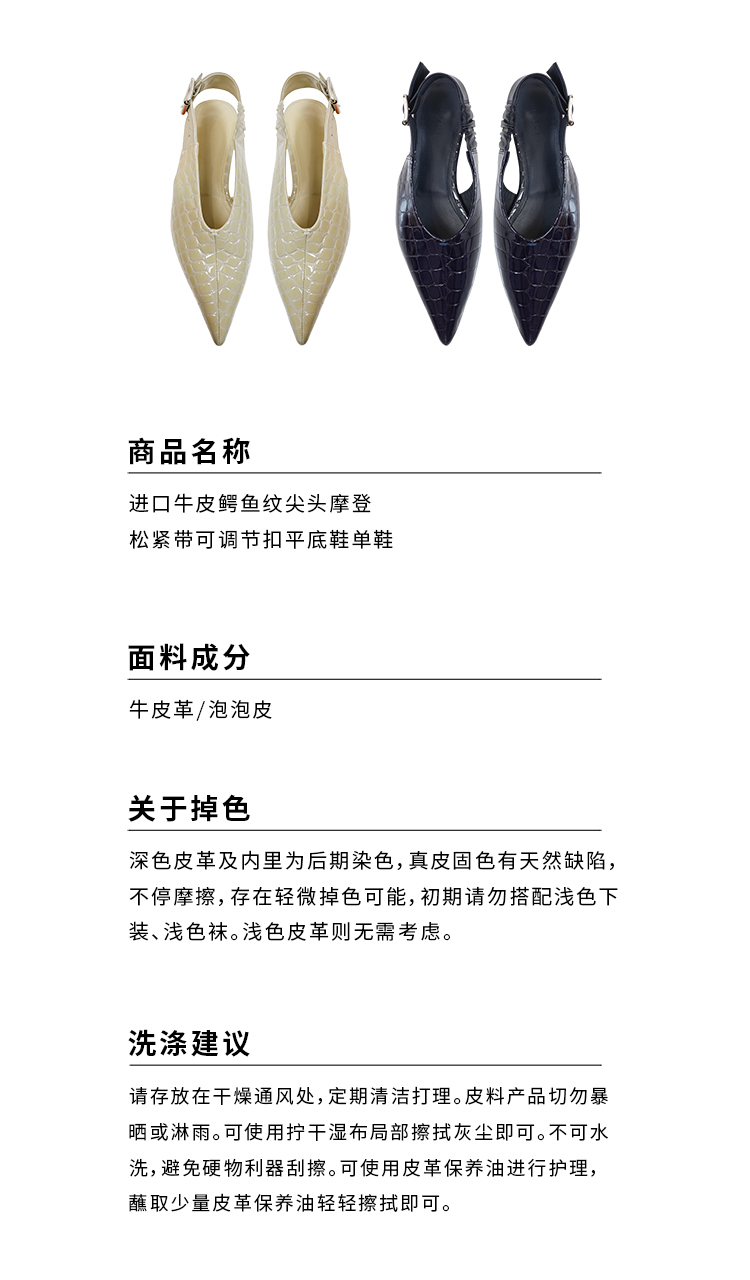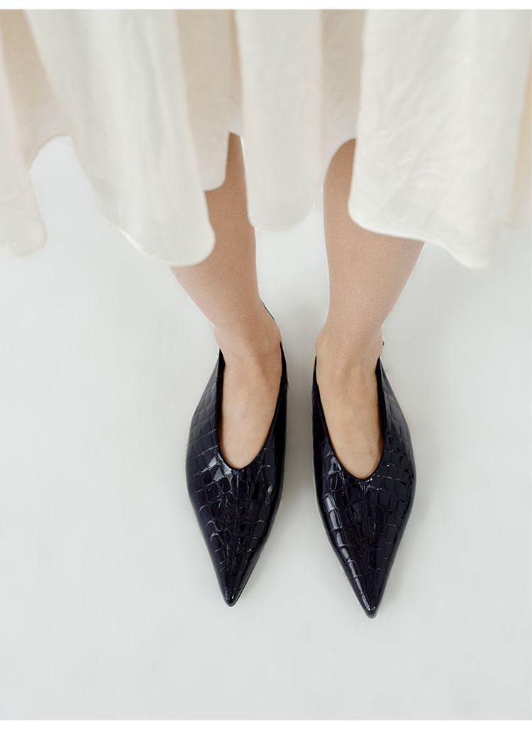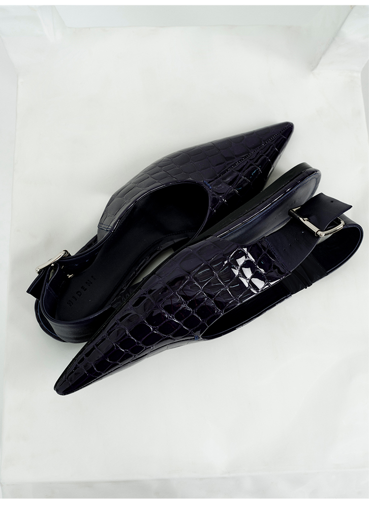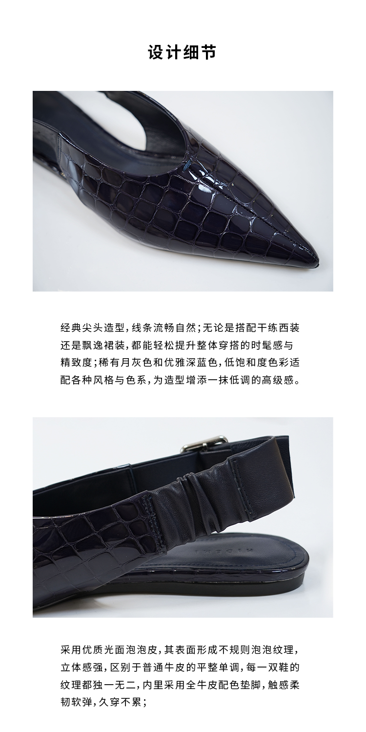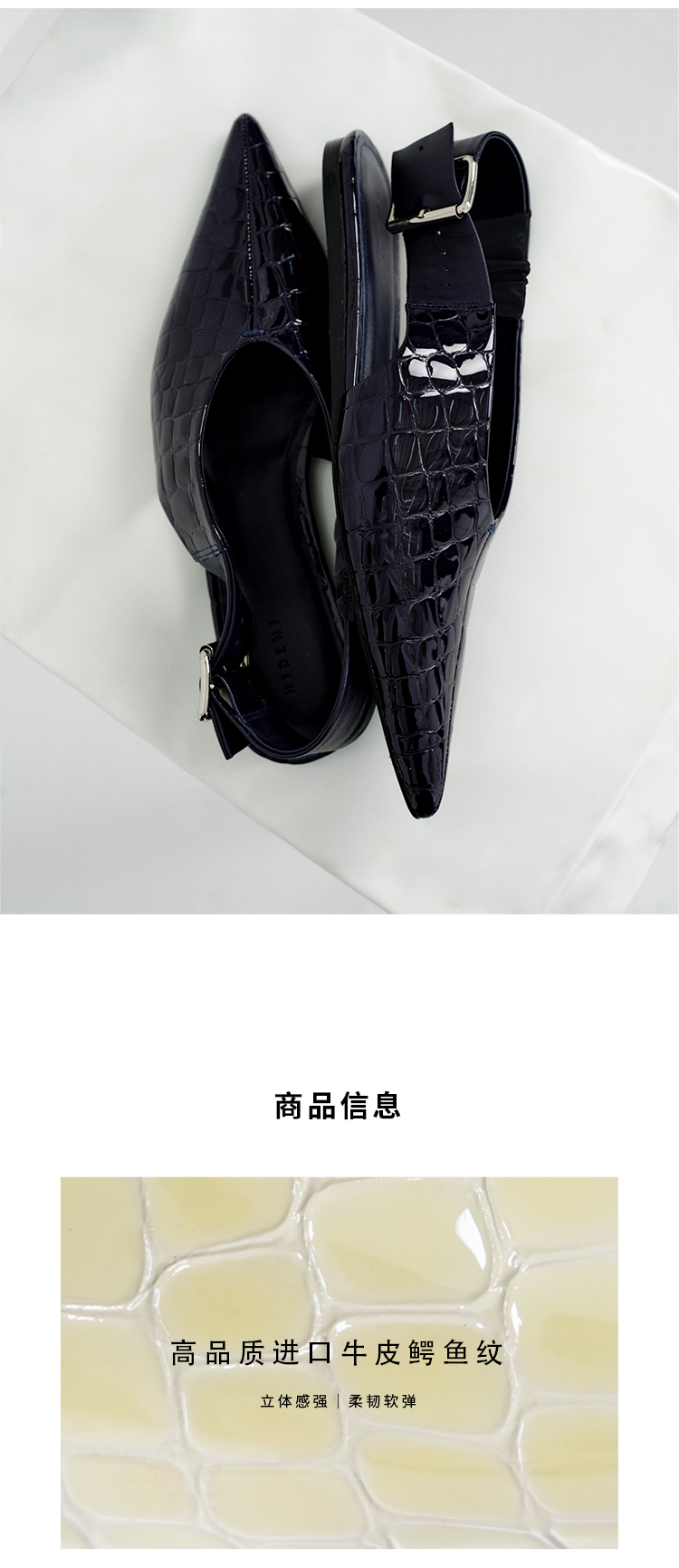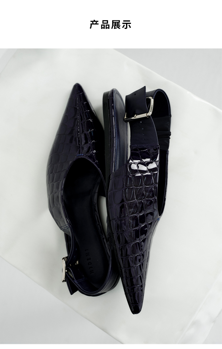 HIDEMI 进口牛皮鳄鱼纹尖头摩登松紧带可调节扣平底鞋单鞋 夜空蓝/杏仁灰