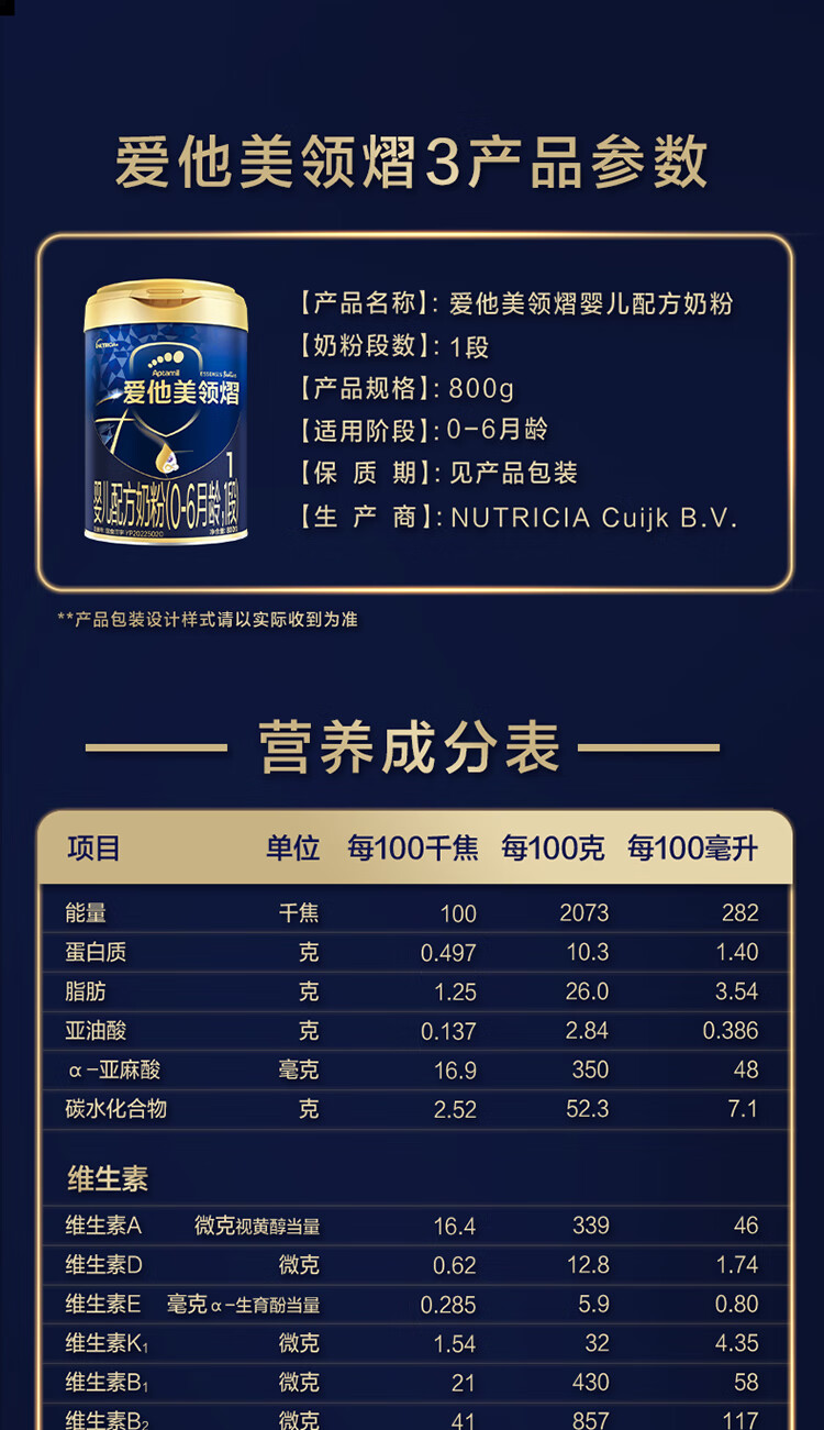 爱他美领熠婴儿配方奶粉 (0-6月龄, 1段)800g/罐