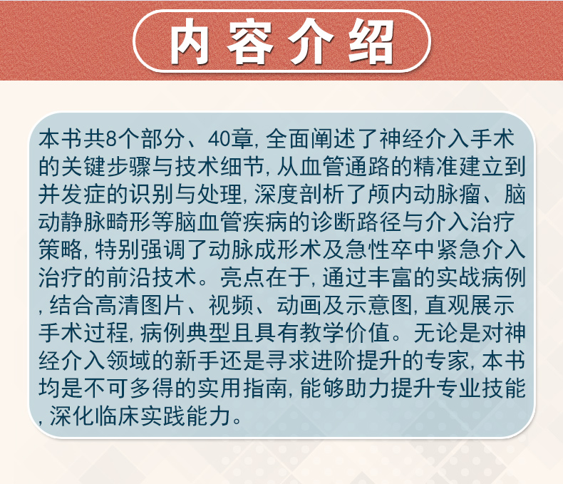 本书共8个部分、40章,全面阐述了神经介入手术的关键步骤与技术细节,从血管通路的精准建立到并发症的识别与处理,深度剖析了颅内动脉瘤、脑动静脉畸形等脑血管疾病的诊断路径与介入治疗策略,特别强调了动脉成形术及急性卒中紧急介入治疗的前沿技术。亮点在于,通过丰富的实战病例,结合高清图片、视频、动画及示意图,直观展示手术过程,病例典型且具有教学价值。无论是对神经介入领域的新手还是寻求进阶提升的专家,本书均是不可多得的实用指南,能够助力提升专业技能,深化临床实践能力。