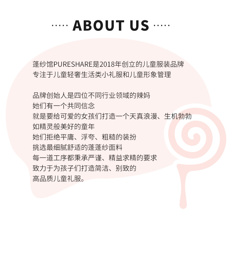 - PureShare蓬纱馆,2018年创立的儿童服装品牌,专注于儿童轻奢生活类小礼服,主张“让孩子做最独特的自己”的品牌理念,为孩子们提供时尚简洁、优雅而又不失童真的生活类礼服。