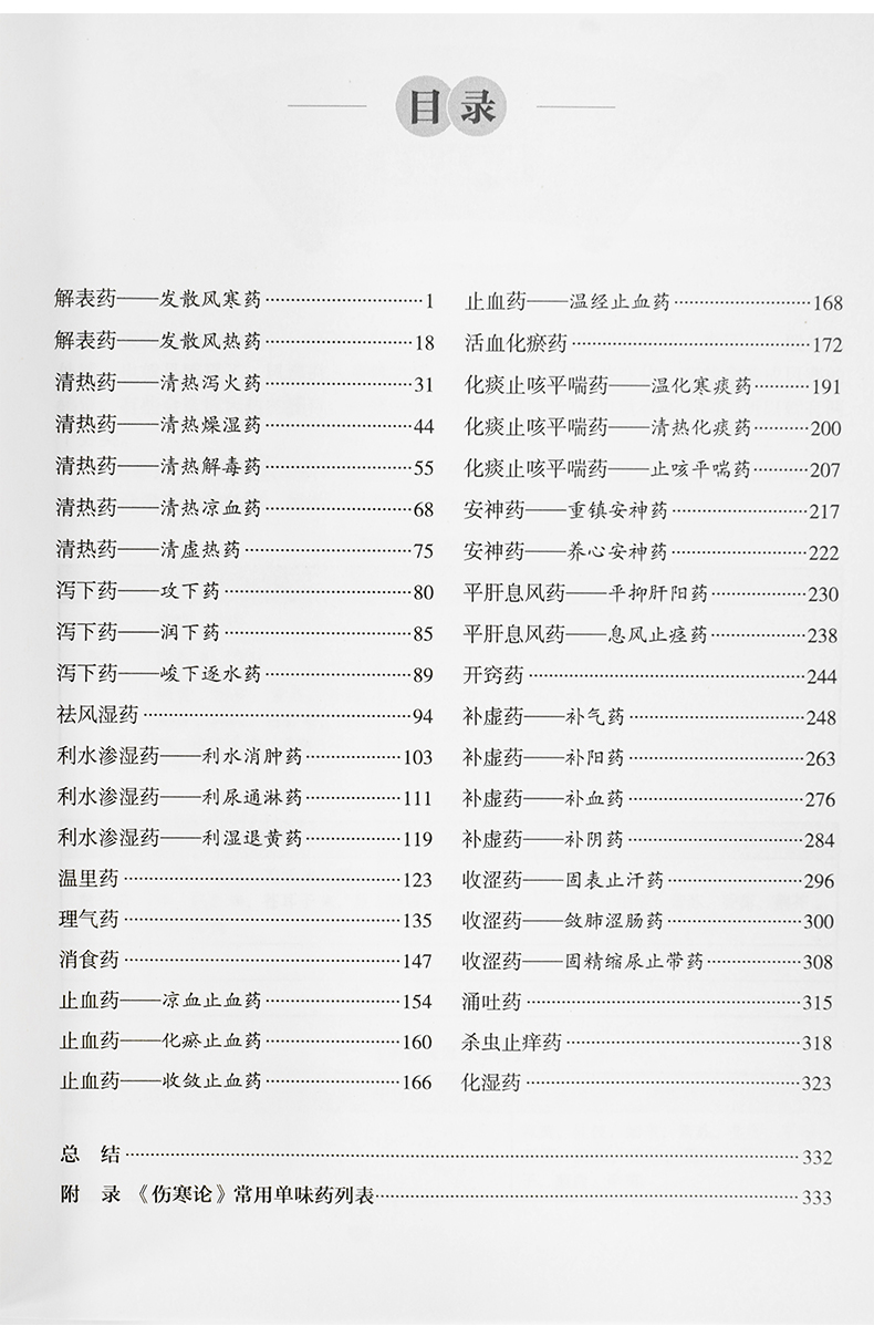 全册共计342页,遵循中药学常见的分类体系,分为解表药、清热药、泻下药、祛风湿药、利水渗湿药、温里药、理气药、消食药、止血药、活血化瘀药、安神药、平肝息风药、开窍药、补虚药、收涩药、涌吐药、杀虫止痒药、化湿药。