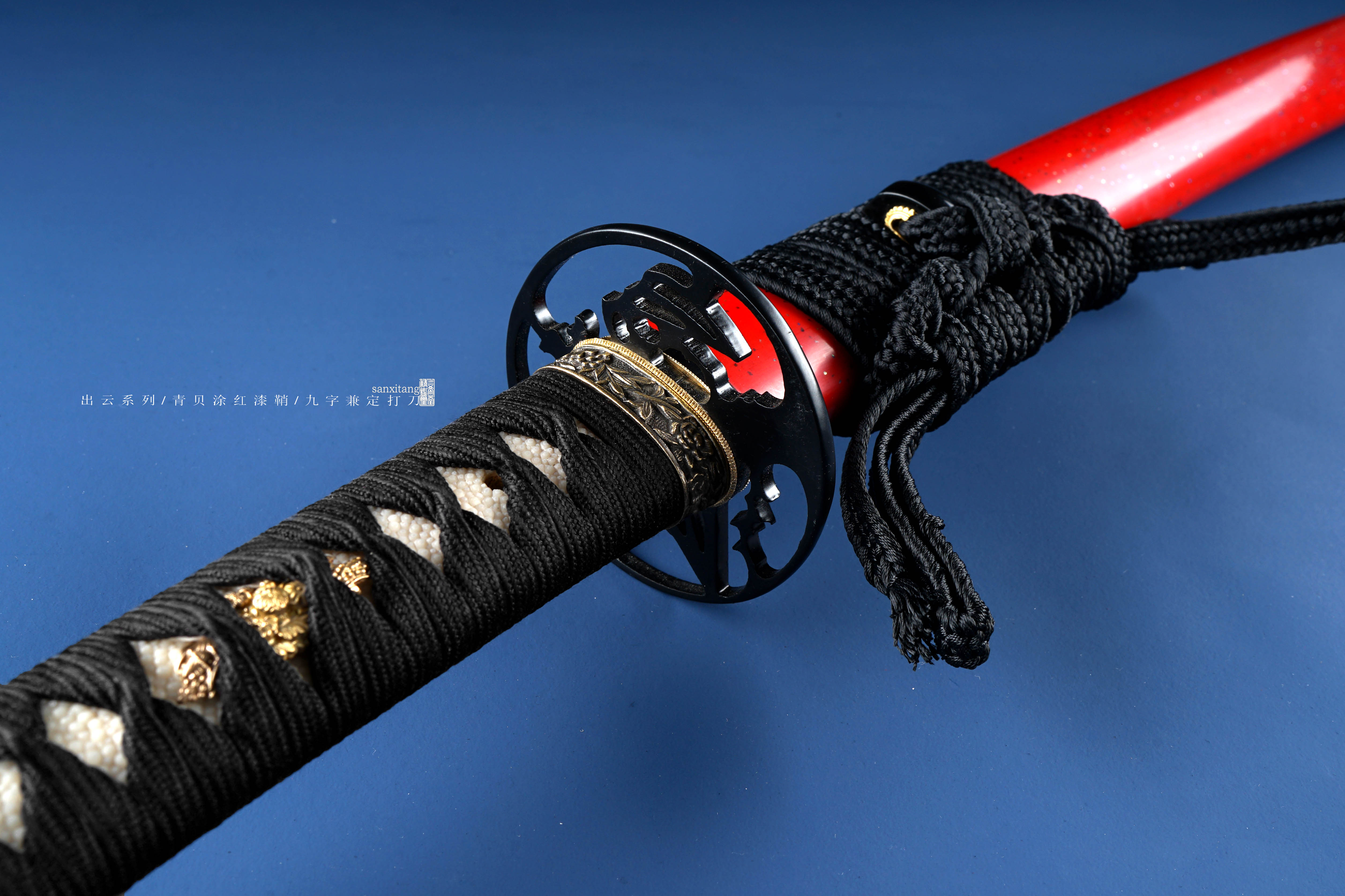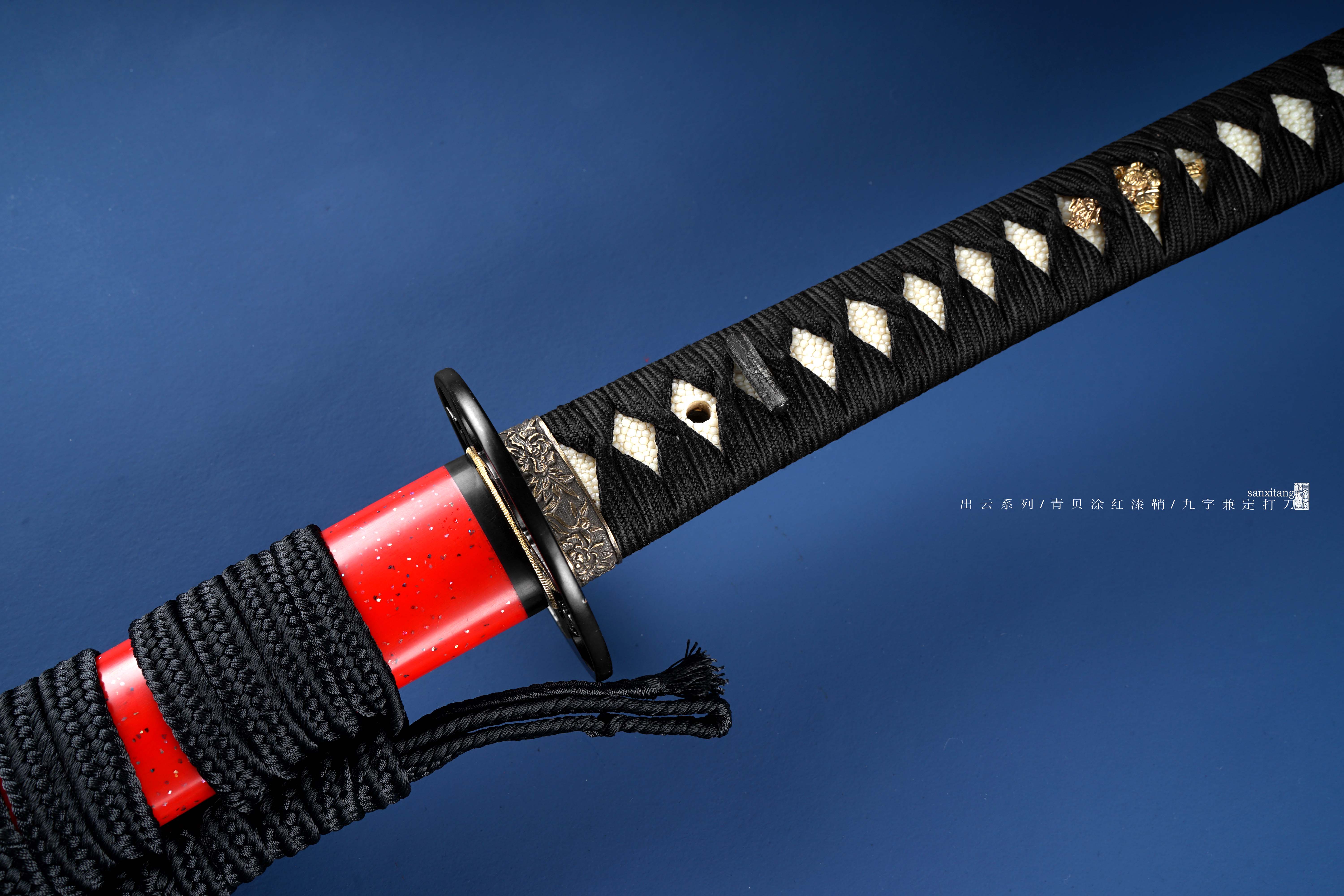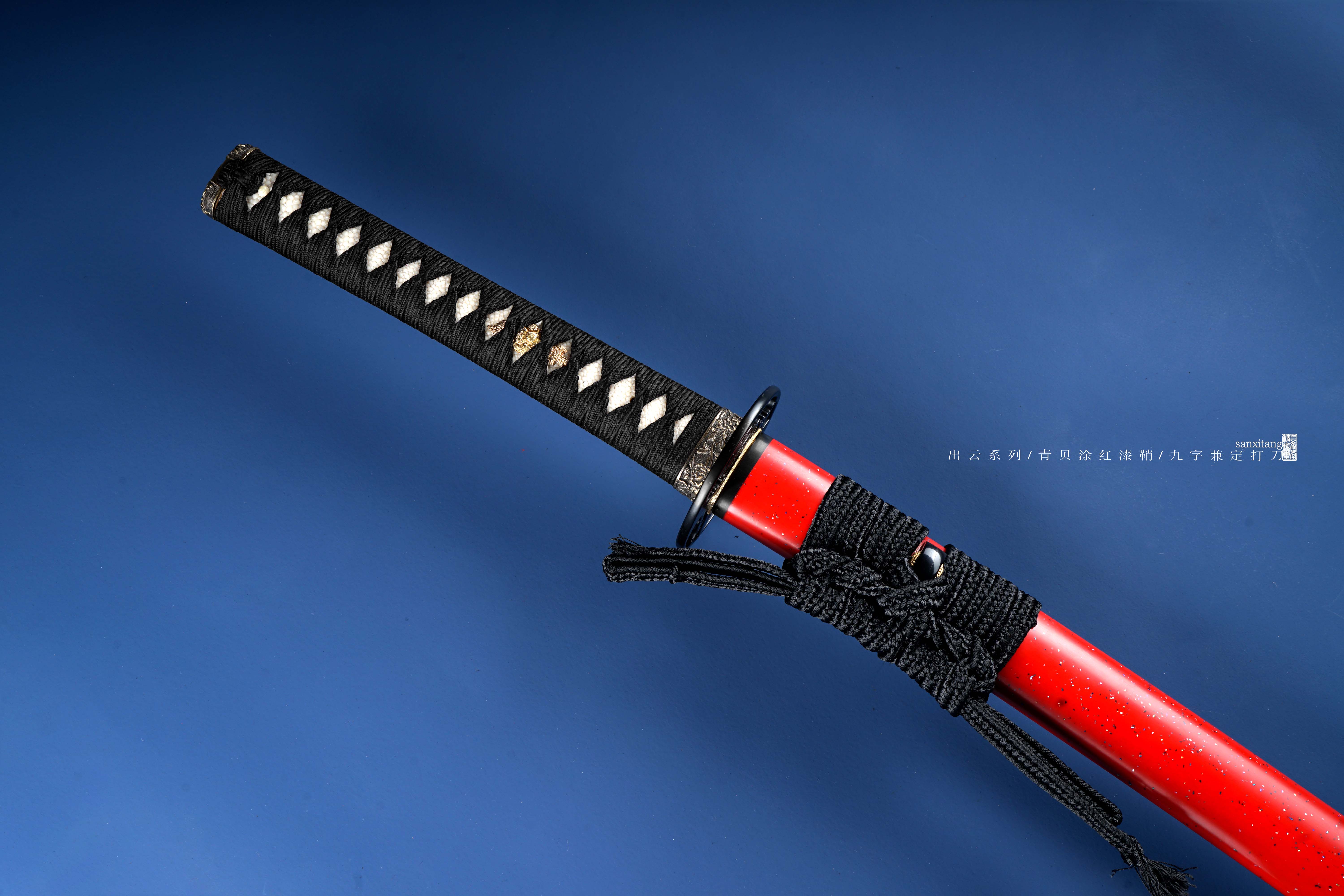 现货两只 这个大家都很熟悉了 茎上有"临兵闘者皆阵列在前"九个字 这句话被称为九字真言 再配上匠人名字 这只刀因此被称作九字兼定 我们正式开始给大家定制 我们自己锻打的8000余层高碳钢 传统方法覆土烧刃 刀的弧度是淬火的时候自然形成的 手工用各种磨刀石一道一道磨出来的 点线面清晰分明 线条挺拔立体 三色明显 表面柔顺细腻 柄和鞘不再像入门级别的一样是通用鞘了 都是全手工根据刀条一比一制作的 贴合度可以说是完美 镶天然牛角型制还原日式味道 这一步的成本能买一把入门级别的刀了 日本进口真丝柄卷+大颗粒珍珠鱼皮 手工缠绳 质感相当不错 传统天然大漆鞘 朱漆撒贝母 档次很高 这只作品可以说是现代美学和传统工艺的完美结合 我自己很满意的一把好刀 今年我们6800和9800两个价格的日本叨作品 工期最迟不超过2个月 全部保证品控和效率 年后也会专门做一个进度查询平台 让大家可以自行查看爱刀做到哪一步了 非常感谢各位支持 这只作品大家自己玩或者送礼都相当合适!!