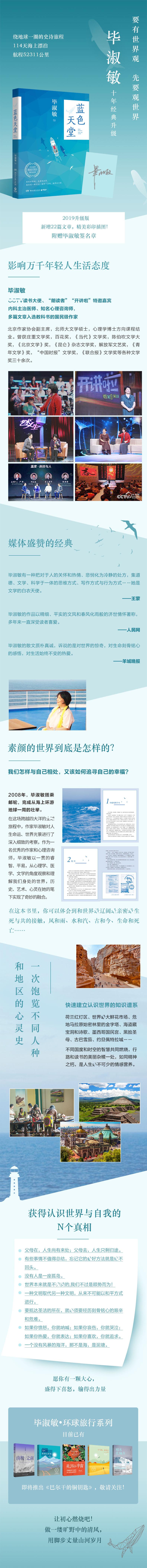 《蓝天堂》是毕淑敏旅行散文代表作。2008年,毕淑敏搭乘邮轮,完成从海上环游地球一周的壮举。在这场跨越四大洋的全球旅程中,作家毕淑敏对人生命运、世界光景进行了深入细致的考察,作为一名优秀的作家和心理咨询师,毕淑敏以一贯的睿智、平易,从心理学、医学、文学的角度观察和理解我们身处的世界,历史、艺术、心灵在她的笔下实现了奇妙的融合。在这本书里,你可以体会到和世界最辽阔最亲密最生死与共的接触,风和雨、水和汽、古和今、生命和死亡……素颜的世界到底是怎样的?我们怎样与自己相处,又该如何追寻自己的幸福?荷兰红灯区、世界大鲜花市场、危地马拉原始密林里的金字塔、海盗藏宝洞里的诗歌、墨西哥国民宫、黑脸圣母、古巴雪茄、约旦佩特拉城……在这本书里,你可以一次性饱览不同人种和地区的心灵史,建立认识世界的知识谱系。让初心燃烧吧,像一缕旷野中的清风,抵达圣洁的所在。