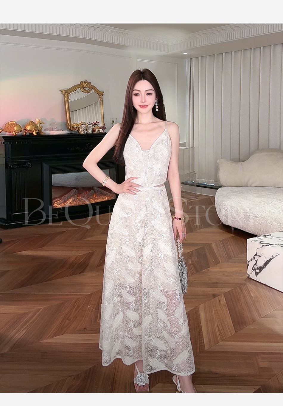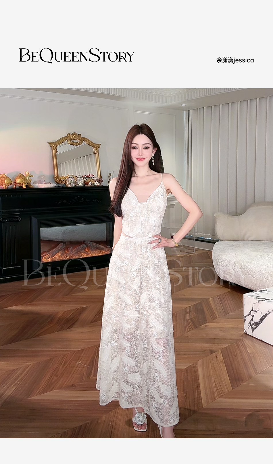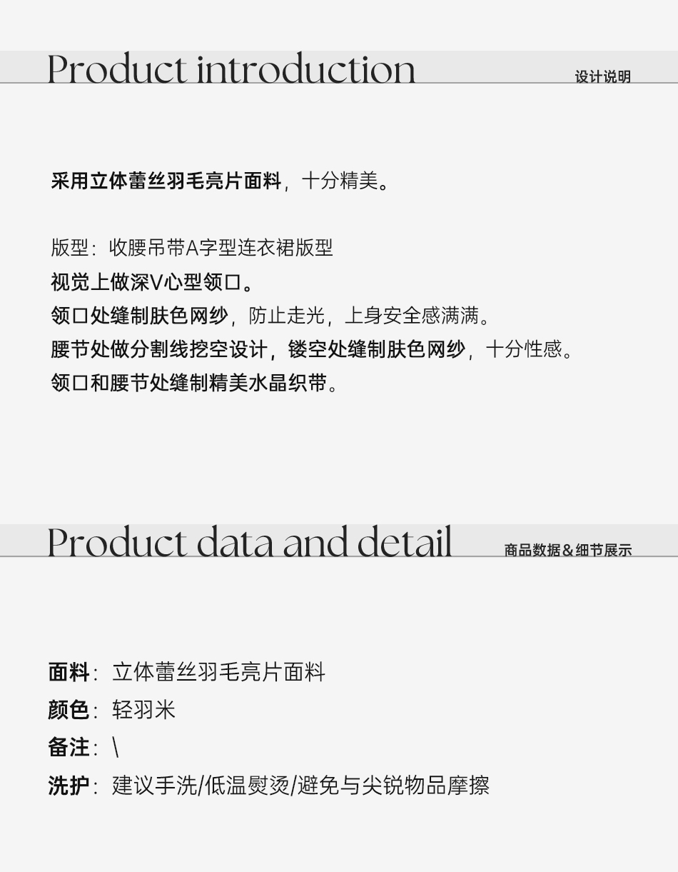 余潇潇【轻羽舞会】2025春装新款蕾丝羽毛亮片收腰吊带A字连衣裙