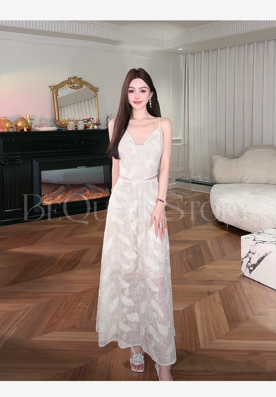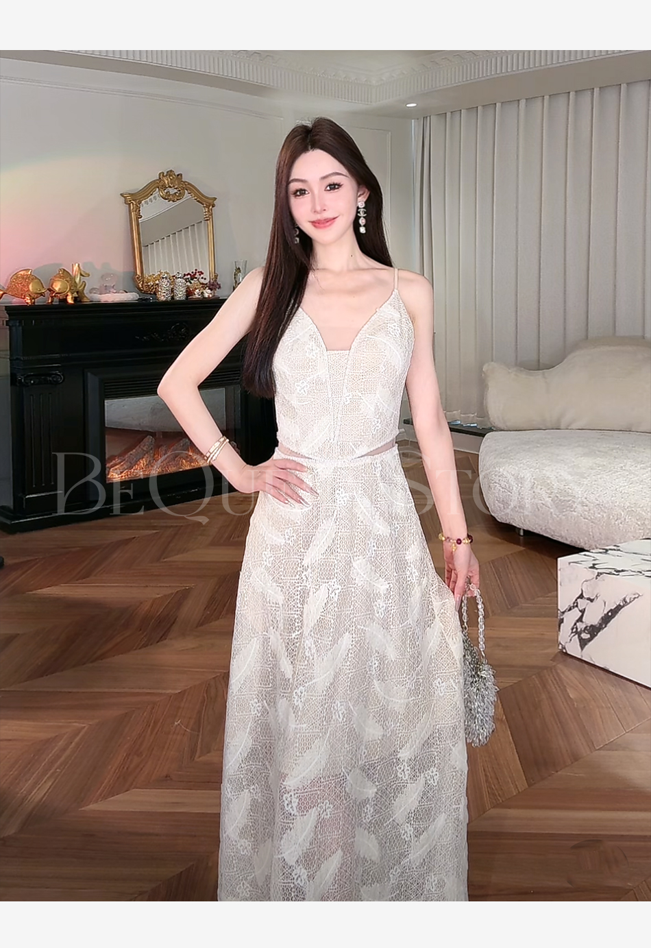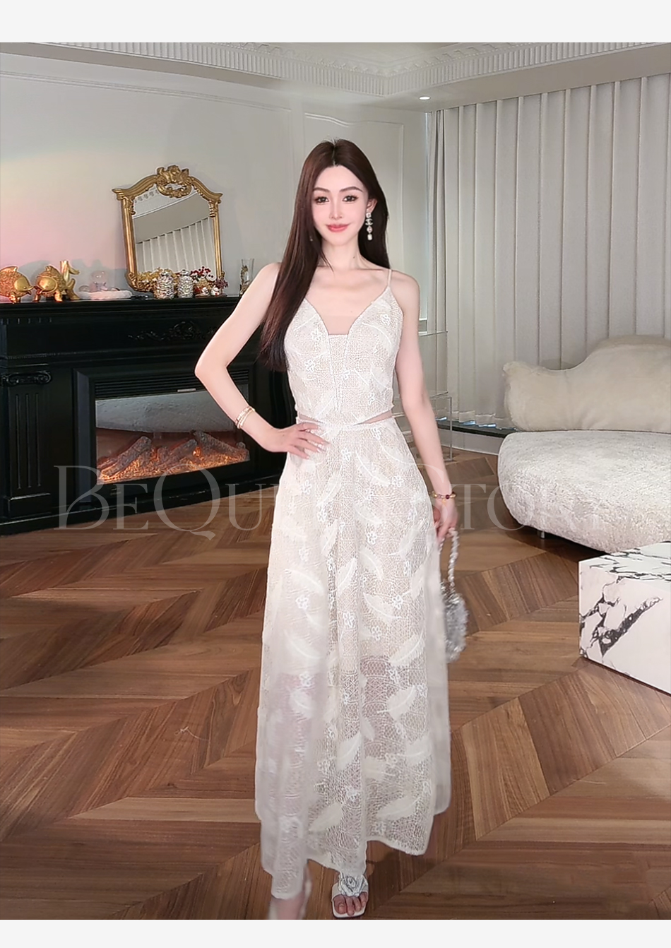 余潇潇【轻羽舞会】2025春装新款蕾丝羽毛亮片收腰吊带A字连衣裙