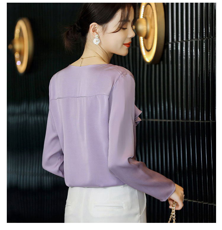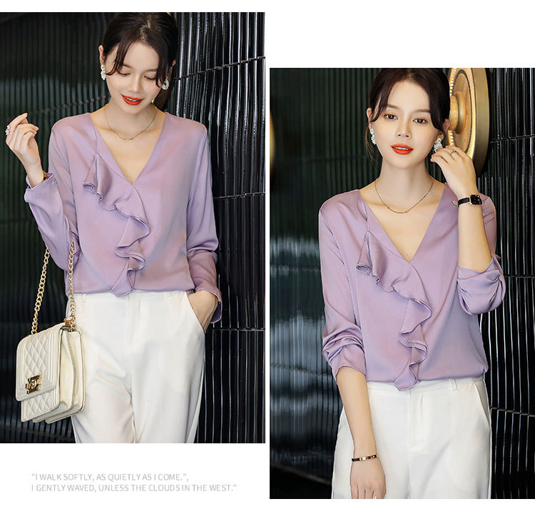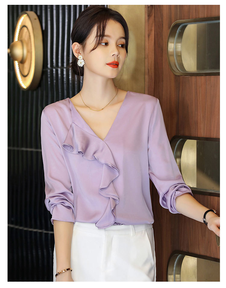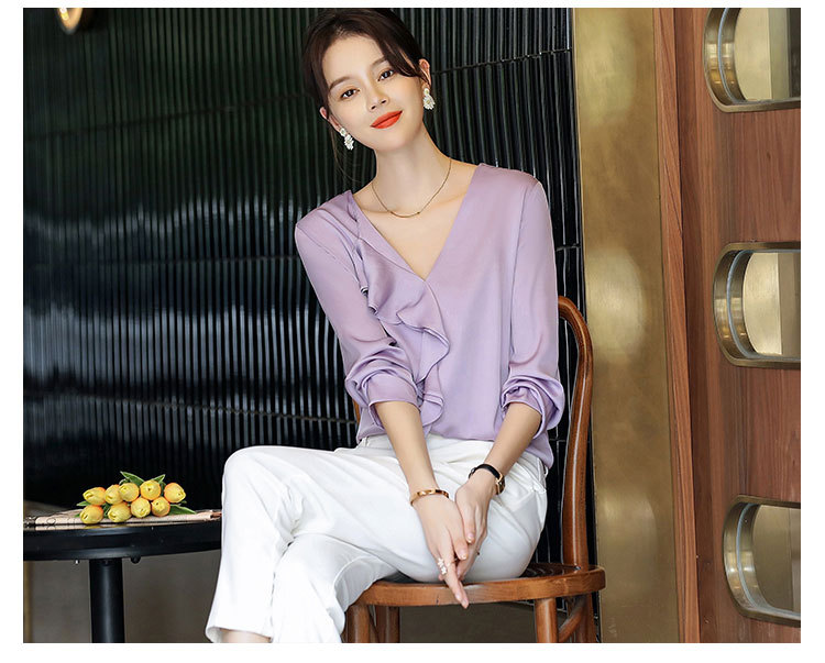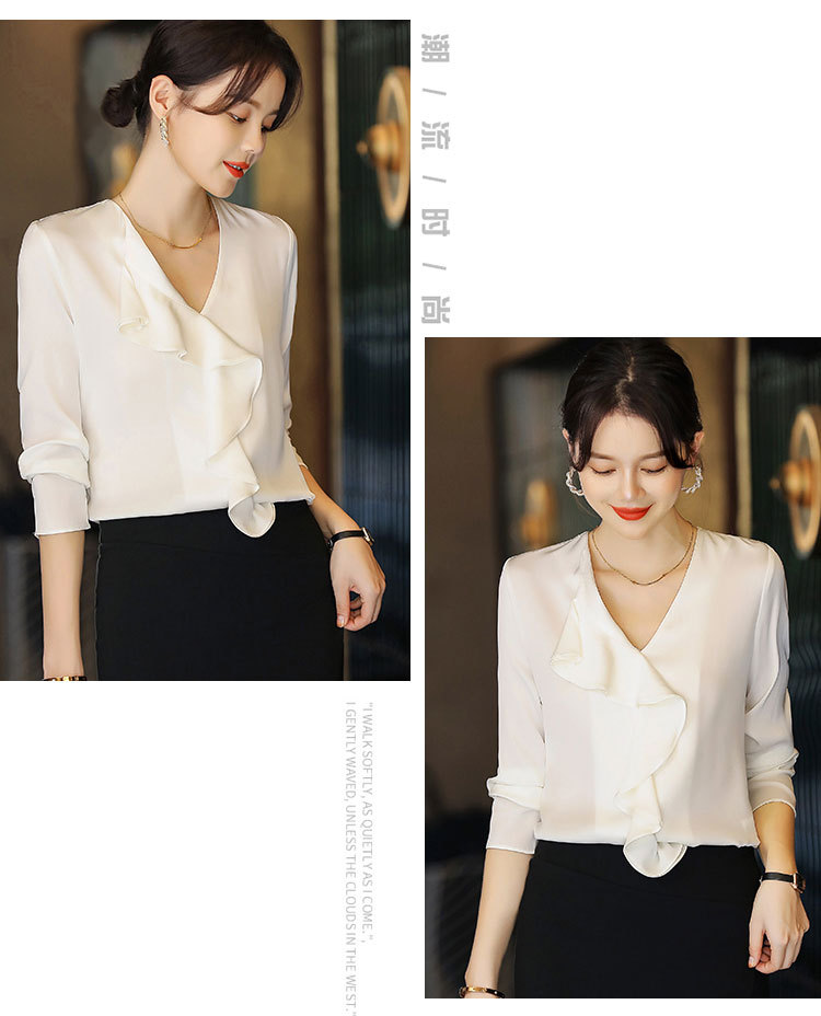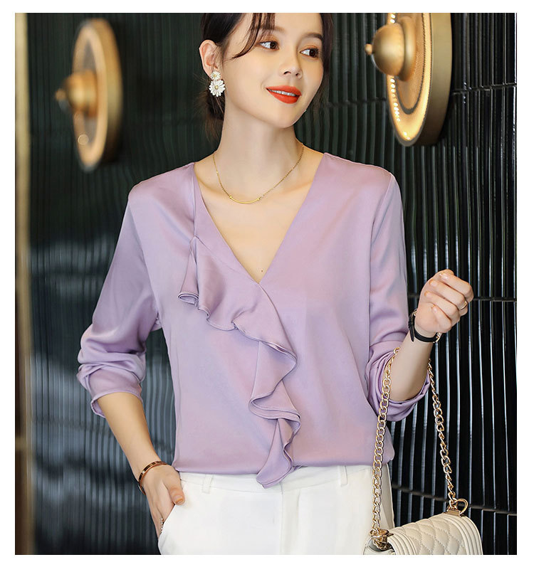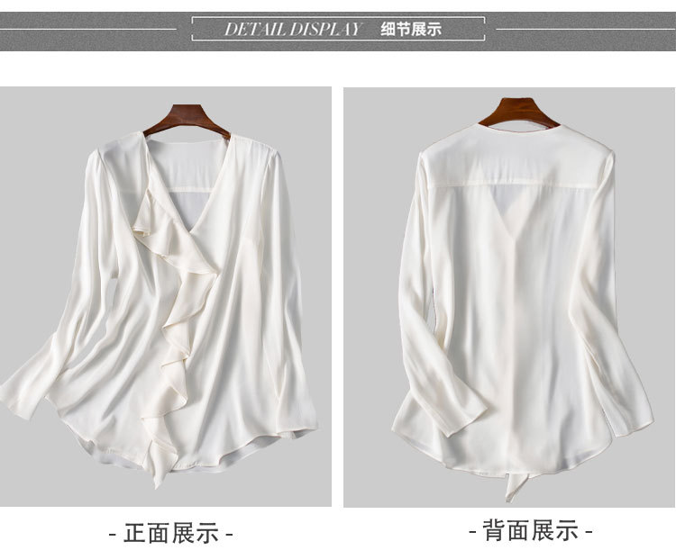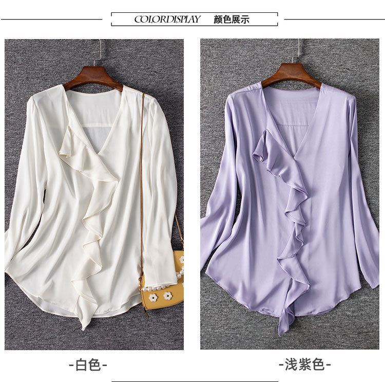 秋装新款,重磅真丝衬衣小衫上衣荷叶边v领长袖桑蚕丝衬衫LS-XZ8210