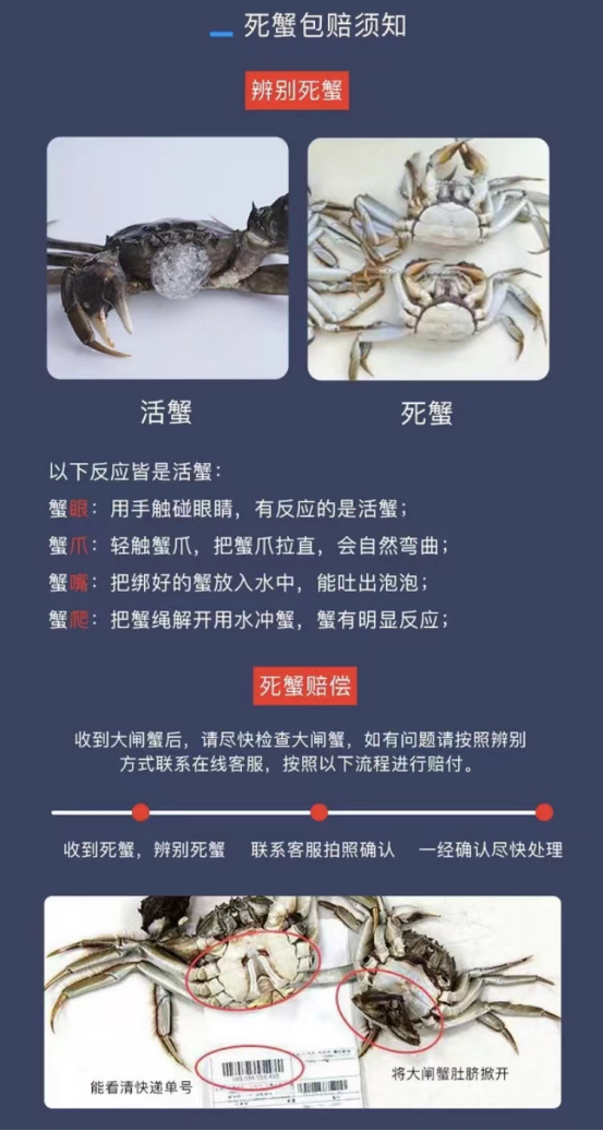 蟹卡售后相关 1,蟹卡支持7天无理由退货,退卡需客服核验后,客户录制剪卡视频,扣除5元/张的工本费,退货5张以上蟹卡需寄回,退回蟹卡需包装卡套完好,需保证蟹卡提货密码涂层均未刮开,不影响二次销售 2,收到后如有少发错发的情况,请在签收24小时内提供实收产品照片+快递面单照片联系客服处理 3,蟹卡发出后不支持拦截撤单,修改地址(请客户下单时仔细填写收货信息) 温馨提醒:蟹卡收货后请妥善保存,防止丢失 活蟹属于生鲜产品,提蟹申请提交后,不支持7天无理由退换,不以个人主观因素为由售后,不支持拦截撤单,修改地址(请客户下单时确认收货信息无误) ①、收到后如有少发错发/质量问题的情况,请在签收24小时内提交售后+问题商品照片联系客服处理,(赔付,补发标准另附,超时不予处理,敬请理解。) ②、产品一旦发出后拒绝任何形式拒签,收到产品后当场验货,如出现问题,请签收拍照并与客服联系,我们会第一时间处理 ③、客户个人原因(收货信息有误, 派件电话无人接听, 派送无人签收等)导致货物不能正常送达不在售后范围内 大闸蟹赔付标准 1.死蟹补蟹N+1(死蟹一只补发两只, 死蟹两只补发三只, 死蟹三只补发四只, 死蟹四只补发五只) 2.死蟹过半退全款或补发整箱 3,空包蟹,超出不足重标准的蟹处理同死蟹 关于活蟹重量不够的说明 考虑到活蟹在运输途中因为水分蒸发会减少重量,发货的时候重量一般会超一些,但仍有个别会出现0.2到0.3两的水分损耗, 这个属于正常范围,敬请谅解! 例如:公蟹4.5-4.8两,我们发货的最小规格是4.5两, 除去正常水分流失0.2-0.3两,到手最低4.2两,低于这个重量的我们正常支持售后 售后时效及售后所需材料 反馈死蟹需签收24小时内同步提供快递面单,死蟹视频或者图片提报售后,无售后视频或图片或者提报超时无法处理 如我们客服没在要求时间内回复,在售后时间内,提供以上要求材料的前提下,平台可按以上标准自行处理,登记处理结果即可 空包蟹: