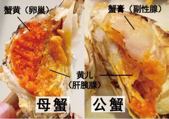 我们公蟹母蟹搭配售卖 (一般公蟹的个头要比母蟹大一点), 很多人都知道,母蟹主要吃蟹黄,公蟹主要吃蟹膏。 母蟹蟹黄橙红诱人,块块凝脂,鲜中带甜;公蟹黄肥膏白,晶莹黏腻,口感丰腴圆润。 发货时公蟹母蟹各一半,既能够品尝到蟹黄的细腻甜美,又能品尝到蟹膏的细腻黏滑。