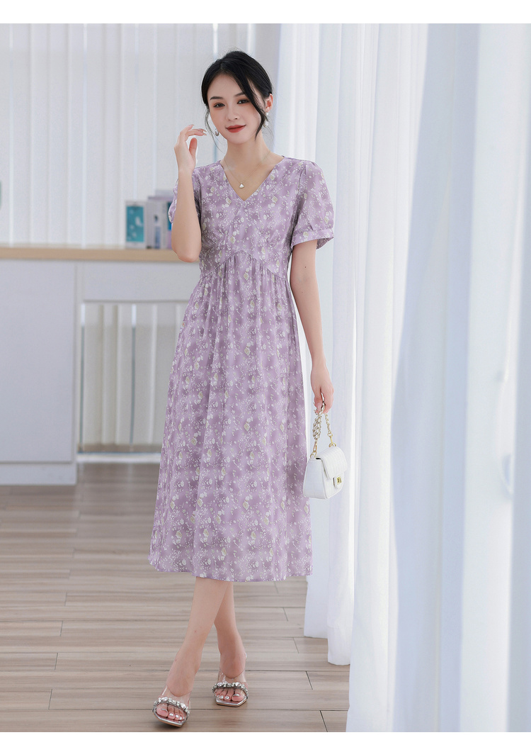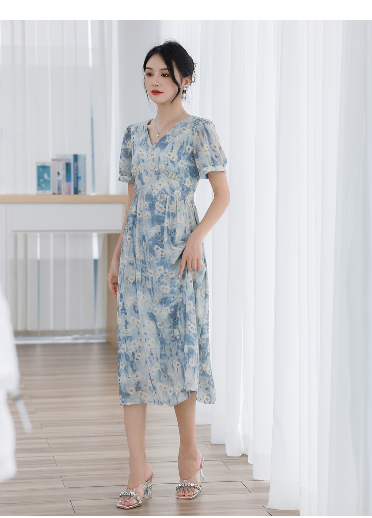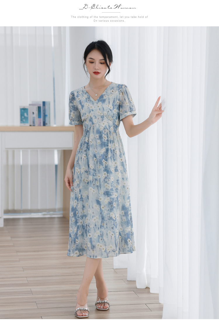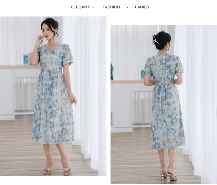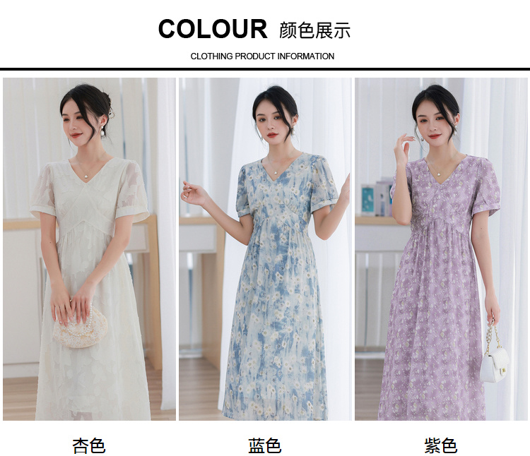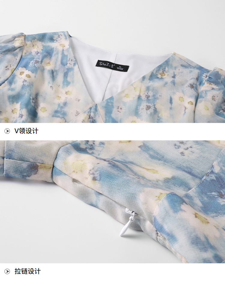 奢姿2025法式V领温柔风连衣裙女夏大码显瘦遮肚子雪纺裙气质长裙9932828184