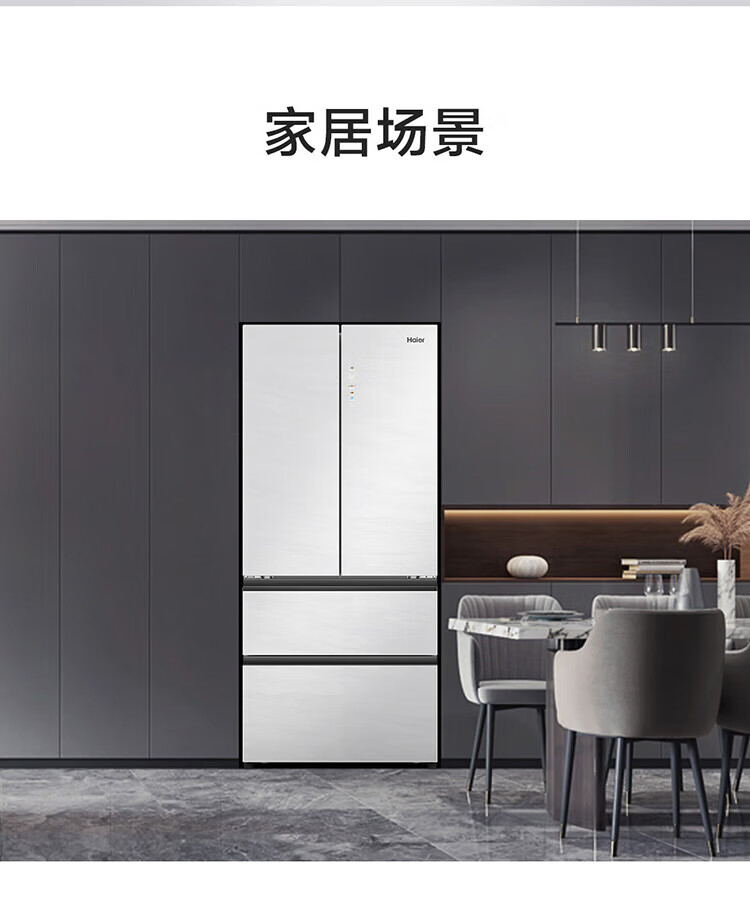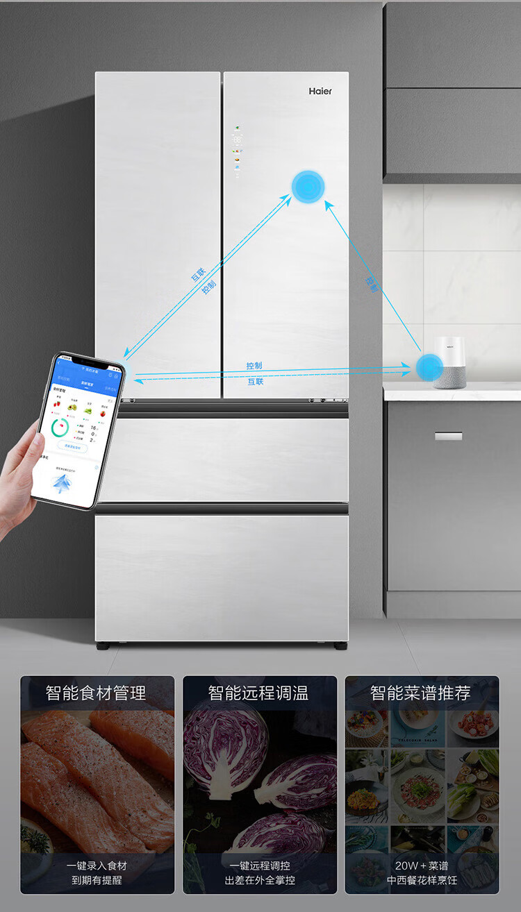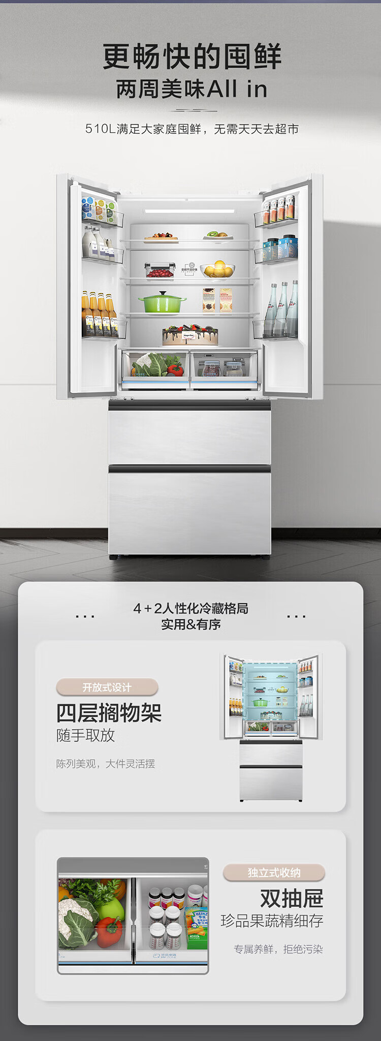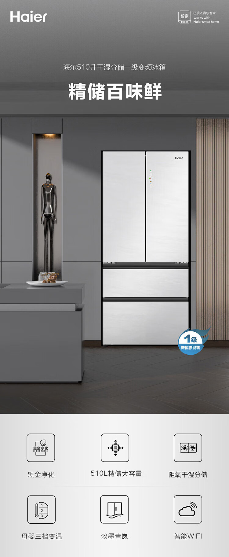 海尔冰箱大容量法式多门家用超薄净味彩晶面板变频节能新一级能效电冰箱BCD-510WGHFD5DGQU1[家电]