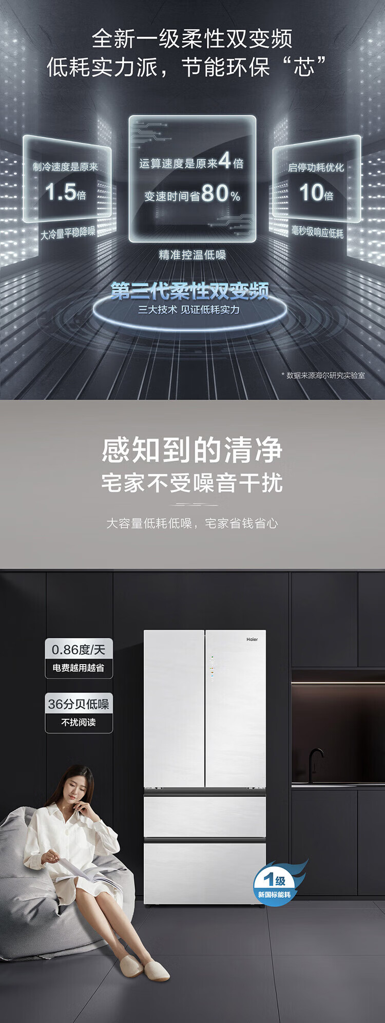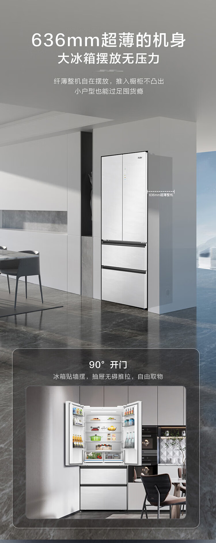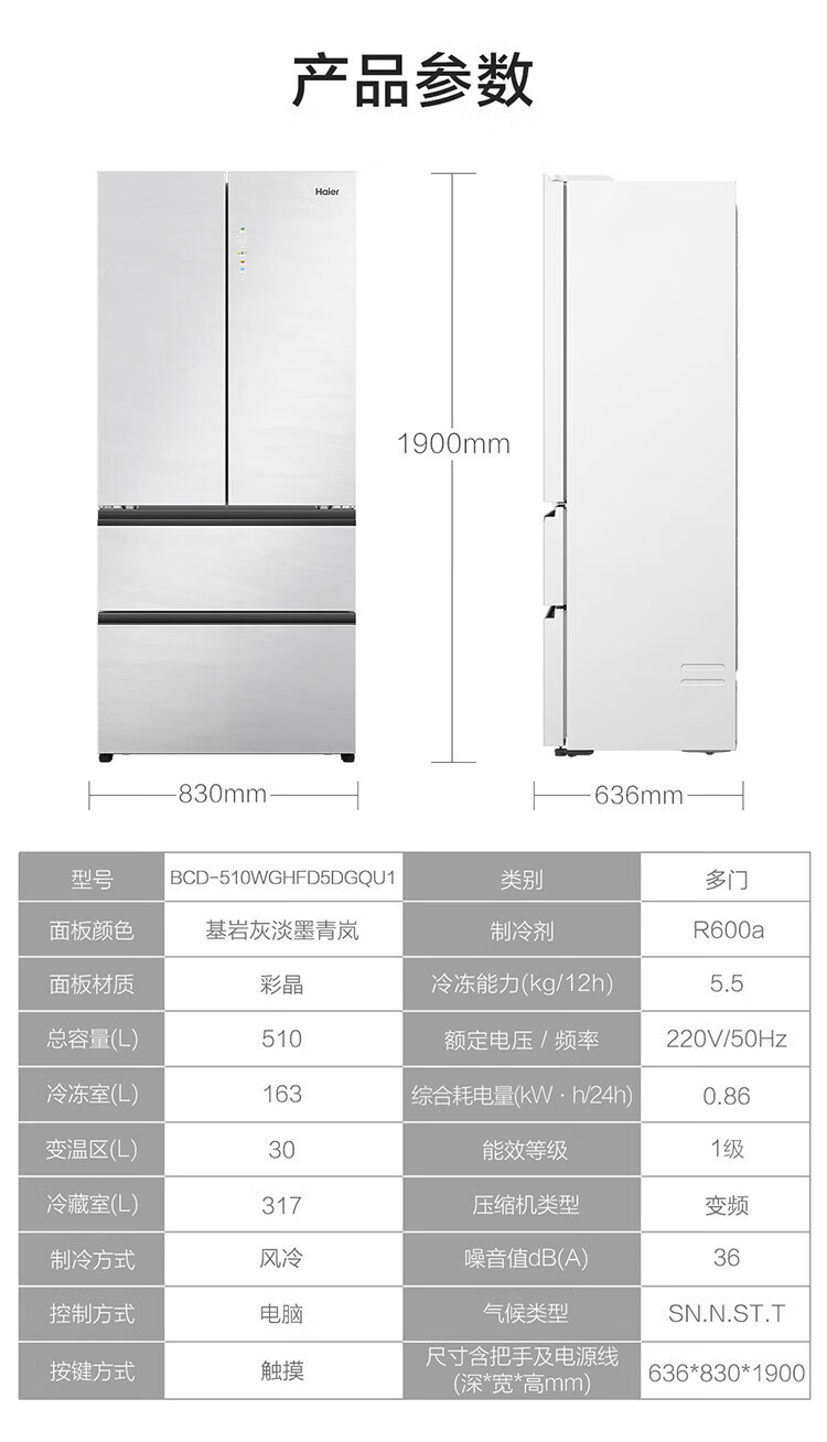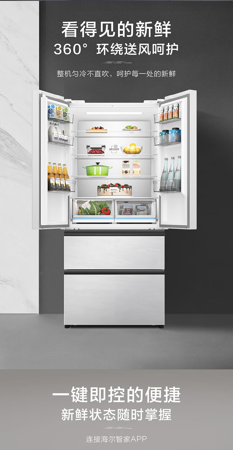海尔冰箱大容量法式多门家用超薄净味彩晶面板变频节能新一级能效电冰箱BCD-510WGHFD5DGQU1[家电]