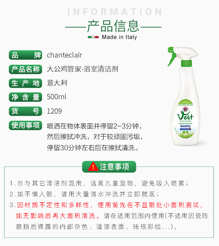 【一般贸易】意大利大公鸡管家 浴室清洁剂500ml*2瓶