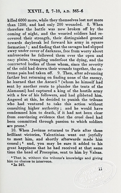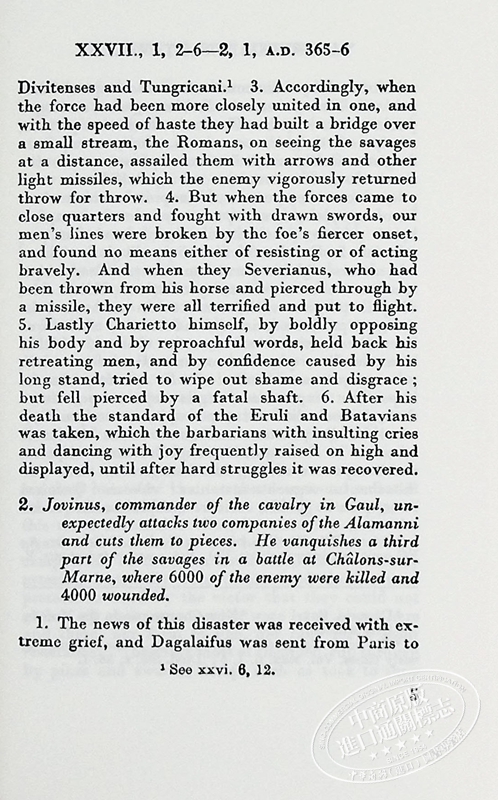 马塞利努斯(Ammianus Marcellinus),约325-约395年,安提阿的希腊人,年轻时加入军队,在总督乌尔西奇努斯和东方皇帝Ursicinus二世手下服役,后来在Julian皇帝手下服役,他很欣赏Julian,并随他一起对付阿拉曼尼人和波斯人。他后来在罗马定居,在那里用拉丁文写了一部公元96-378年期间的罗马帝国史,名为Rerum Gestarum Libri XXXI。在这31本书中,只有14-31(公元353-378年)幸存下来,这是对他自己的时代的一个非常准确和公正的记录。虽然他是士兵,但他包括经济和社会事务。他对非罗马人有宽广的胸怀。我们从他那里得到了关于罗马帝国灭亡原因的明确指示。他的风格表明,他的散文是用来背诵的。