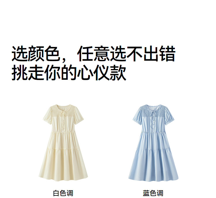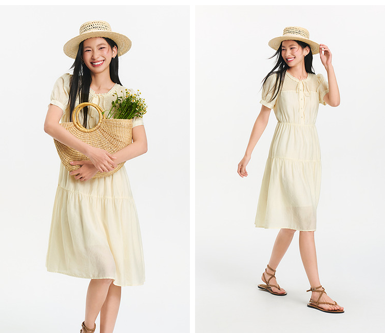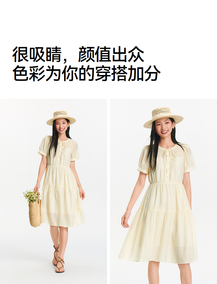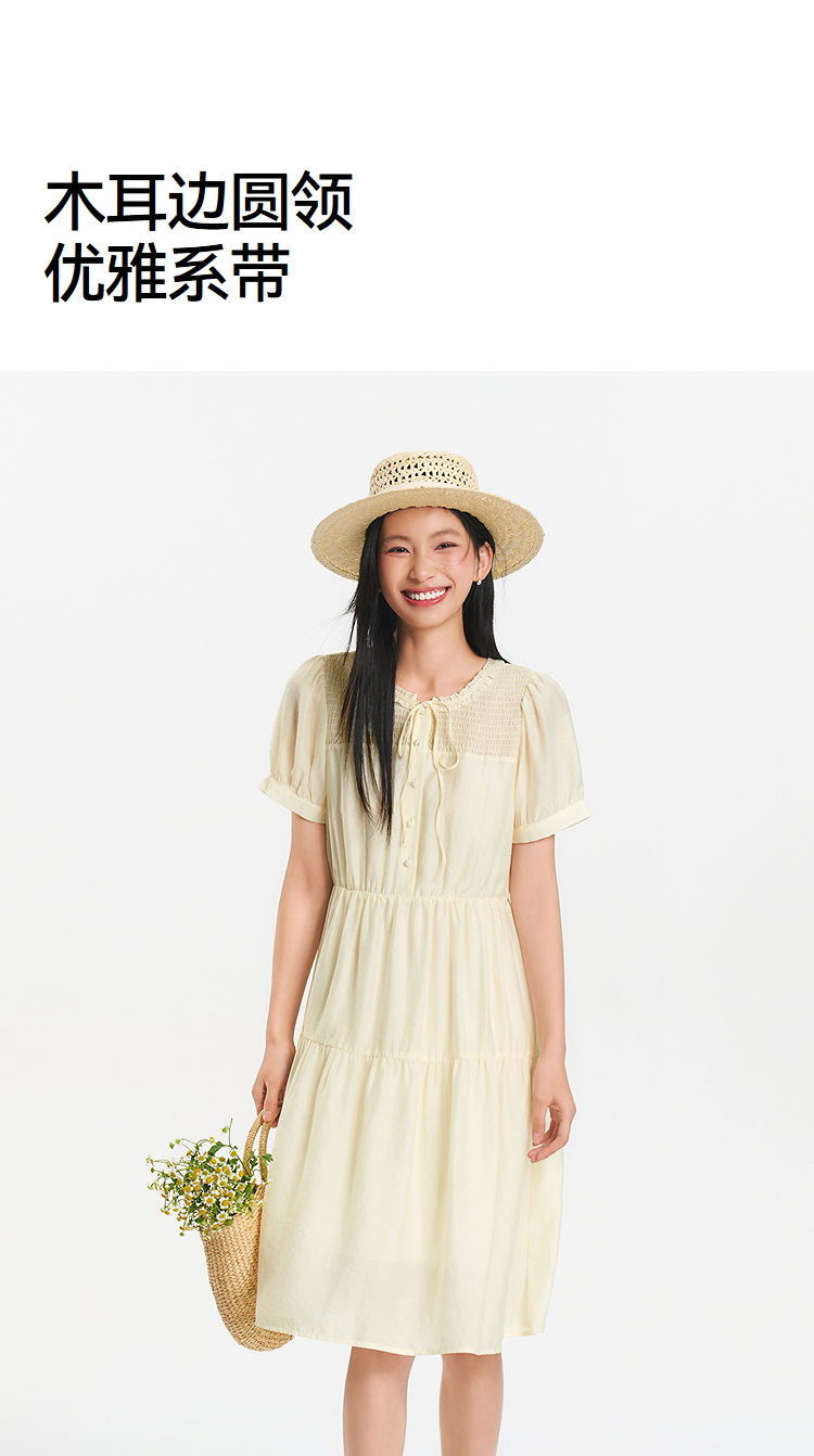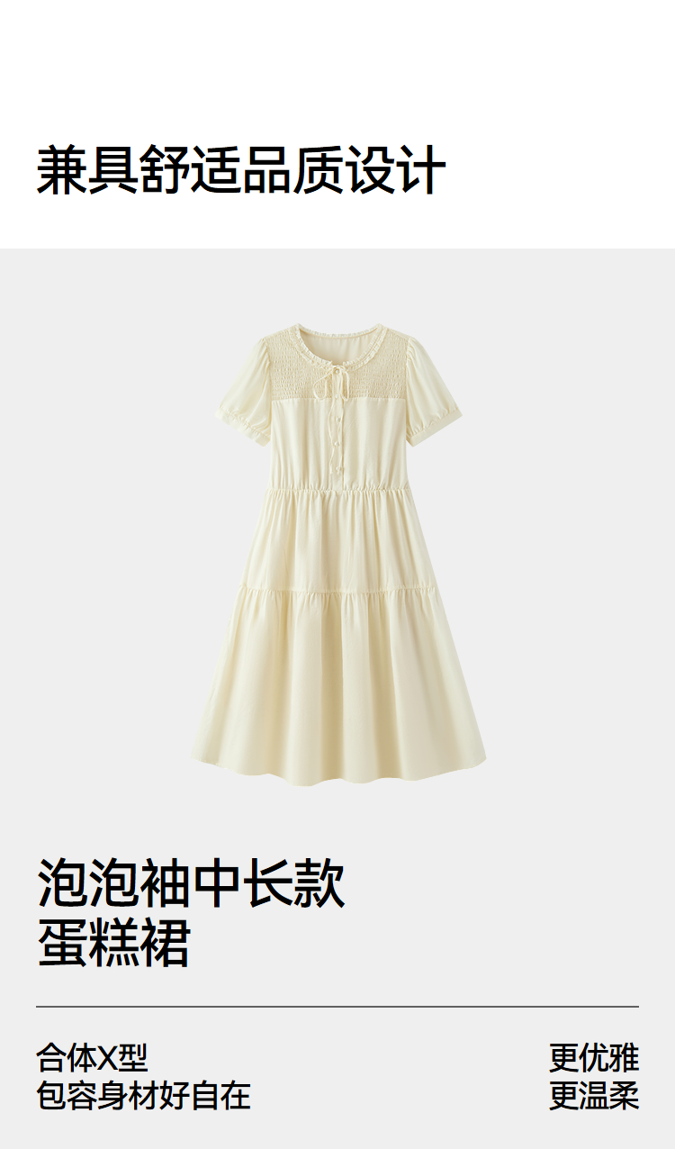 森马连衣裙女夏泡泡袖花边圆领肌理中长裙气质温柔优雅法式蛋糕裙