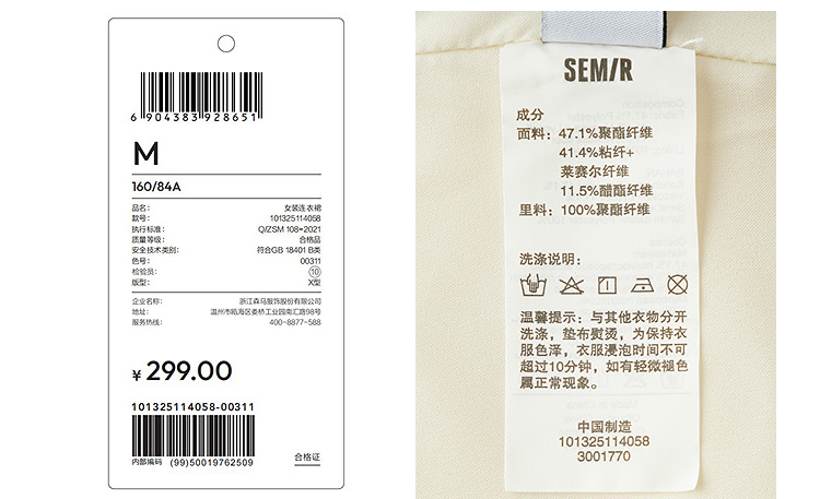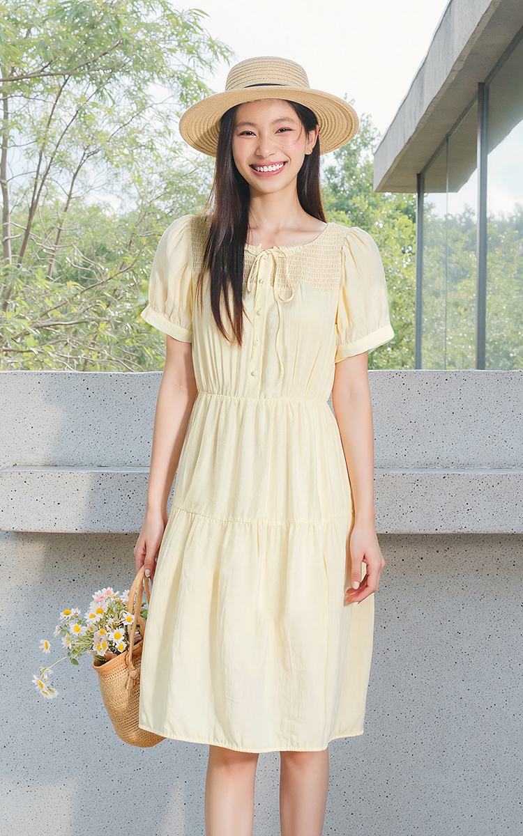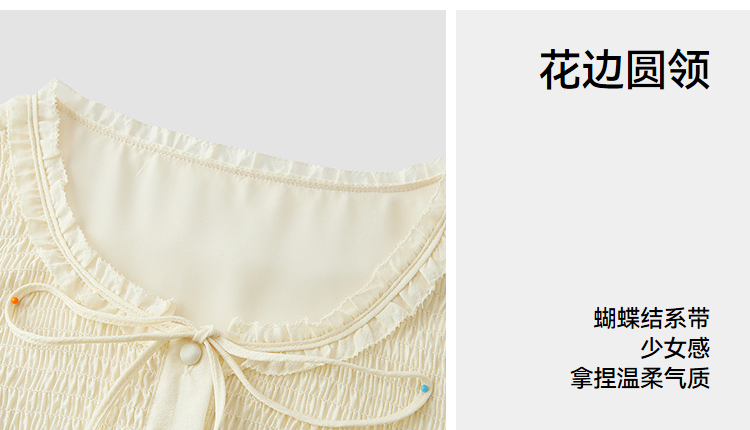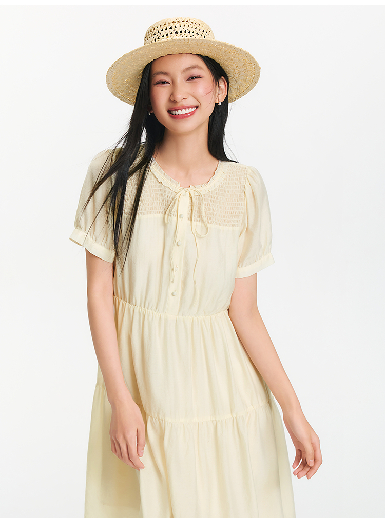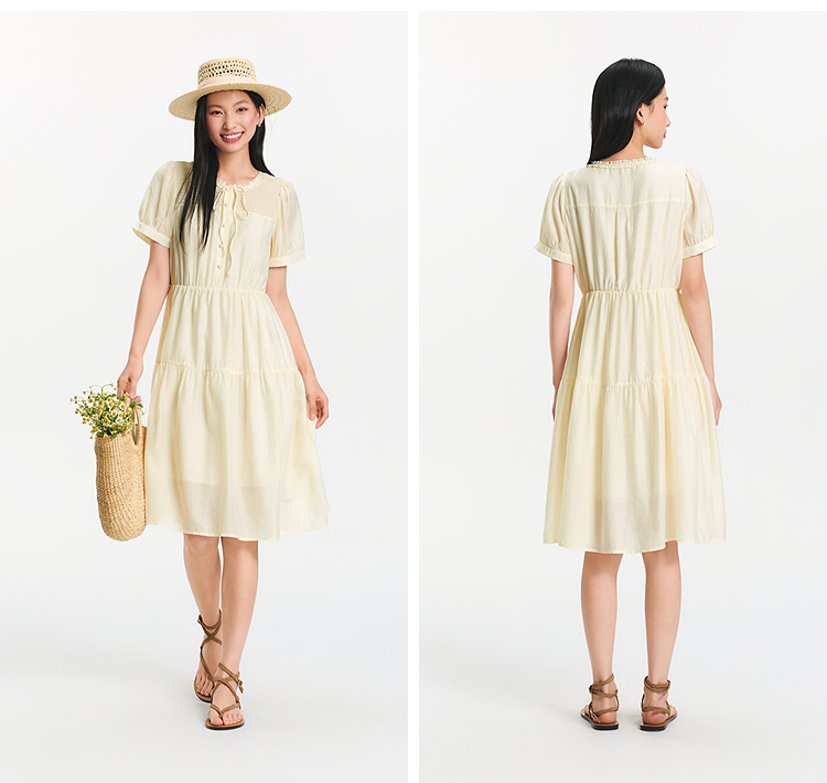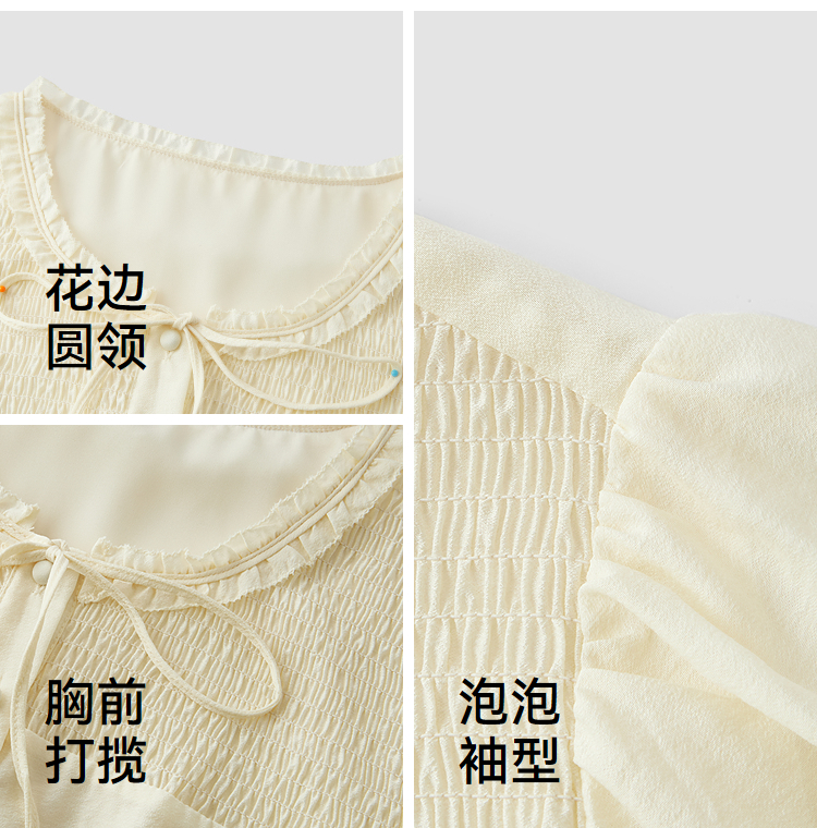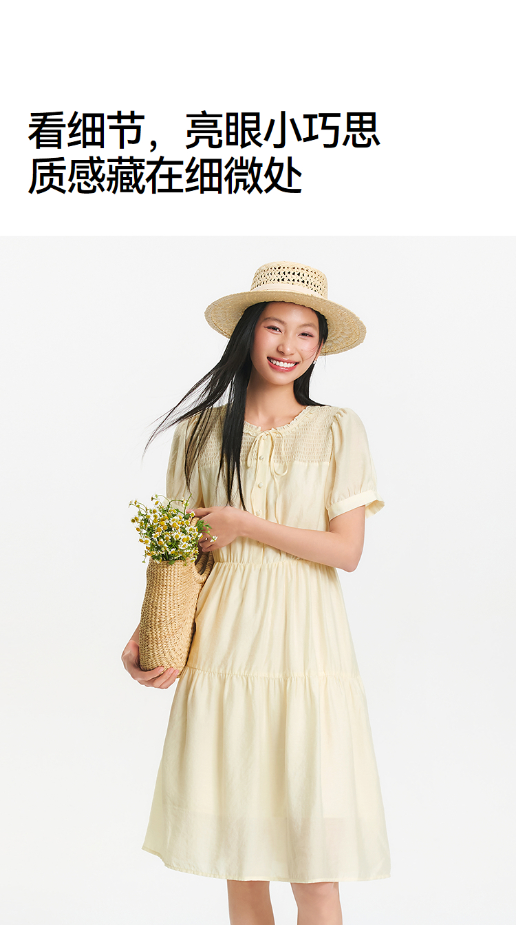 森马连衣裙女夏泡泡袖花边圆领肌理中长裙气质温柔优雅法式蛋糕裙