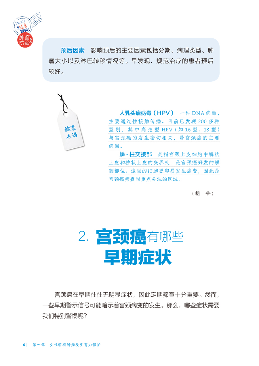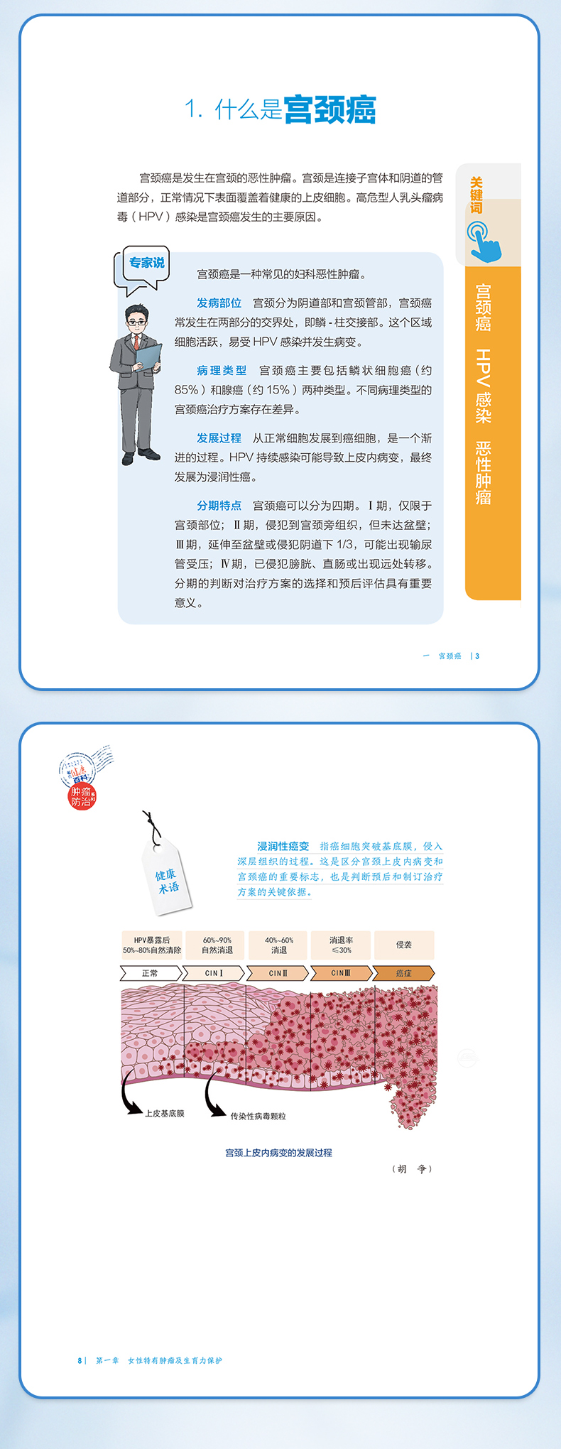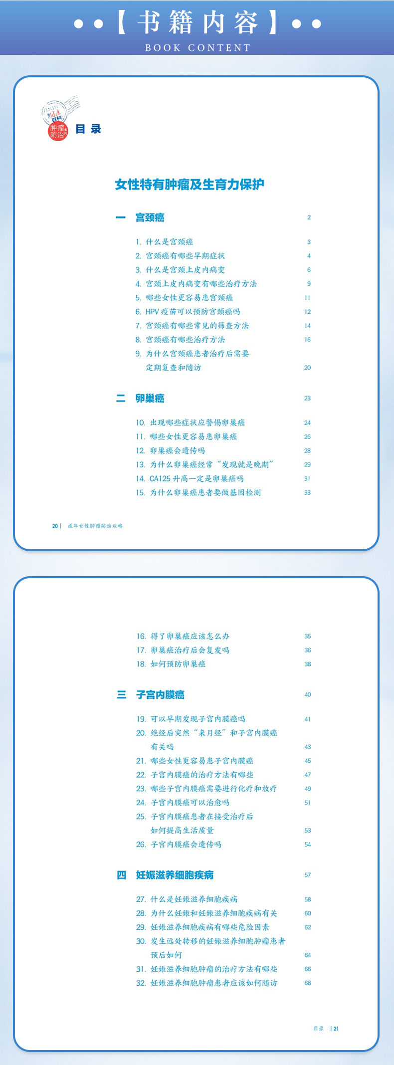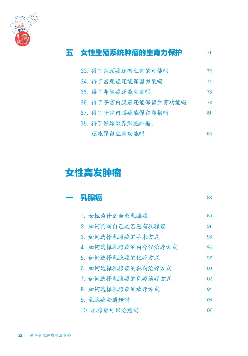 成年女性肿瘤防治分册包括四部分,分别是女性特有肿瘤及生育力保护(宫颈癌、卵巢癌、子宫内膜癌、滋养细胞肿瘤)、女性高发肿瘤(乳腺癌、肺癌、甲状腺癌、结直肠癌)、女性其他常见肿瘤(胃癌、肝癌、胰腺肿瘤、食管癌、膀胱癌与肾癌)、化疗、靶向治疗及心理、精神健康管理(化疗及靶向治疗、心理、精神健康管理),从“防、筛、诊、治、康”5个方面向读者讲述相关知识。倡导成年女性要重视自身身体状况,保持健康生活方式,帮助该人群实现肿瘤的早筛、早诊、早治,并向女性肿瘤患者传递战胜肿瘤的信念。在内容撰写上,会特别考虑老年女性与中青年女性在治疗及康复等方面的不同之处,以给读者有针对性的知识输出。