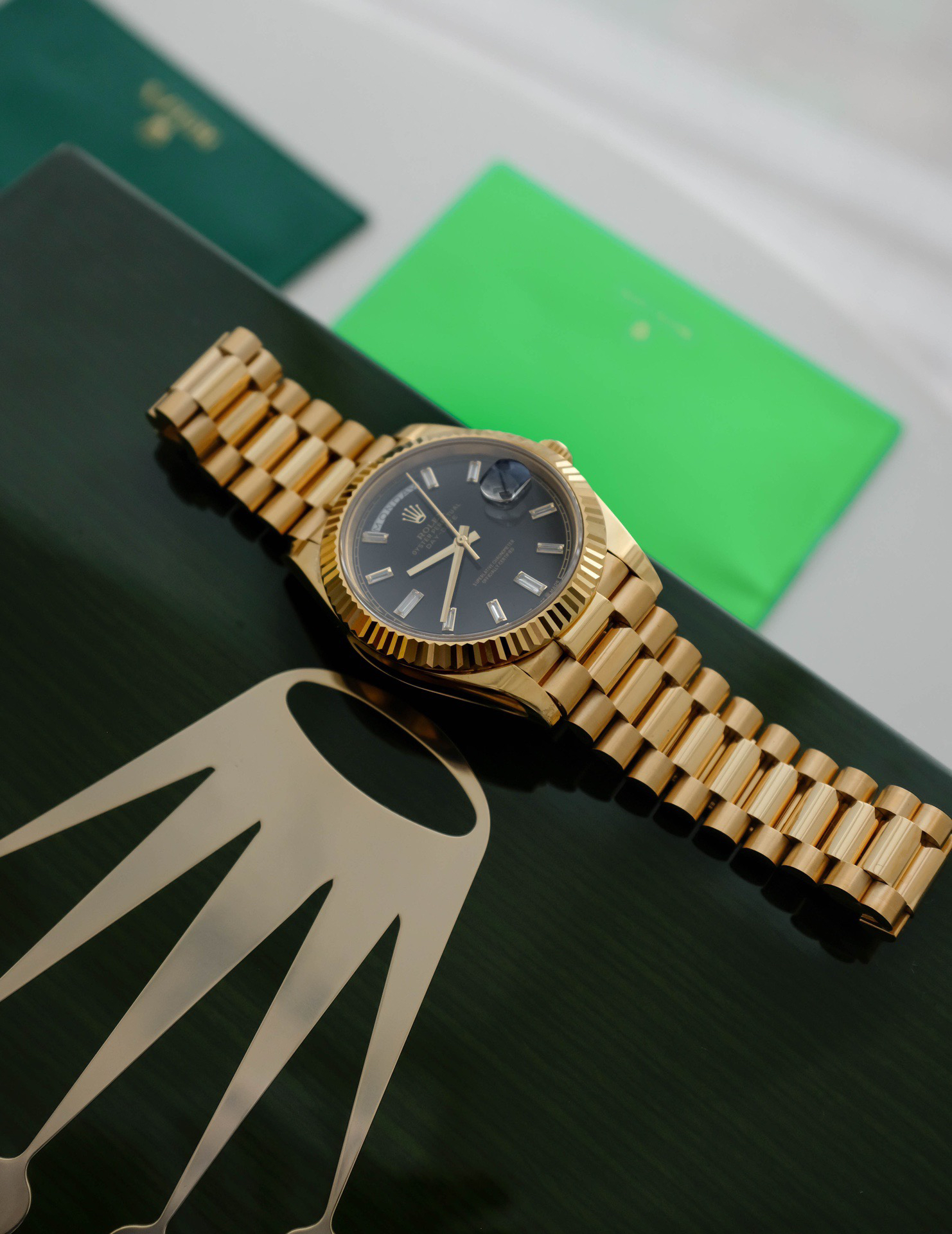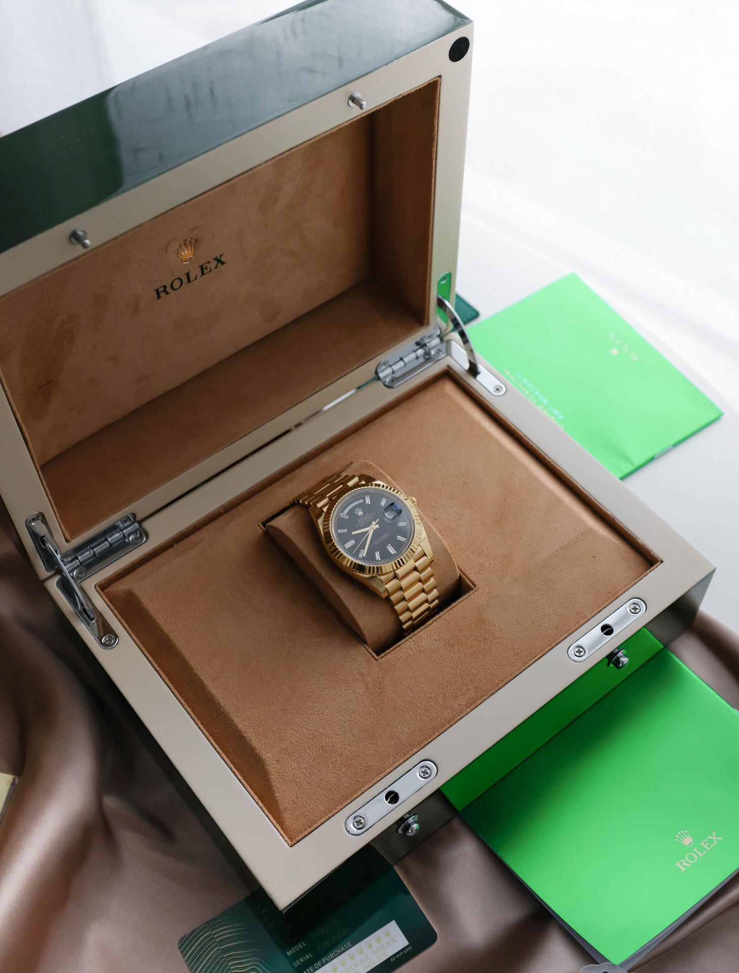 NOOB Factory新力作V2升级版 劳力士Rolex星期日志型40mm 搭载原版3255自动机械机芯228239系列腕表,40毫米直径,研发耗时16个月!原版1比1开模。重点升级了以下几个要点:1.表壳直径与2019最新版3255型系列一致40毫米。2.表带头粒与原装一致,5件拼装,难度非常高,表带与表壳交错型无缝连结。3.把头皇冠处下方修改为与原版一致的两个圆点。4.表扣与原版一致里面加装了弹簧,字体大小工艺和原装一致。5.表壳侧面与原版一致增加二维码防伪、底盖有验货二维码。6.表壳与表带连接处的壳身刻有与原版一致的型号数字228239。7.表的内影圈刻上了与保修卡一致的产品流水数字,而且做到了正品一致的一表一卡一码 绝不重复)8.附全套原版套装配置包括(保修卡,说明书,型号条型码与正品一致)全套包装与正品一致(市面上真正的原装一比一星期日历型)