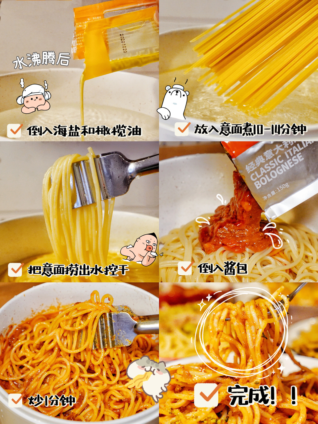 2.意面煮好,捞起,平底锅加入意面和酱包,一起翻炒一分钟即可。