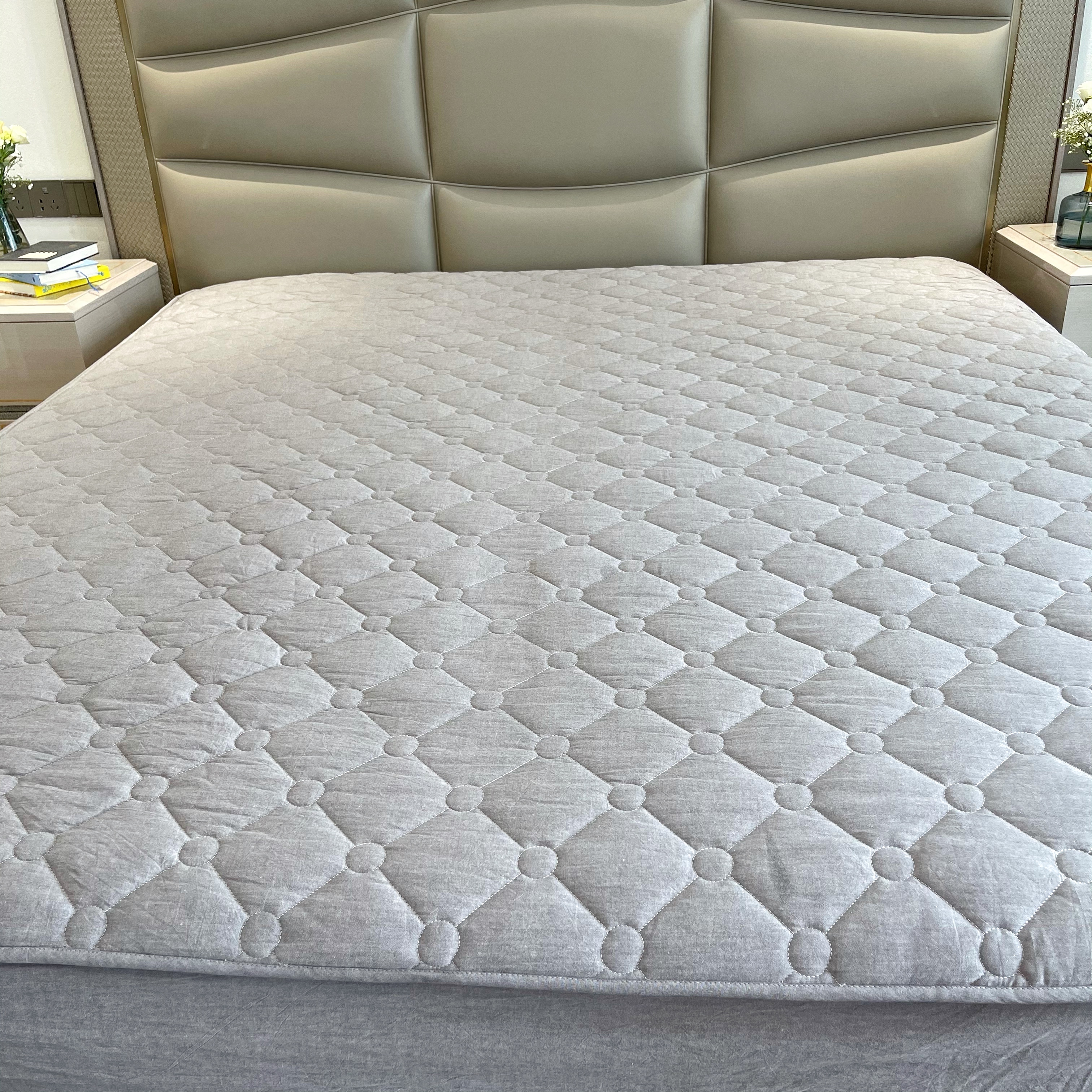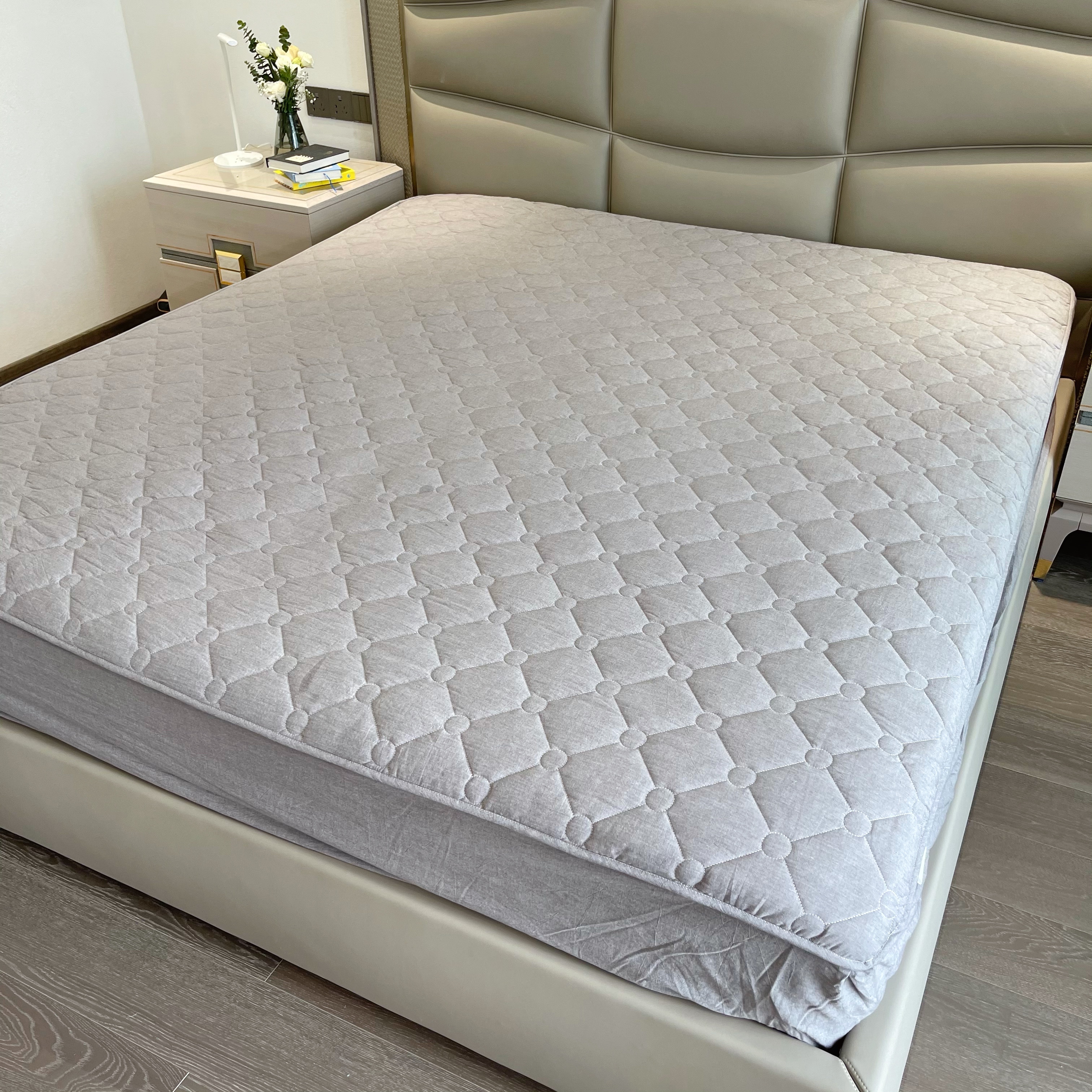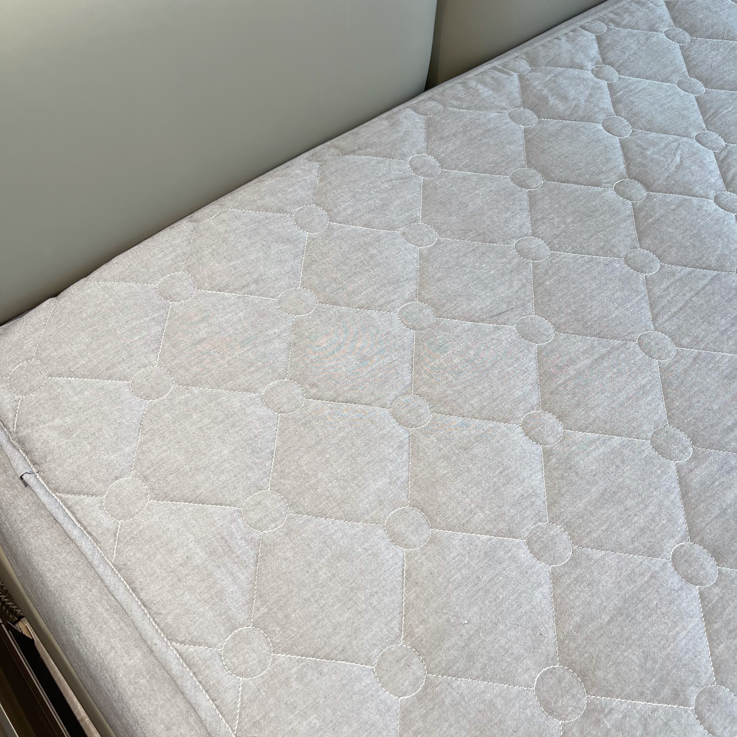 这款是水洗棉,摸起来的质感就是有麻料的质地,床笠是非常重要的存在,很多人可能会拿褥子垫,但是很容易走位,导致床单很滑;床笠还可以保护床垫,家里有小孩的更需要床笠了,清洗起来比较方便,毕竟床笠可以清洗,床垫就只能靠吸了。