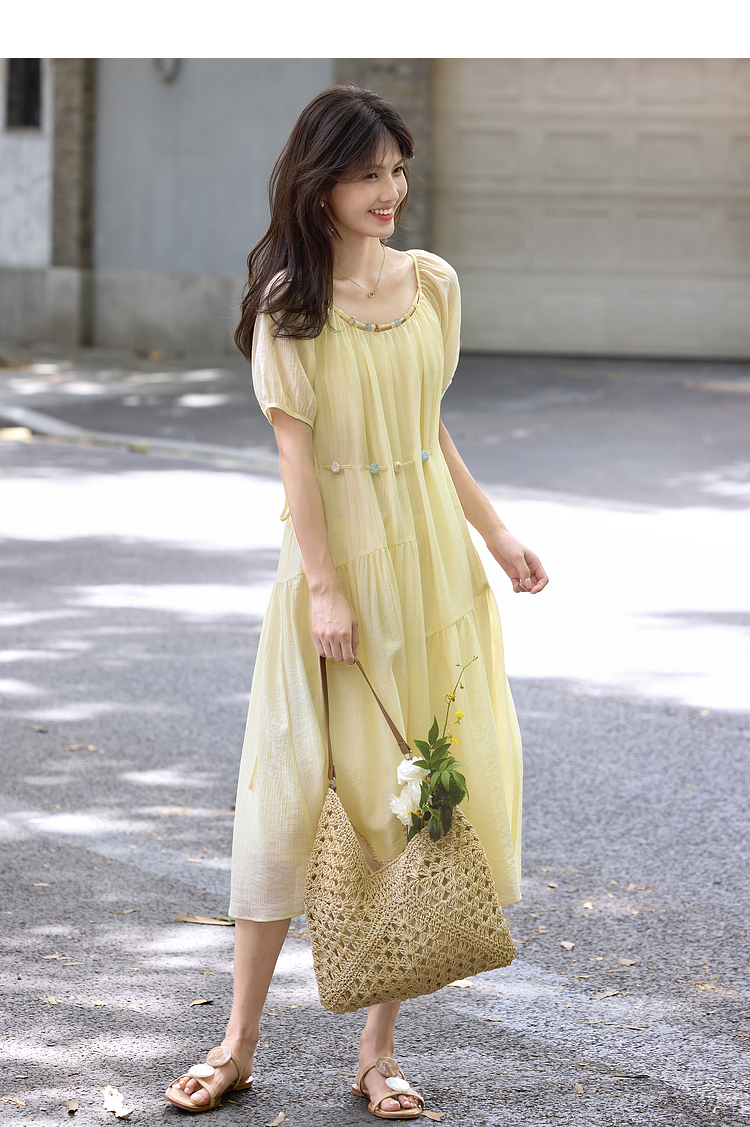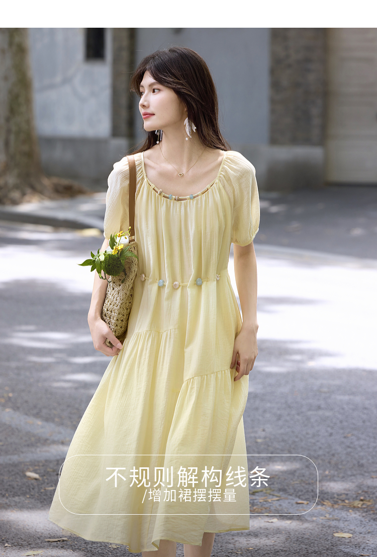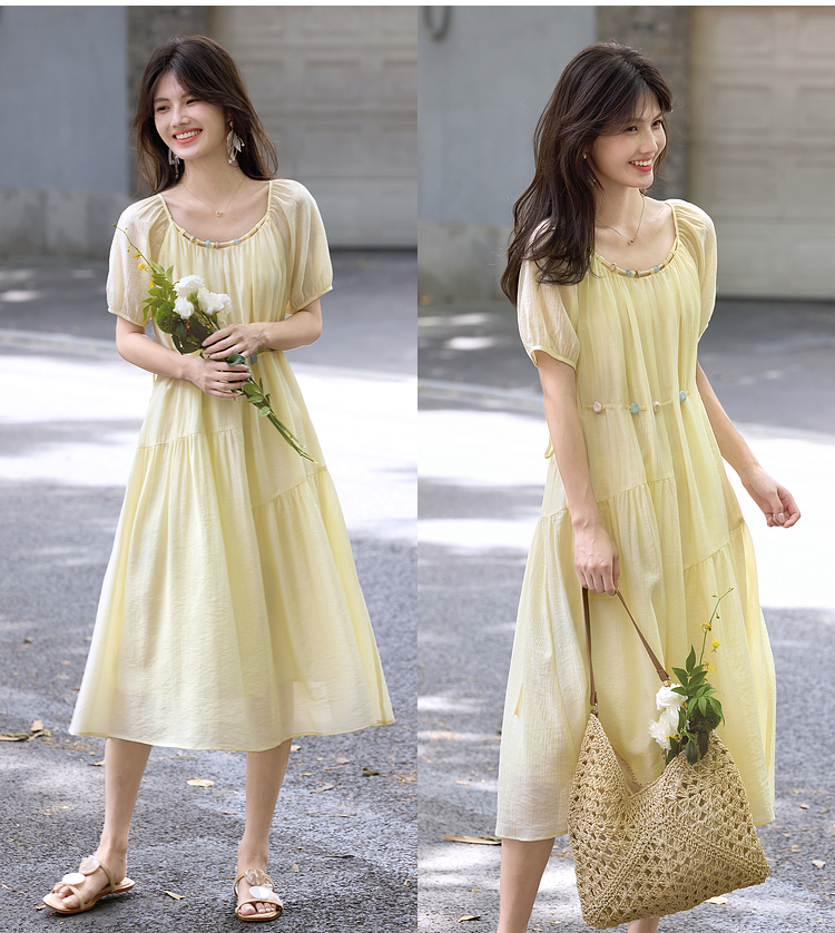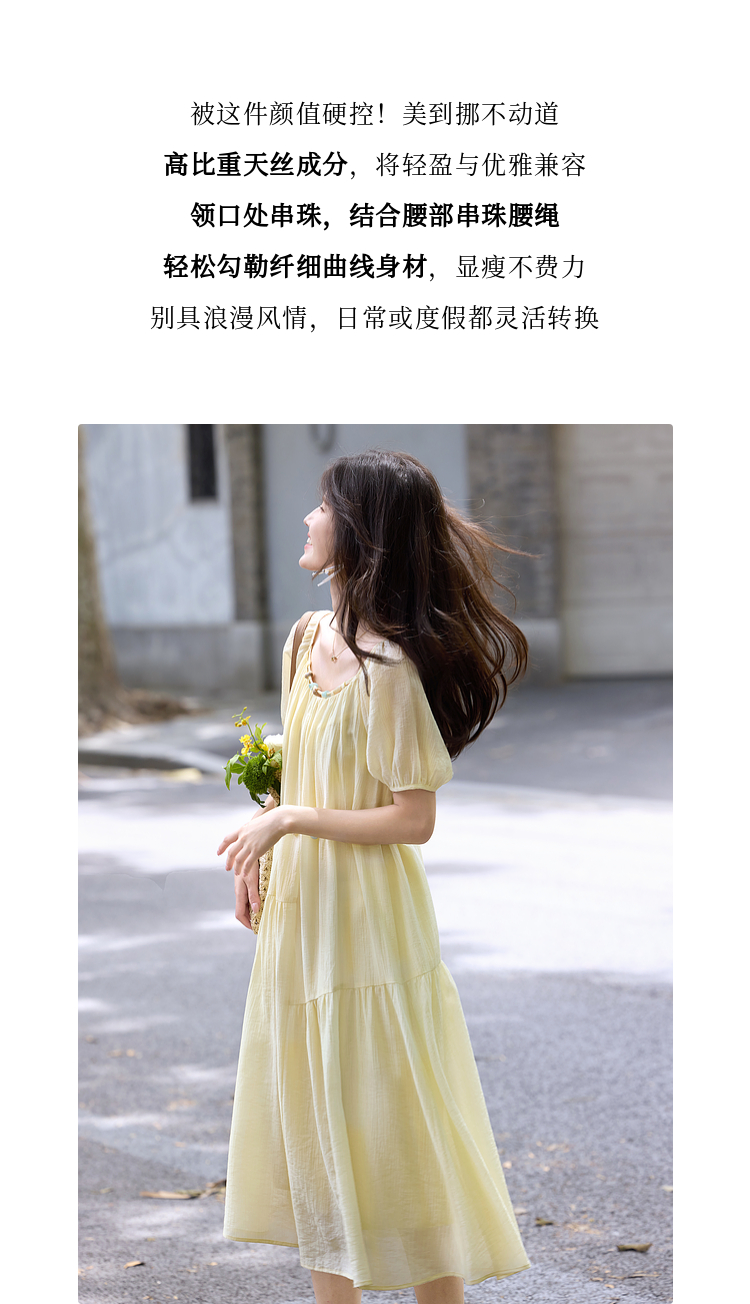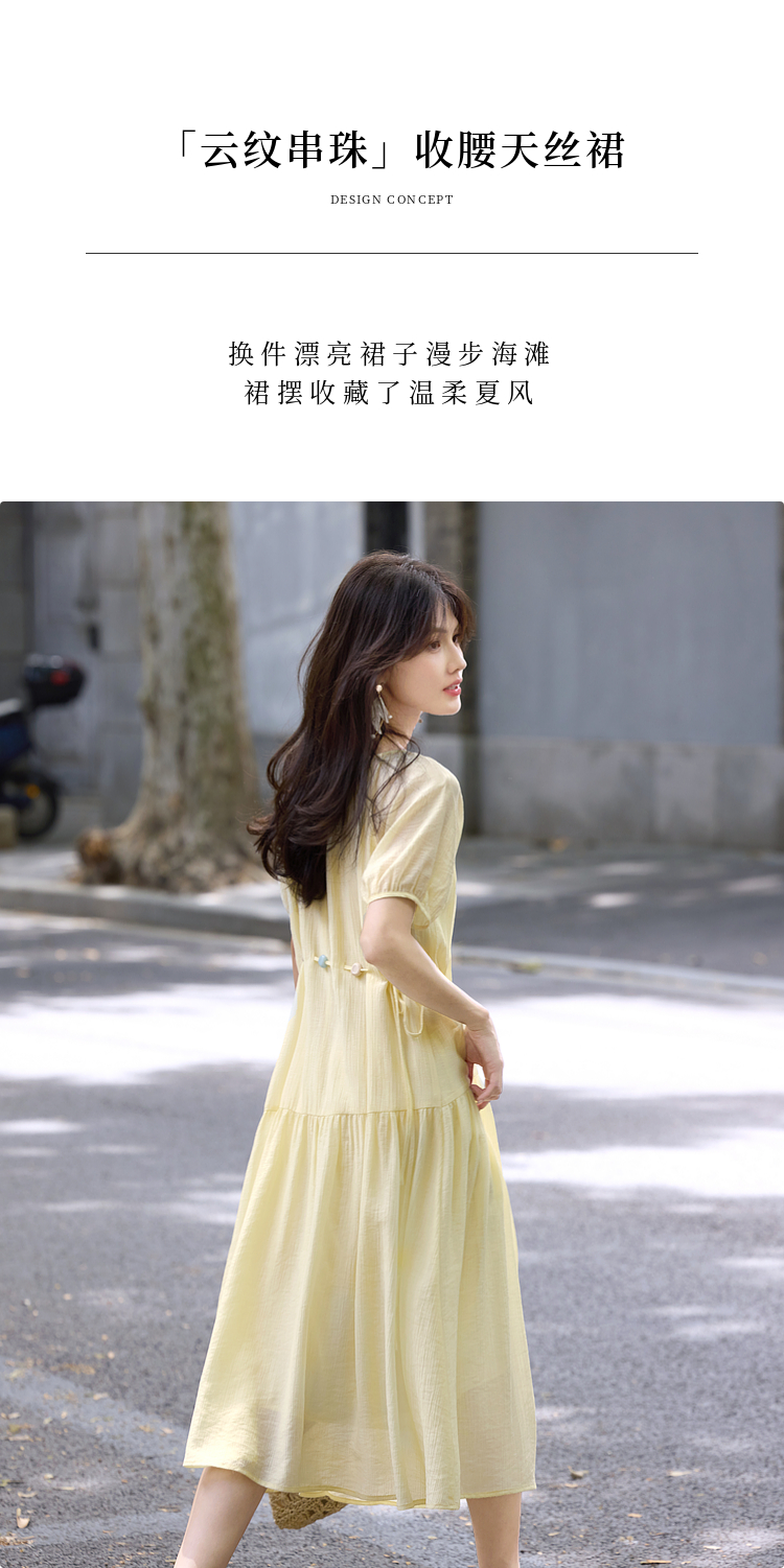 【08/06新品】熙世界欧若风串珠天丝连衣裙女夏2025新款短袖收腰莱赛尔a字裙子