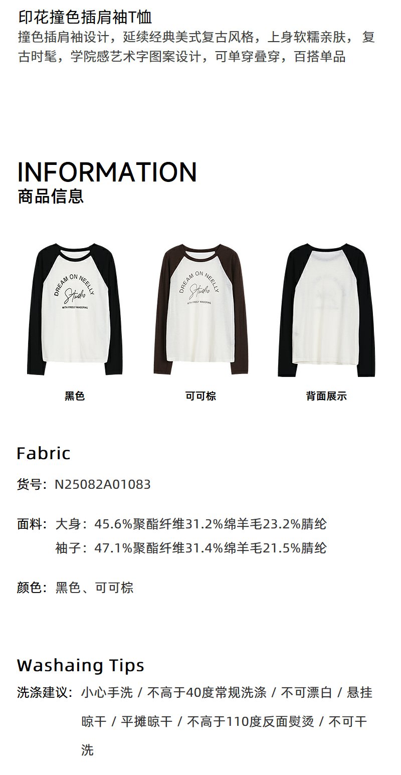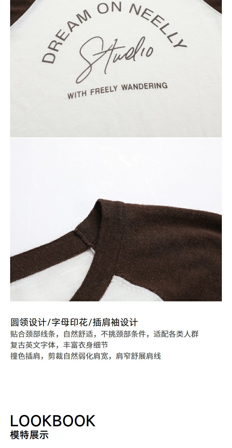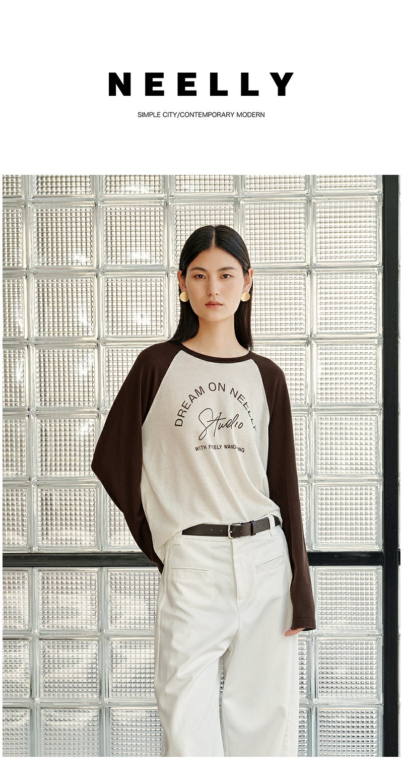 NEELLY纳俪商场同款秋季新款印花趣味撞色T恤女百搭插肩袖上衣N25082A01083