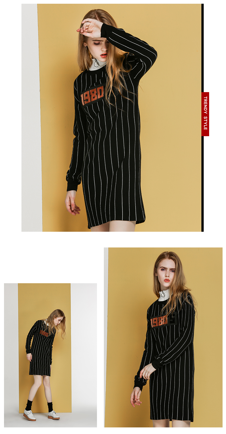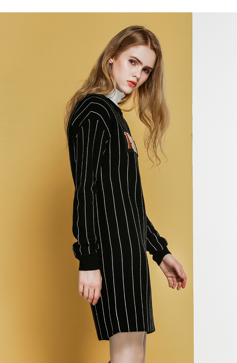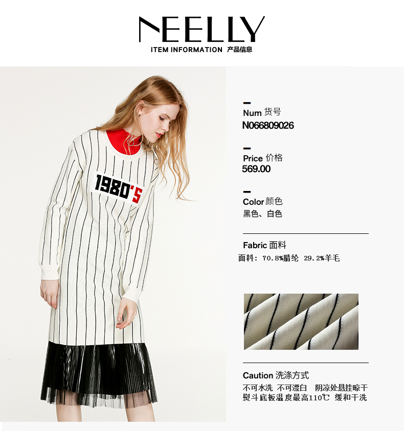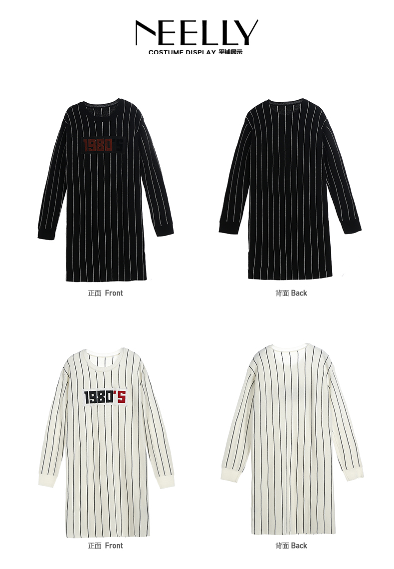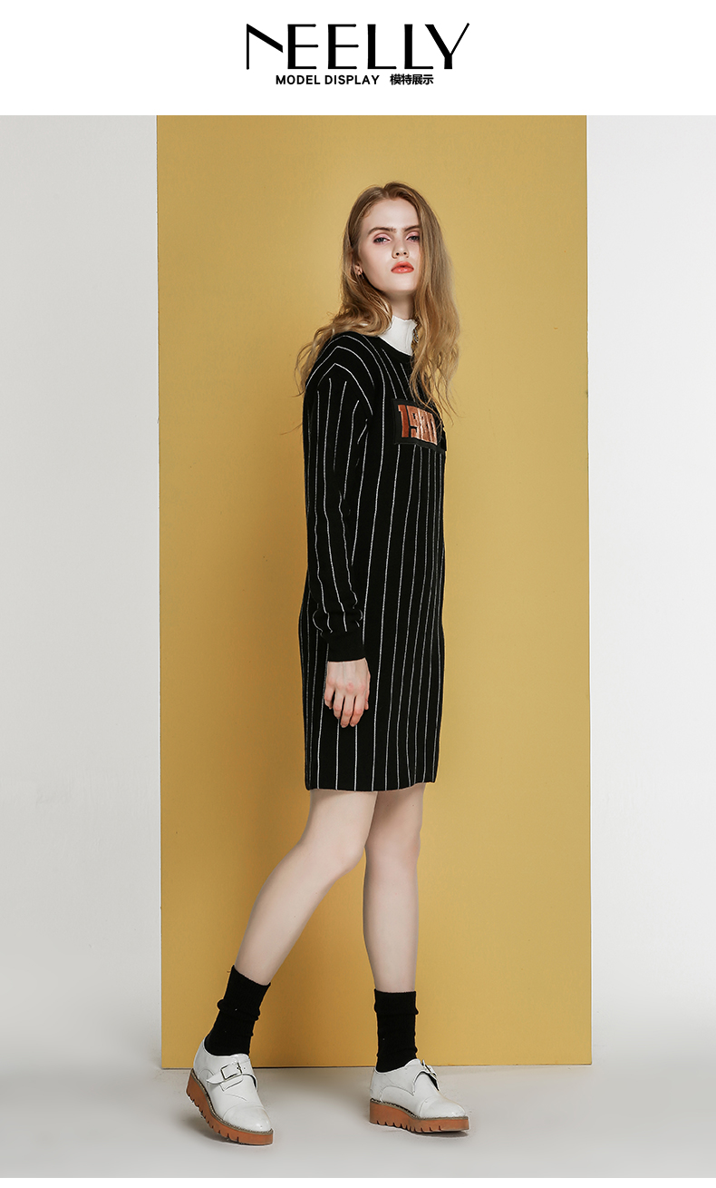 NEELLY纳俪冬装新款条纹长款裙子字母刺绣印花修身显瘦连衣裙N066809026