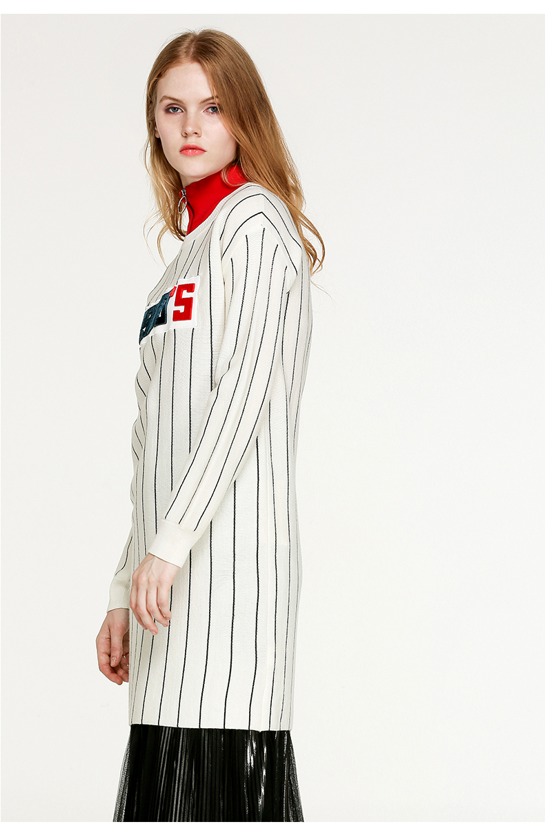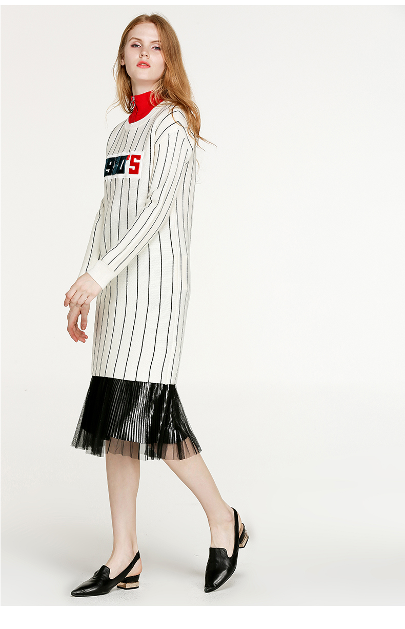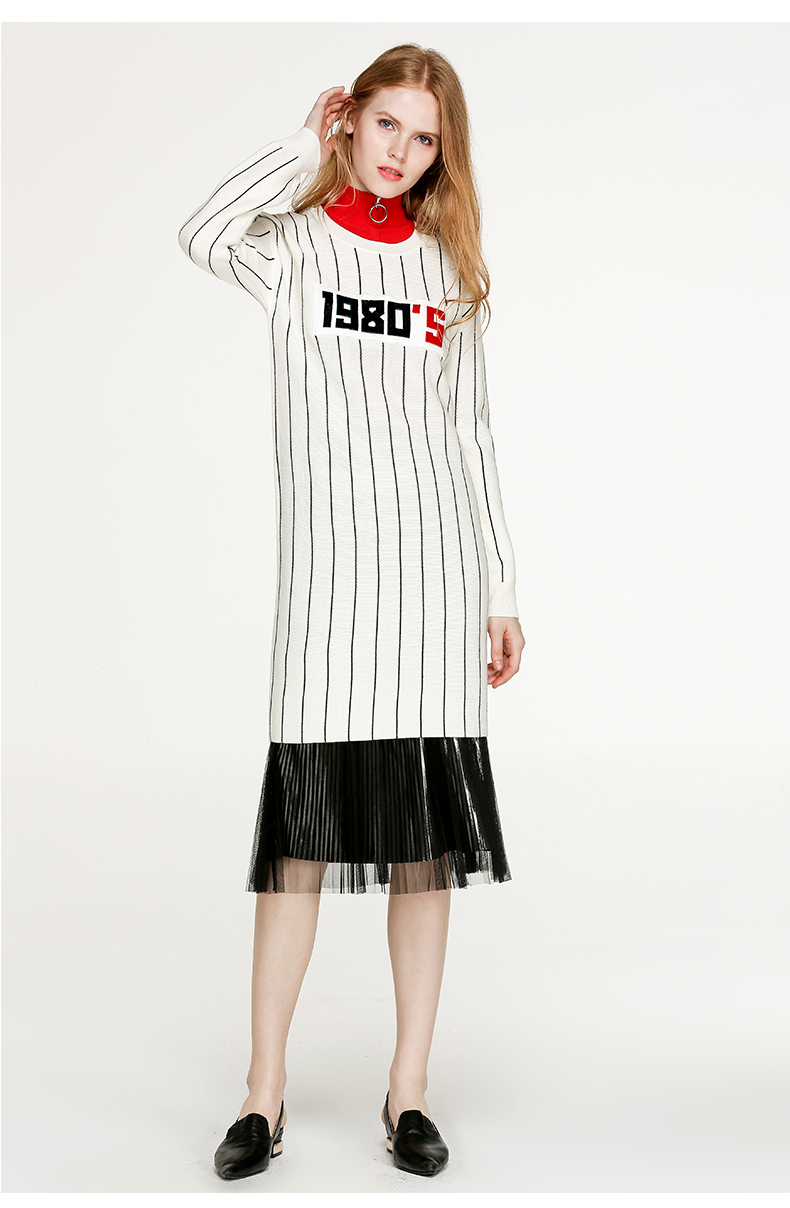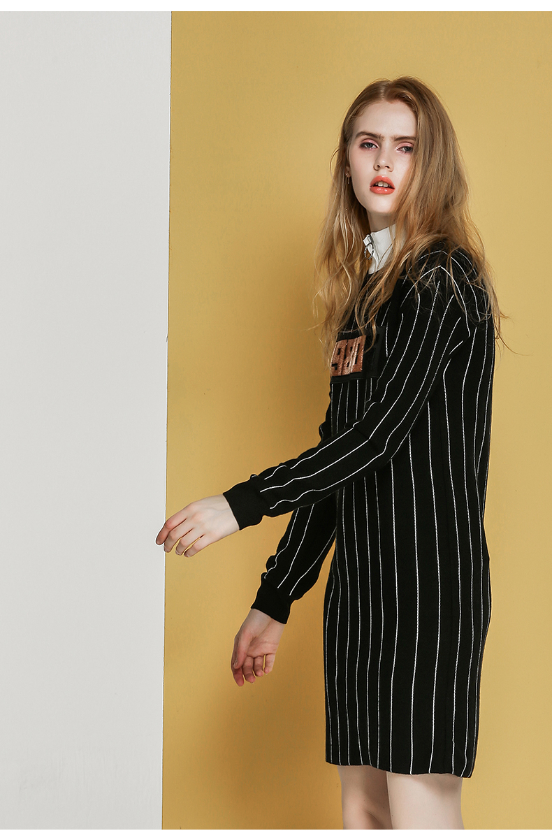 NEELLY纳俪冬装新款条纹长款裙子字母刺绣印花修身显瘦连衣裙N066809026
