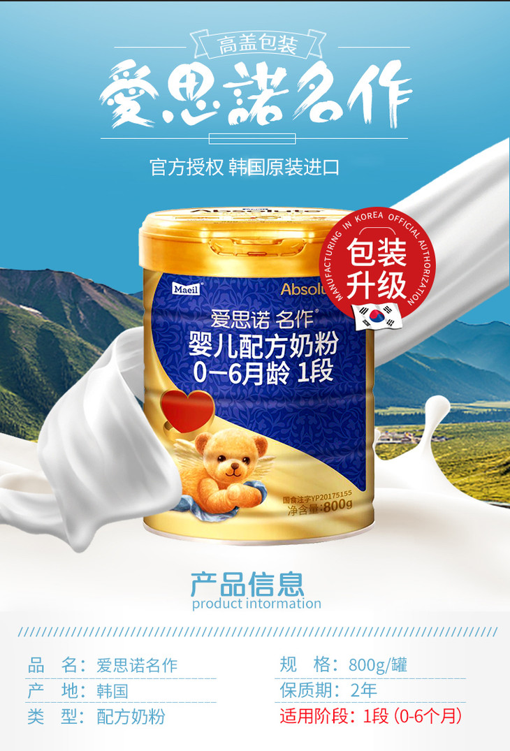 Maeil每日爱思诺金典名作韩国进0-6月婴儿配方奶粉1段800g罐装【每日乳业】