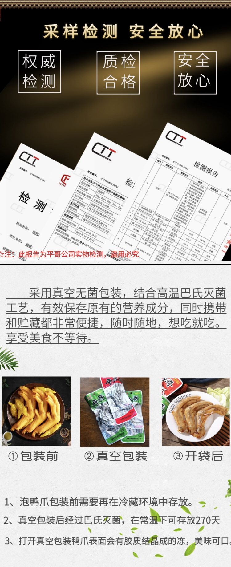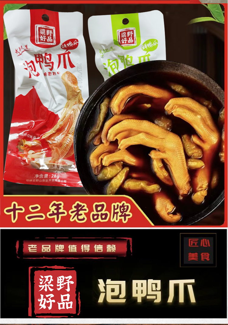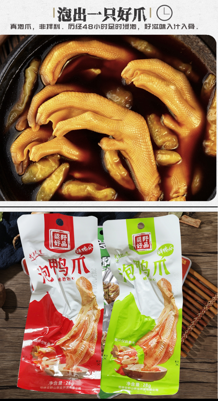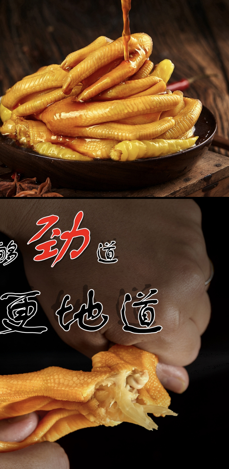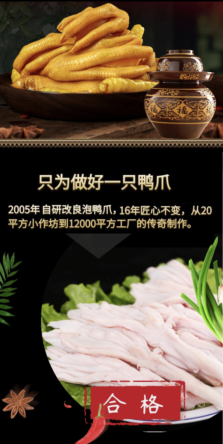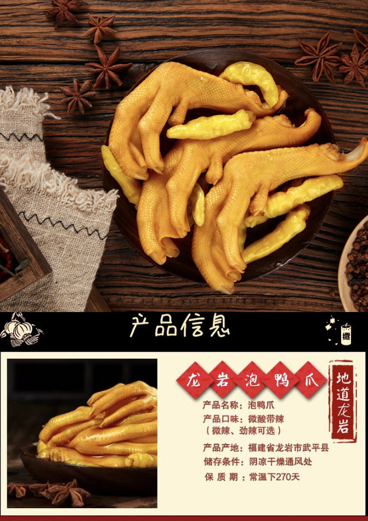 福建龙岩特产客家美食泡鸭爪,泡鸭爪是龙岩地道的美食之一,广受大众的喜爱。其口感爽脆有嚼劲,鸭爪、鸡爪本身有丰富的胶质,是一款食而不腻,吃而不肥的肉类零食。采用鸭爪、醋、蒜、天然香料等材料,经过热加工、低温浸泡制作工艺泡制而出,味道酸辣可口。味道微酸劲辣,口感鲜香滑嫩,吃起来泡椒味十足,爱吃辣的您选择香辣准没错
