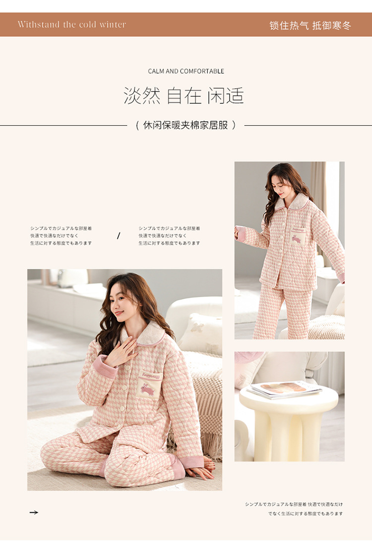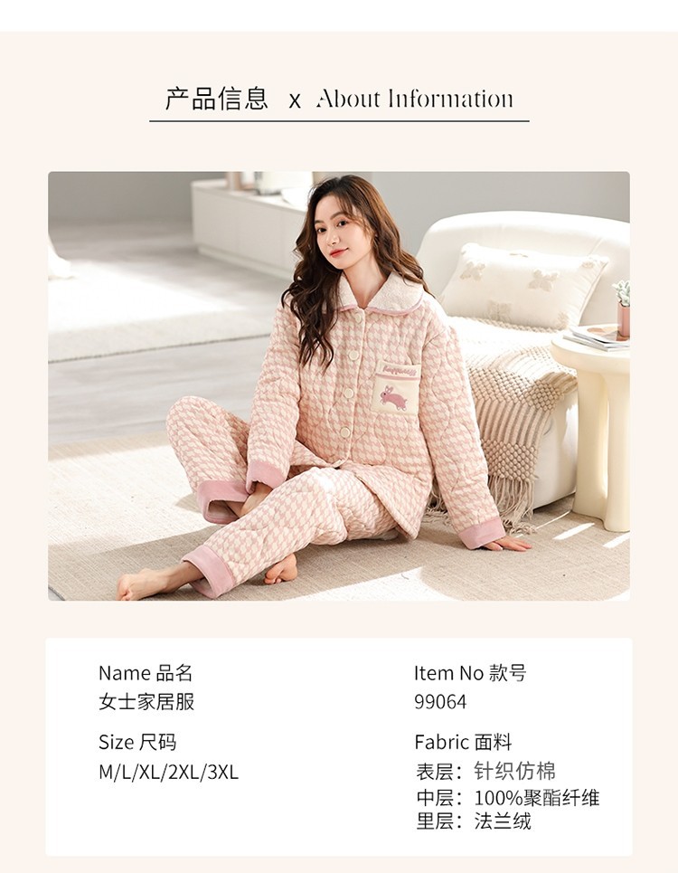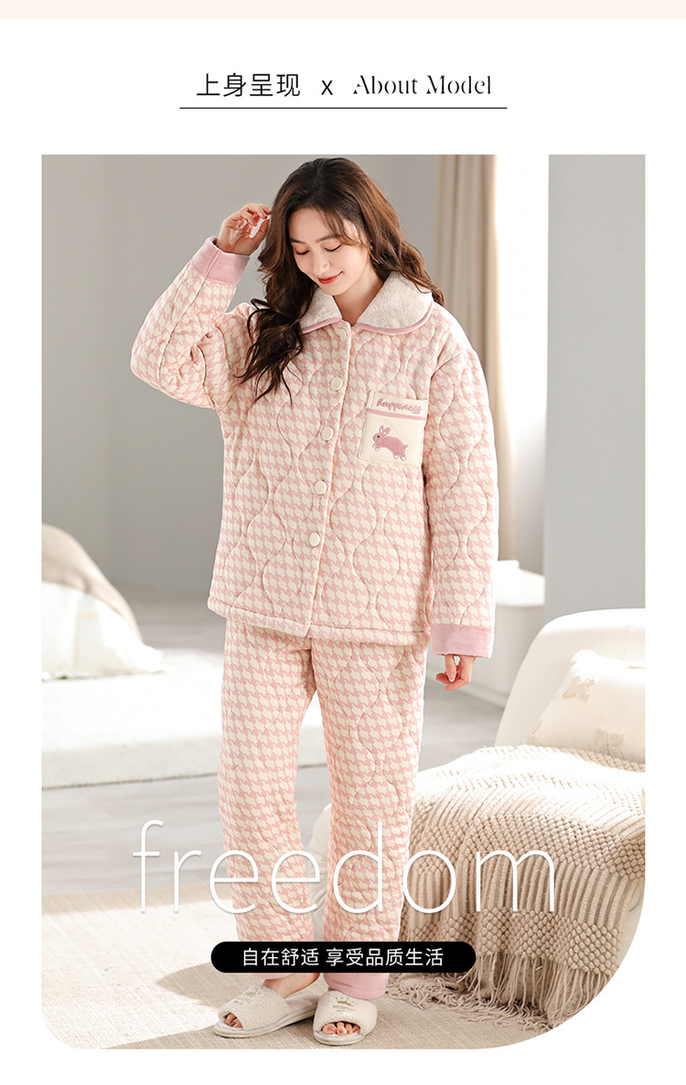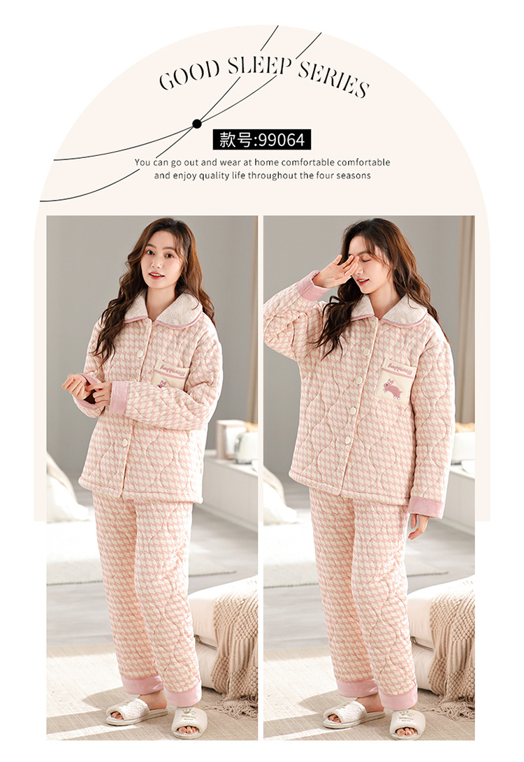 2023年新款针织三层夹棉睡衣女士冬季加厚保暖韩版宽松家居服套装