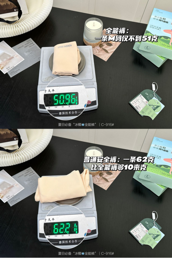测试②而且面料就跟冰豆腐一样,冰冰凉的~透气性极强, 穿上身就会自然降温,不会越穿越热, 即使久坐,散热速度也比普通冰丝安全裤要快很多!