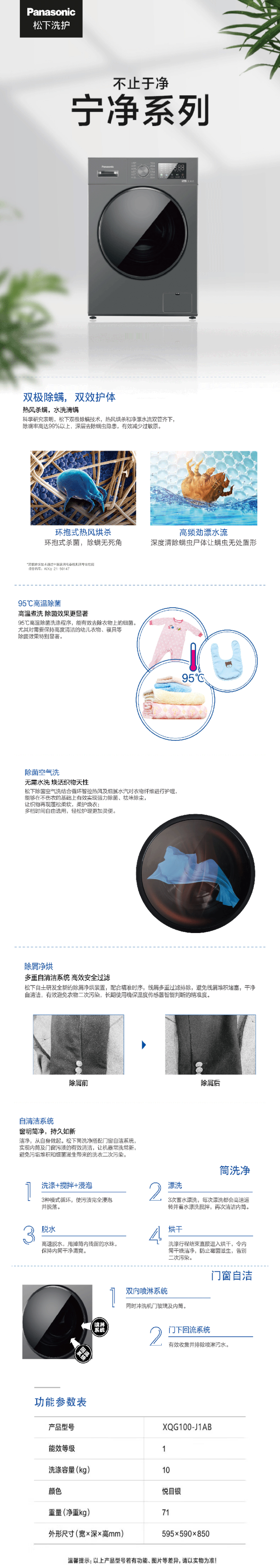 松下(Panasonic)(252144)10kg单洗滚筒 旋钮+触控 除螨洗 XQG100-J1AB