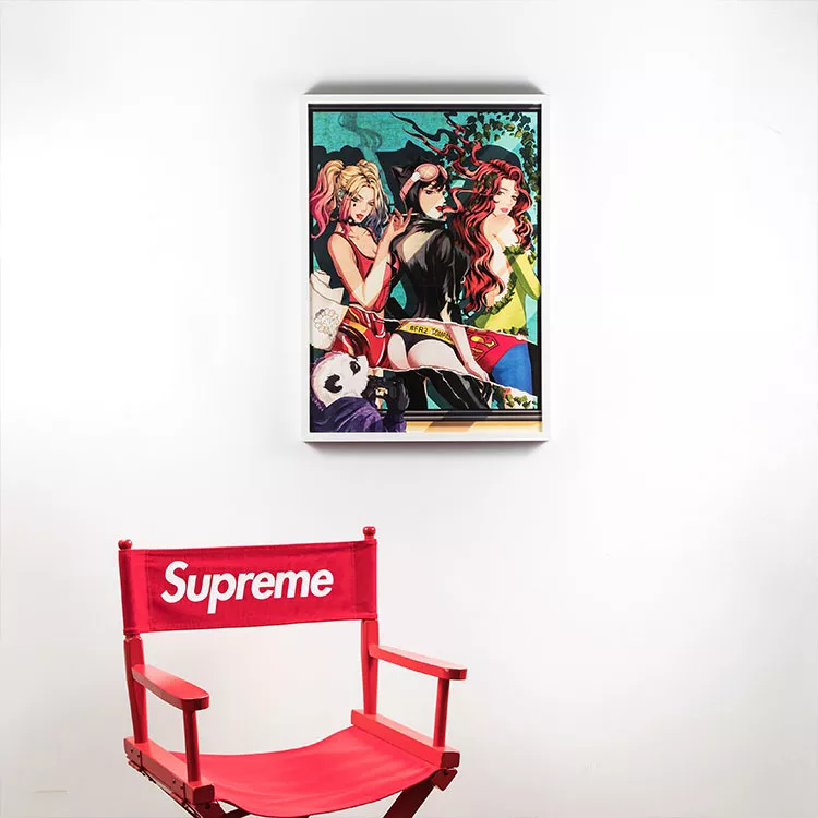 继nophots 系列再次创作,将“小丑女”哈利奎恩:“猫女”与:“毒藤女”三大美女同款,整体设计灵感来自KAWS的COMPANION角色,撕的画纸背面是为了纪念Futura在纽约Noguchi Museum举办个人展览由村上隆与Futura携手绘制的联乘系列画作。整幅画将漫威人物与潮流元素完美结合,给人视觉上的冲击。