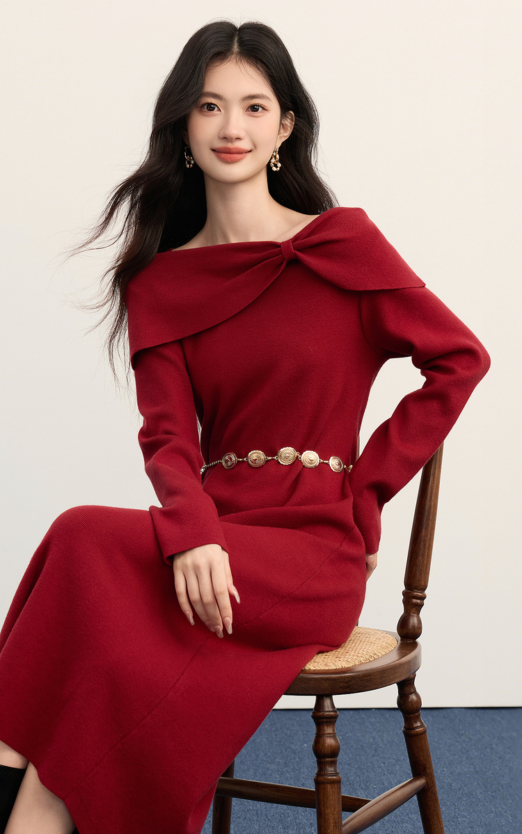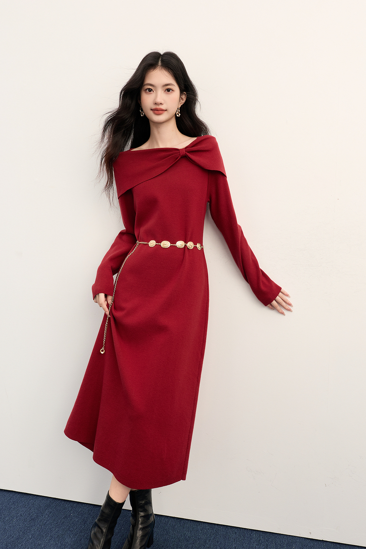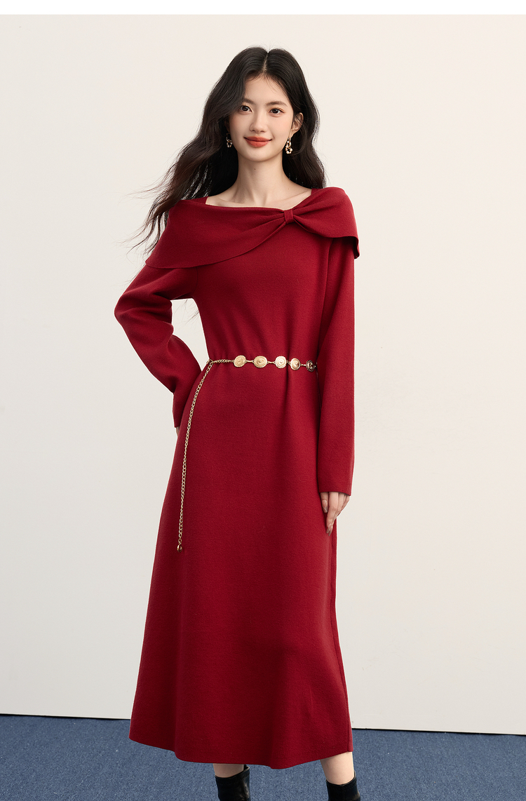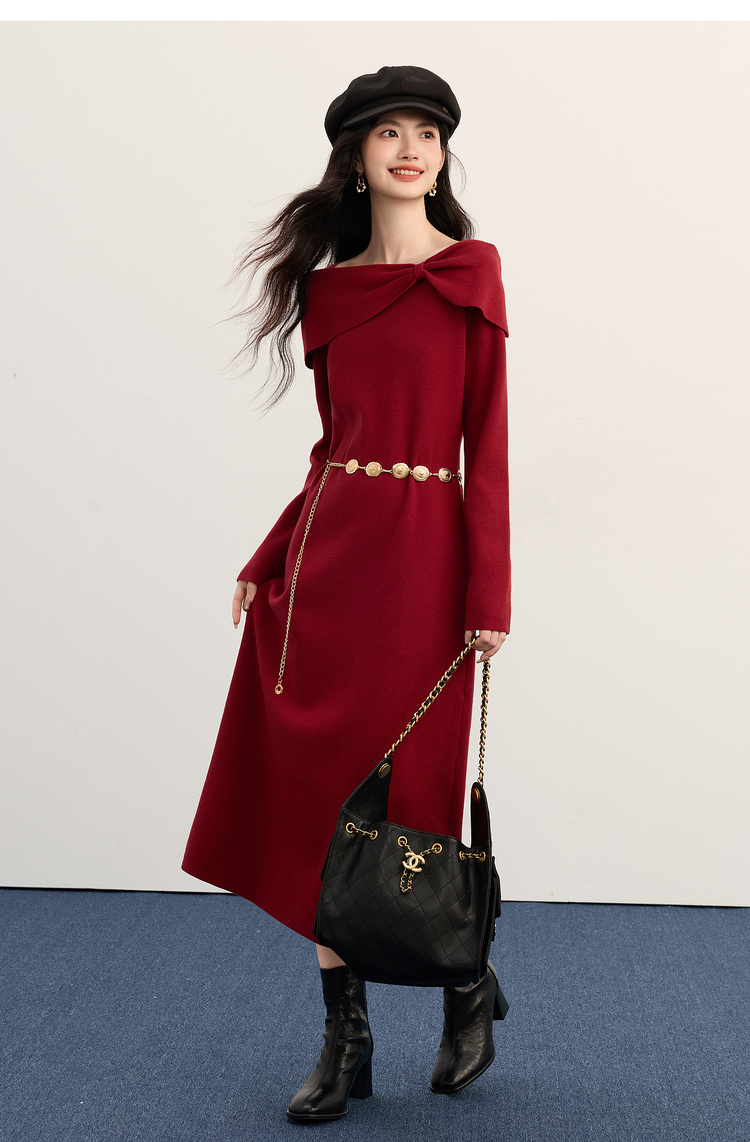 【12/03新品】熙世界2025冬季圣诞千金赫本红色蝴蝶结一字领针织连衣裙氛围感女