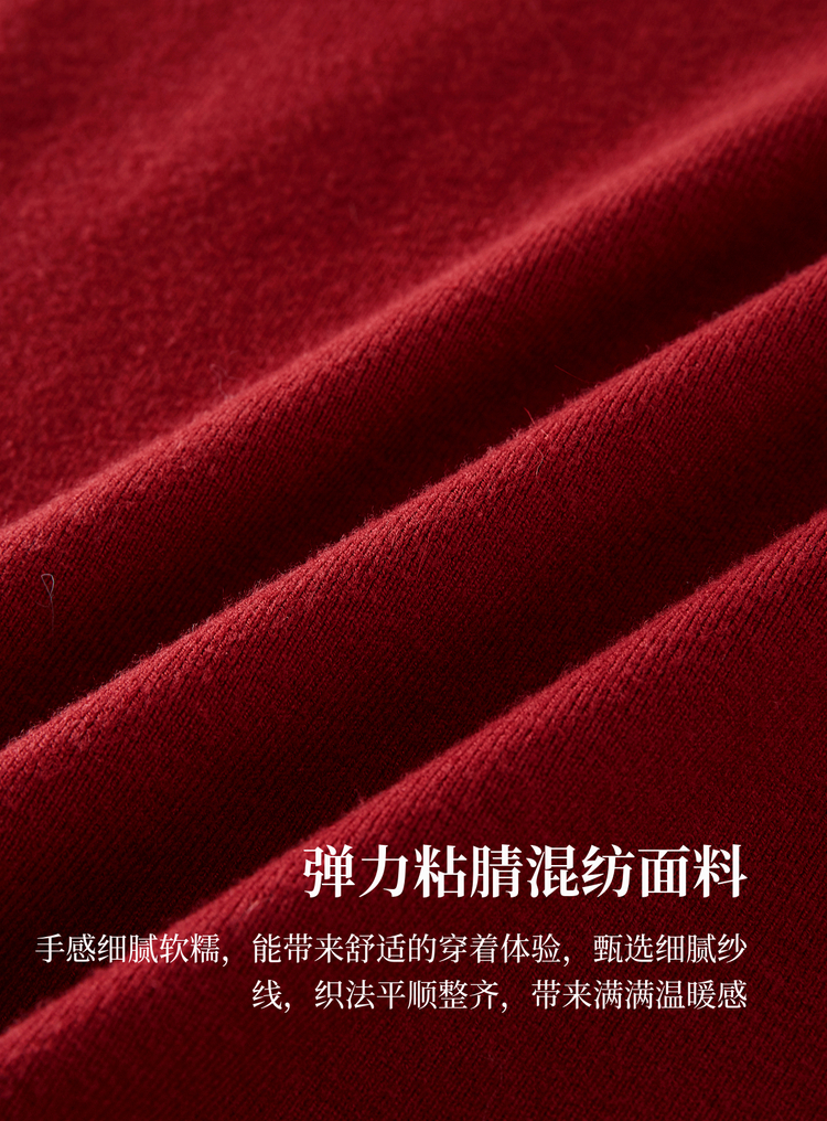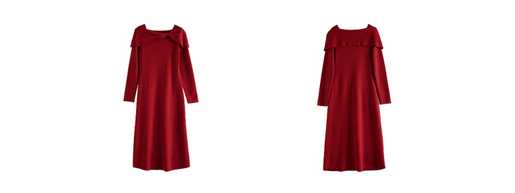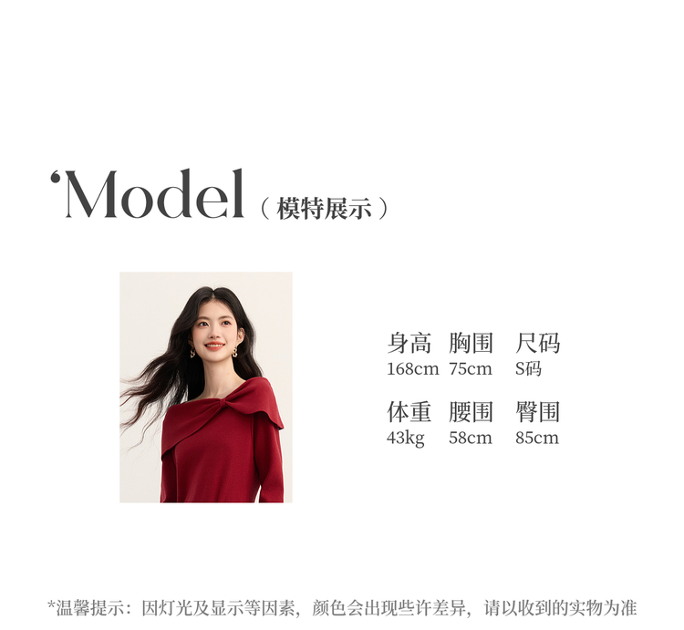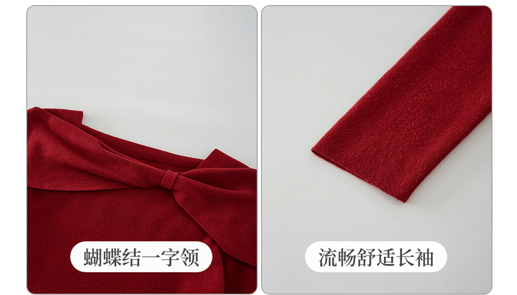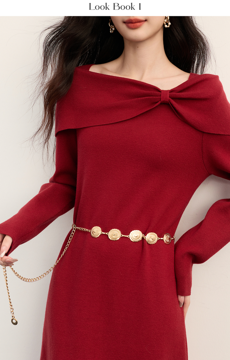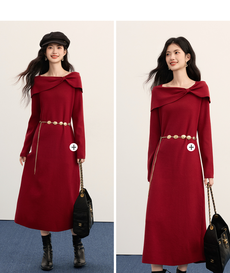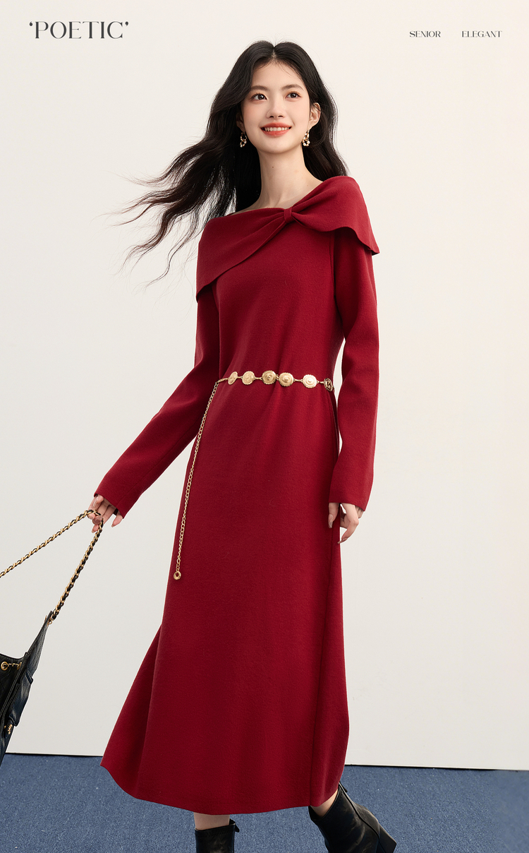 【12/03新品】熙世界2025冬季圣诞千金赫本红色蝴蝶结一字领针织连衣裙氛围感女