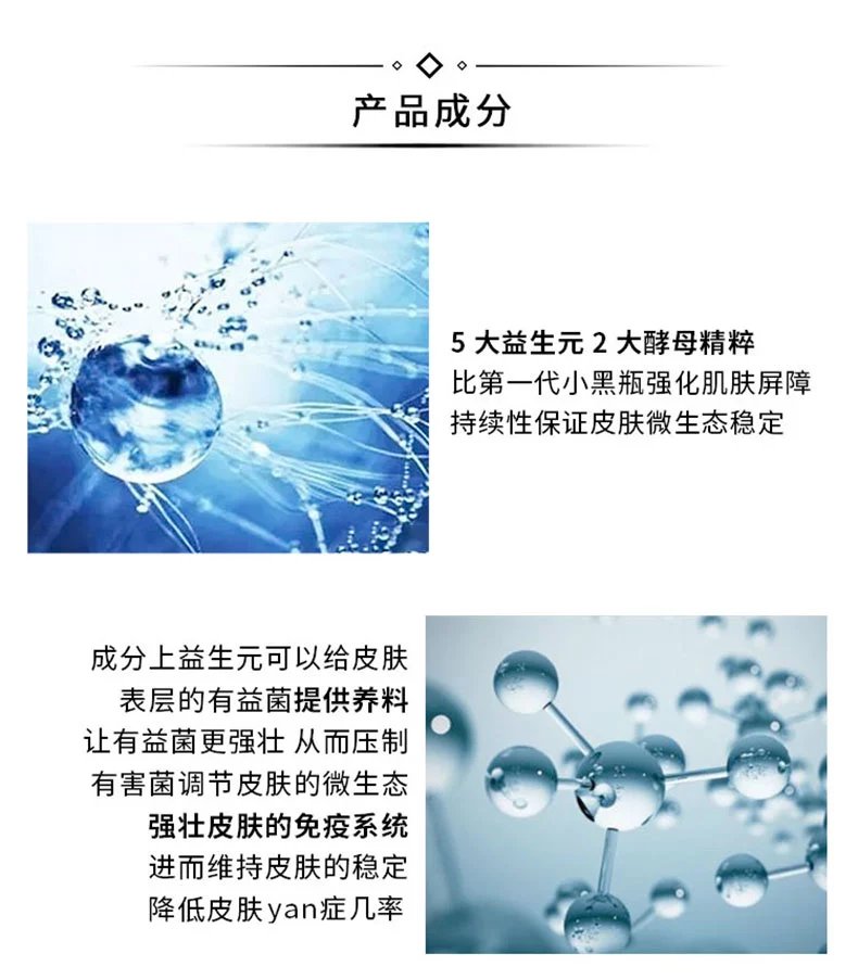 1、这款小黑瓶的核心成分是二裂酵母发酵产物溶胞物和酵母提取物,2大酵母精华可以起到预防表皮和真皮光老化的作用,有轻微剥落角质功效,并对肌肤有很好的修护和提亮肤色的作用