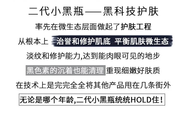 2、改善粗糙,延缓衰老,紧致肌肤:小黑瓶作为一款抗初老产品,意味着及早使用,更有利于保持皮肤更好的状态,所以它更适合26 30岁的人群使用