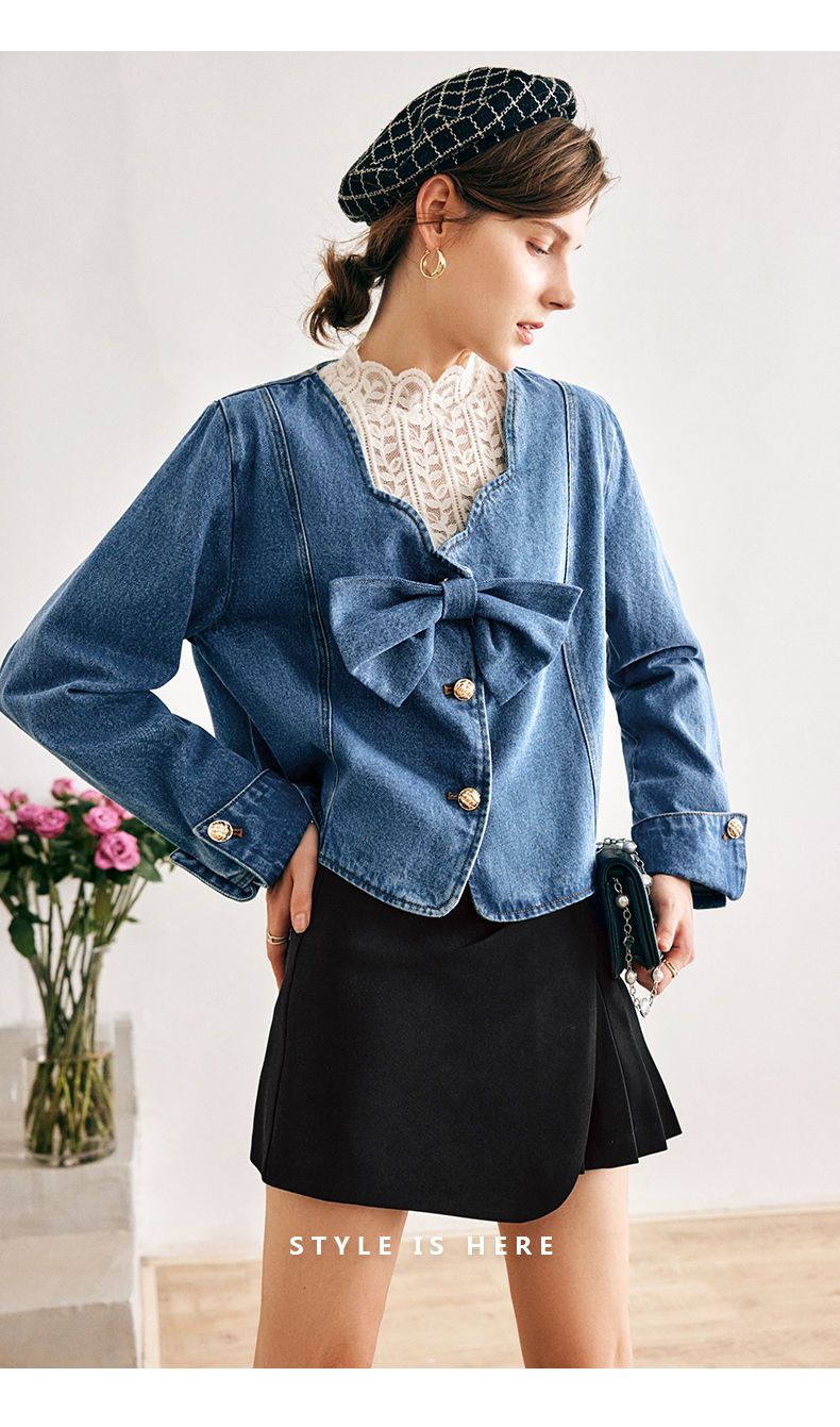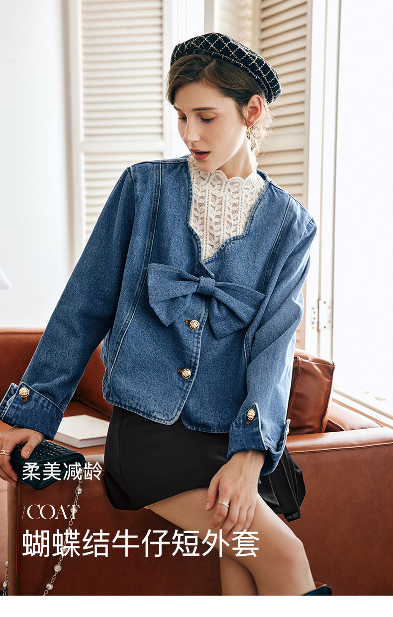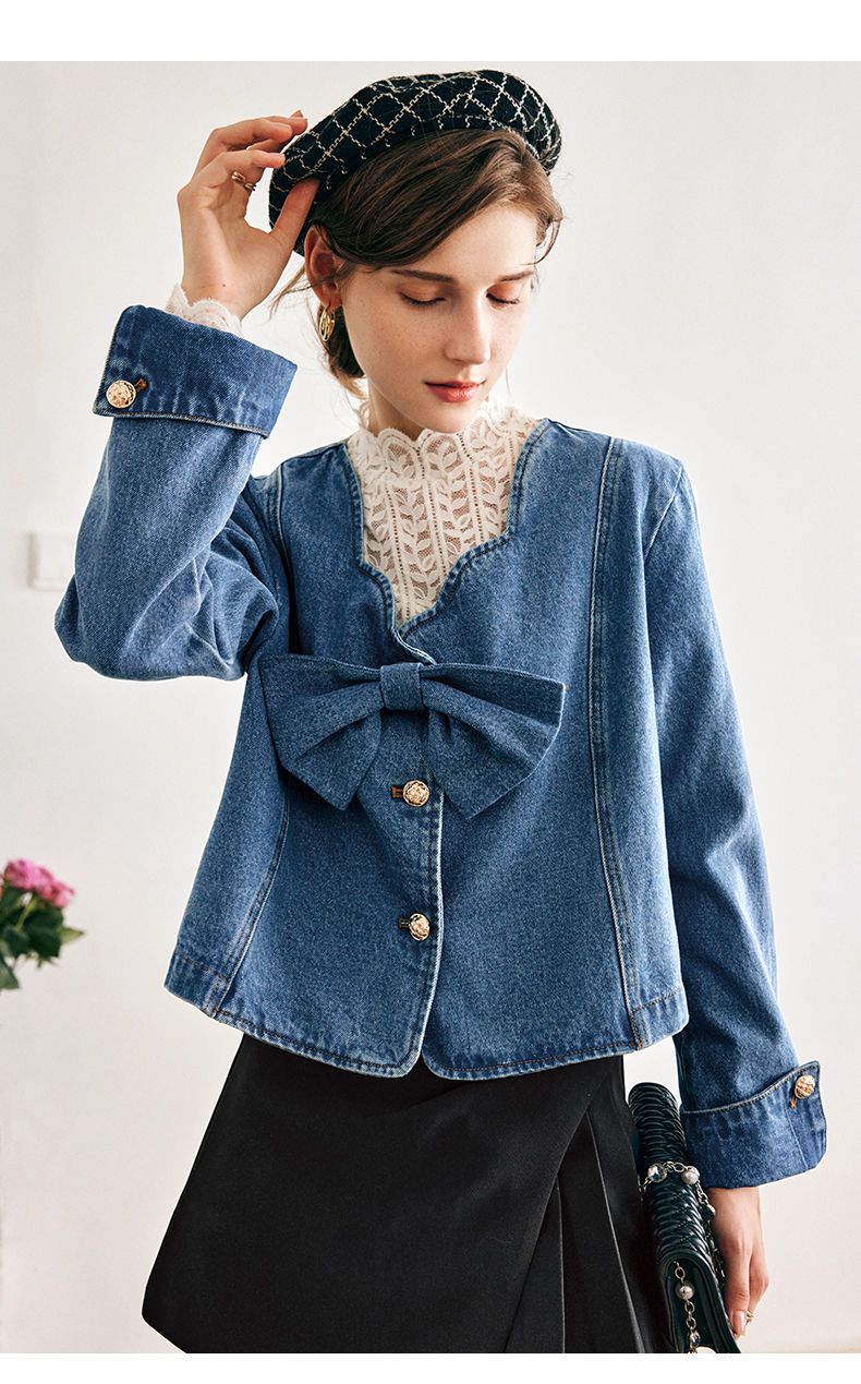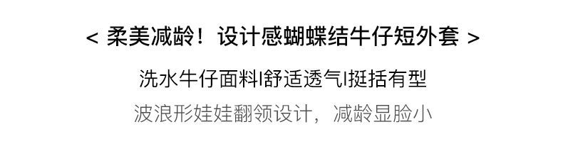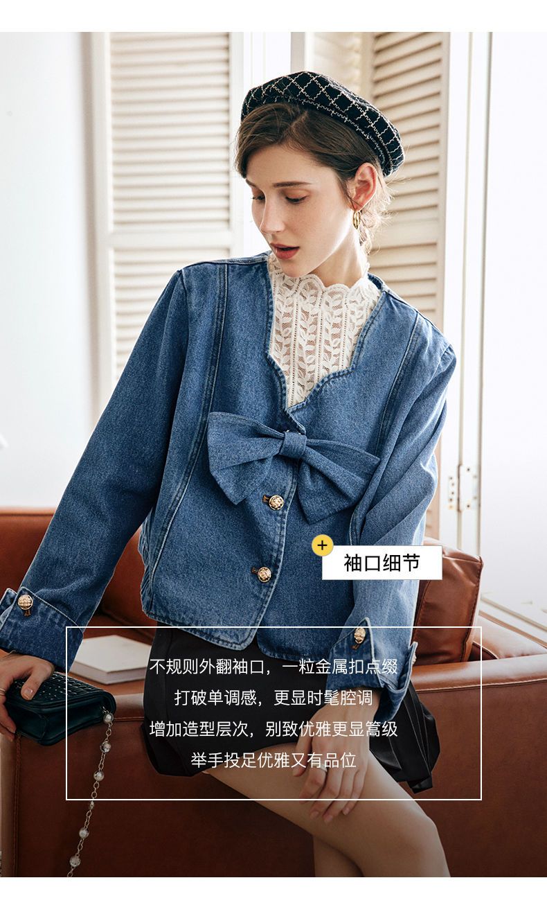OLrain法式牛仔蓝短外套女早秋2022年新款设计感蝴蝶结花瓣领上衣