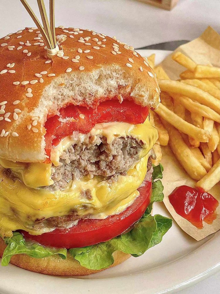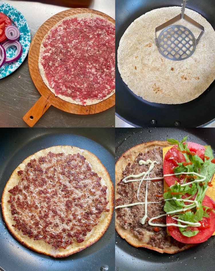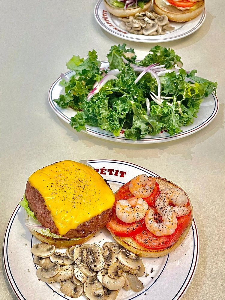 比如周末的早上,拿出牛肉饼解冻后, 两面各煎5分钟左右, 再用锅内的余温加热一下面包和芝士,洗净蔬菜,最后组装起来。
