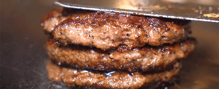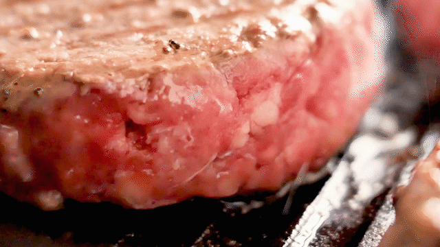牛肉饼在煎烤的时候,油花滋啦啦地侵入饱满的肉粒,鲜红的生肉色慢慢过渡到醇厚的熟褐色,在颗粒间溢出汁水,让人忍不住咽口水!