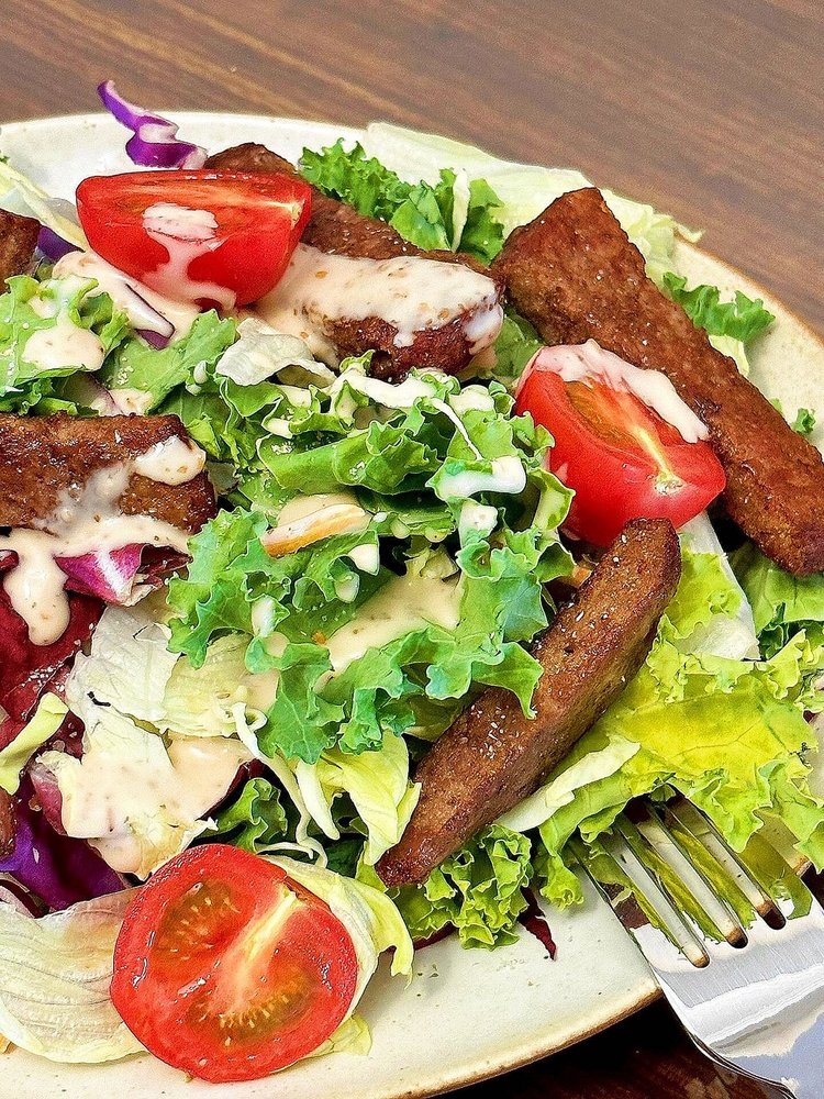 或者中午懒得做饭,将牛肉饼煎好切条,再随便放点蔬菜、芝士, 直接get一份减脂又美味的和牛沙拉。