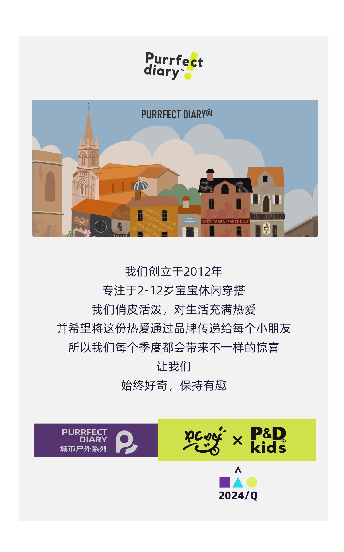 - Purrfect-Diary专注于贴近自然随性的穿着概念,轻奢平价的童装文化传播,在产品设计上更加注重婴童穿着的舒适性、安全性、更出众的国际化品牌,将欧美的育婴文化在中国进行深入的传播与推广。