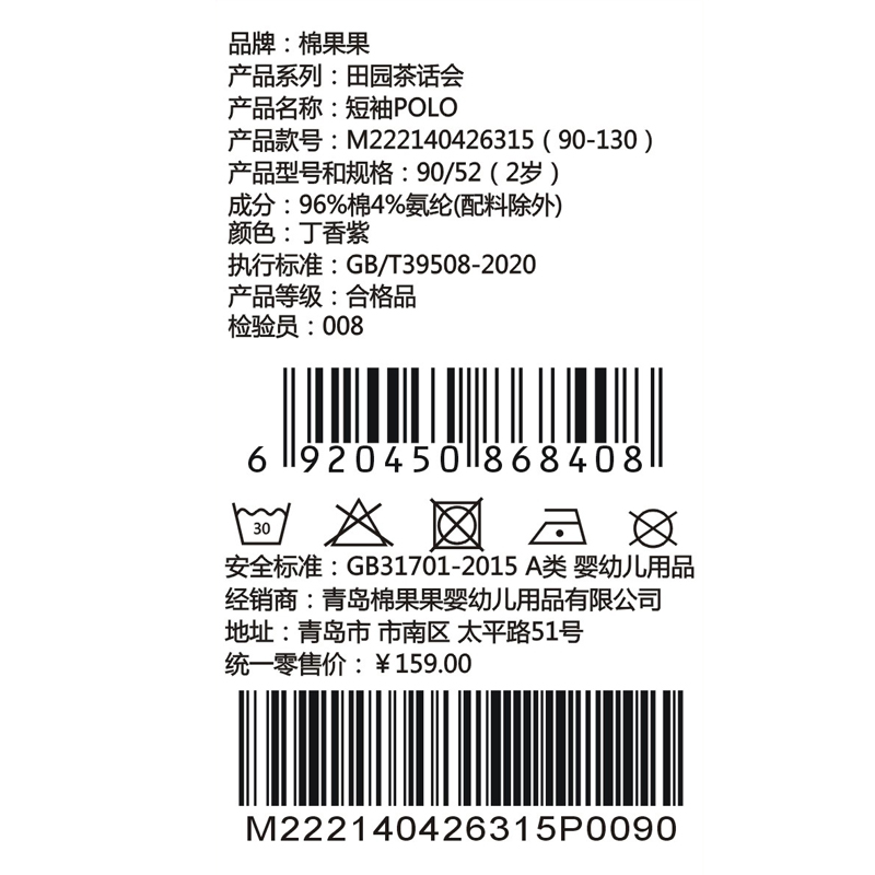 棉果果夏季新品女童珠地网眼纯棉短袖POLOM222140426315