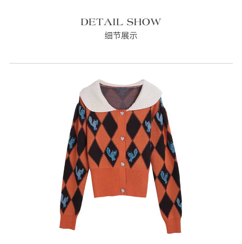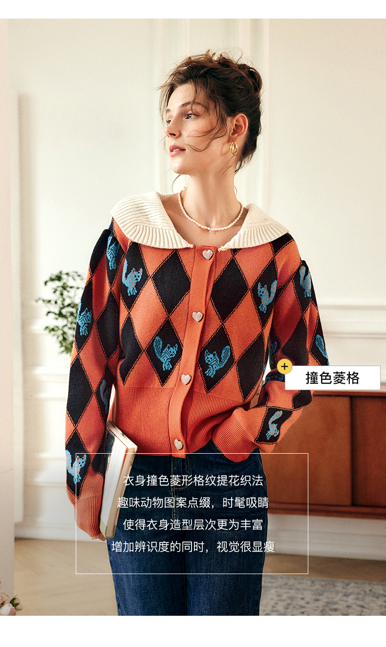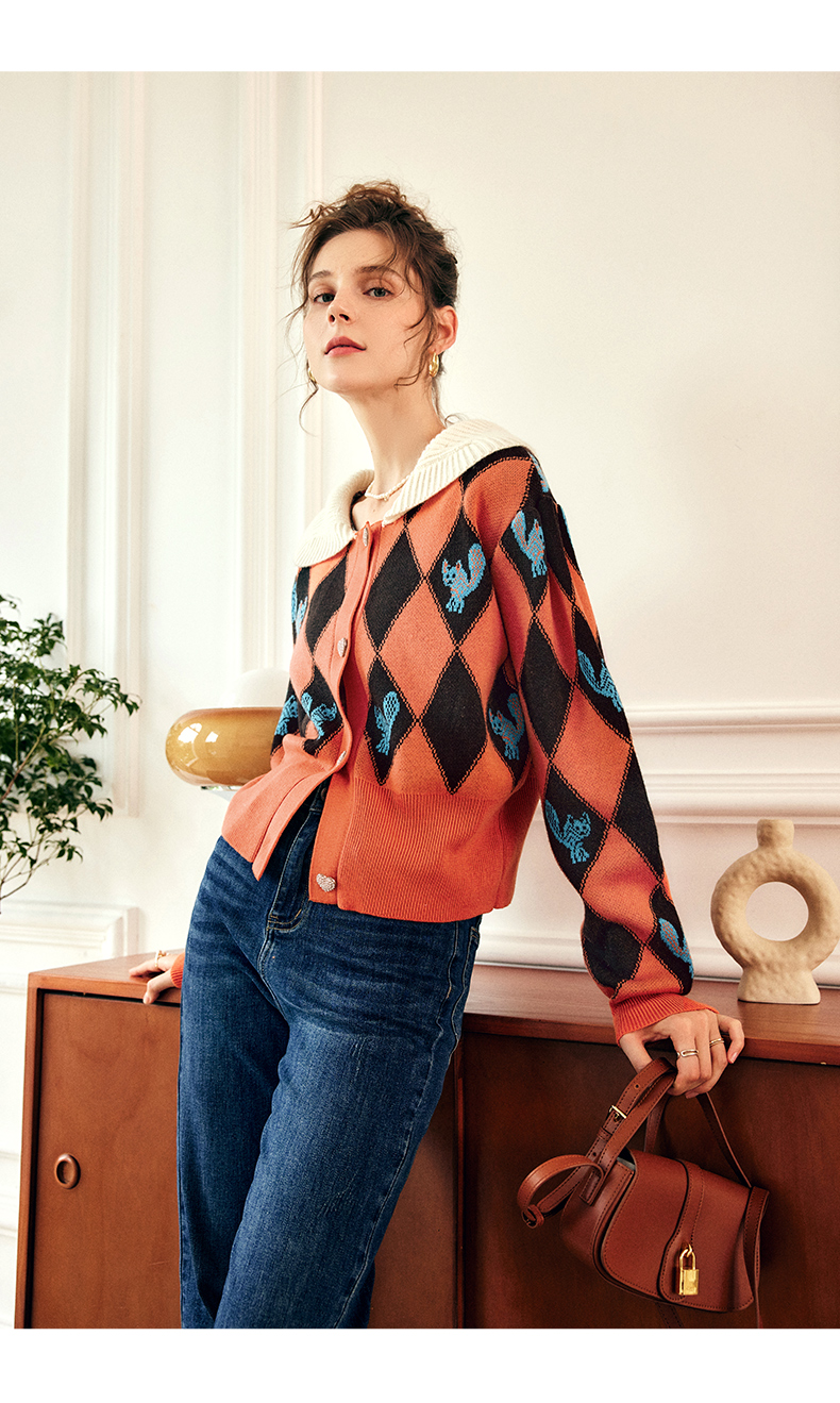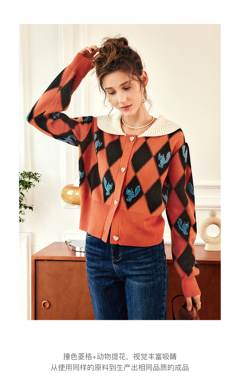OLrain欧芮儿法式娃娃领菱格毛衣外套女春季2023新款撞色针织开衫