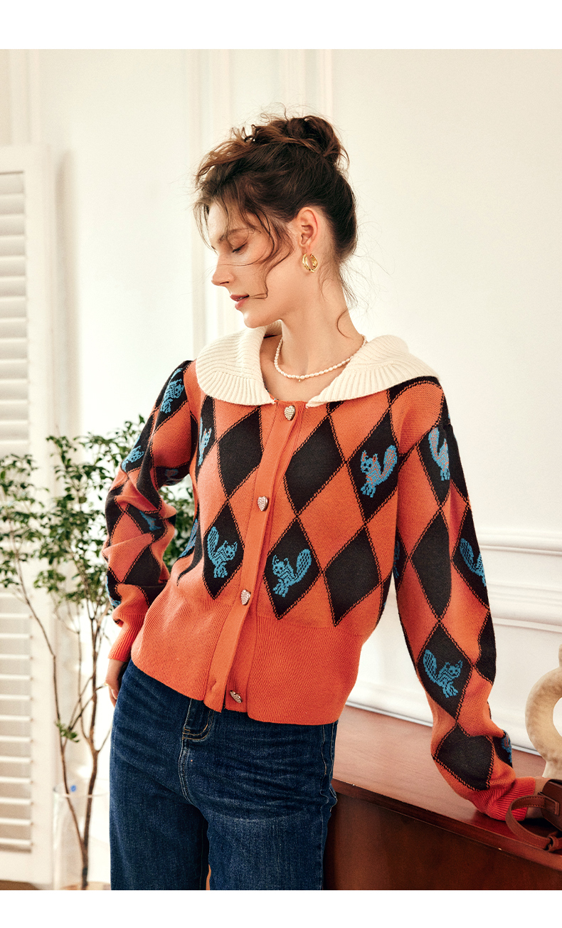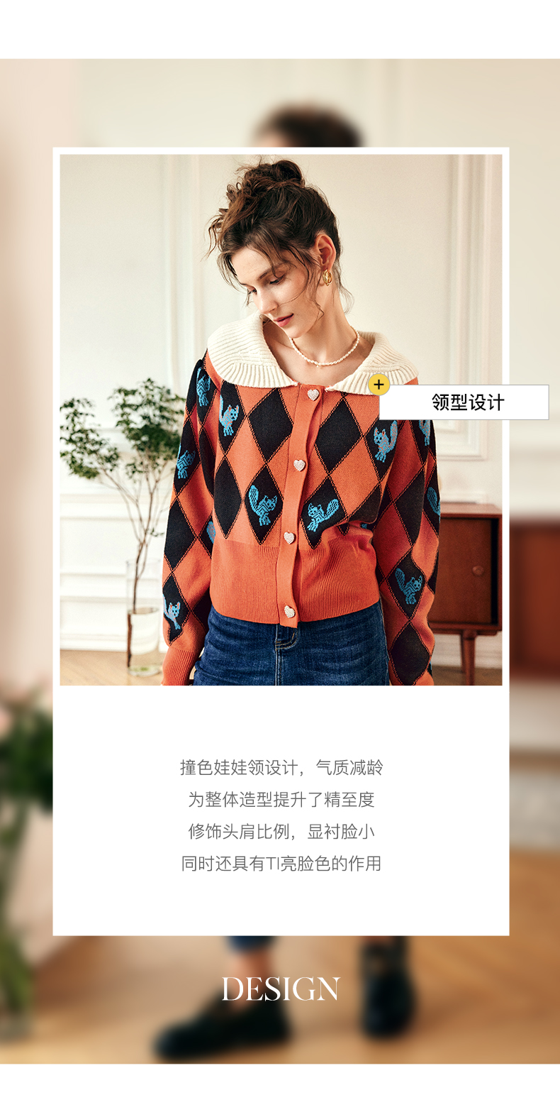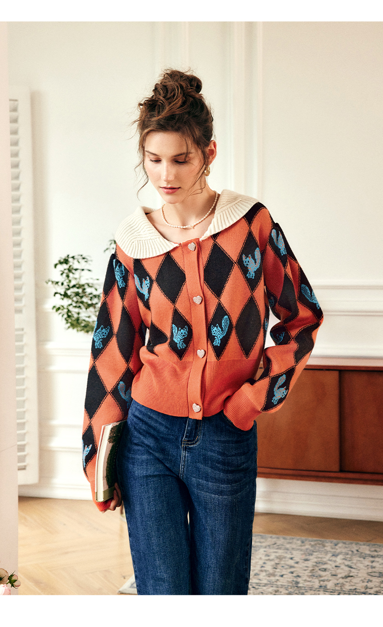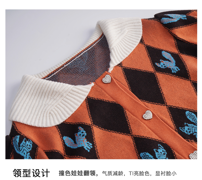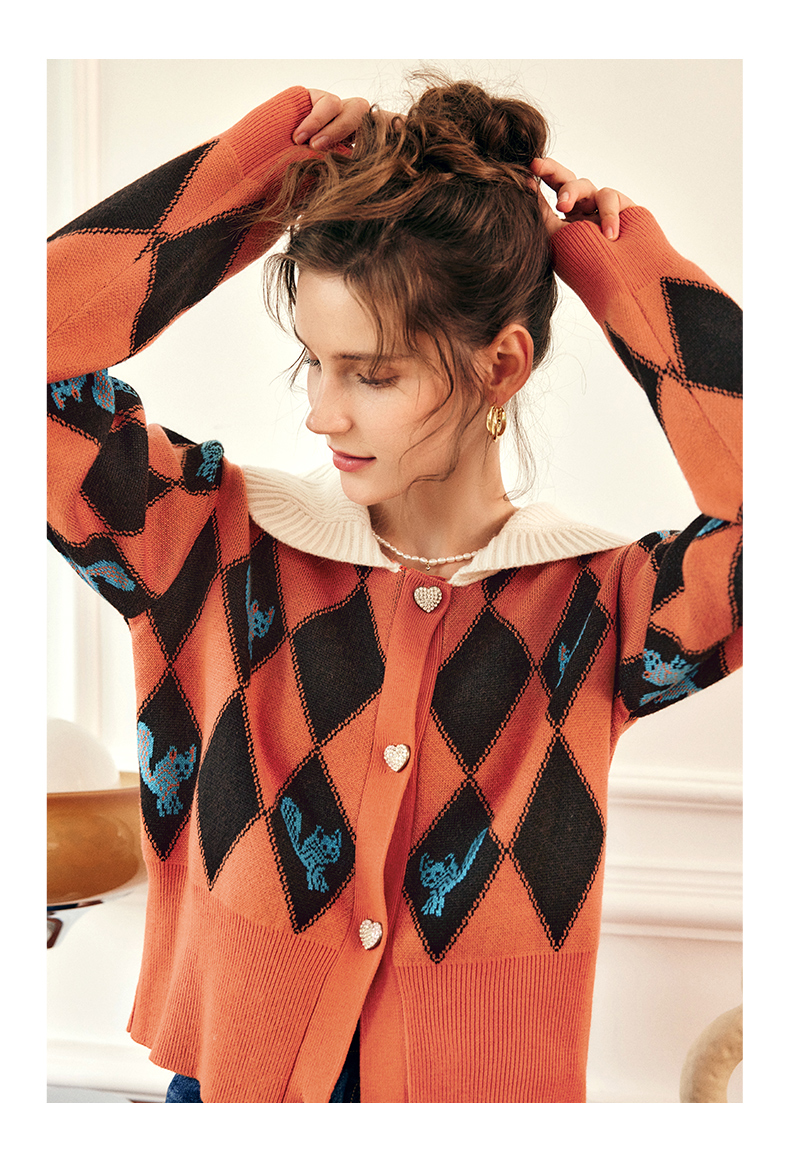 OLrain欧芮儿法式娃娃领菱格毛衣外套女春季2023新款撞色针织开衫