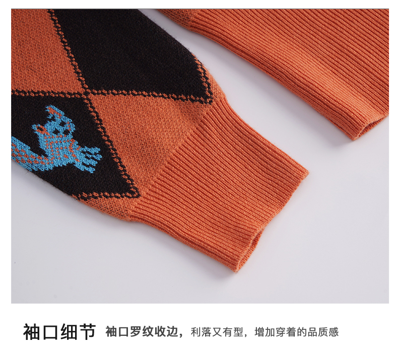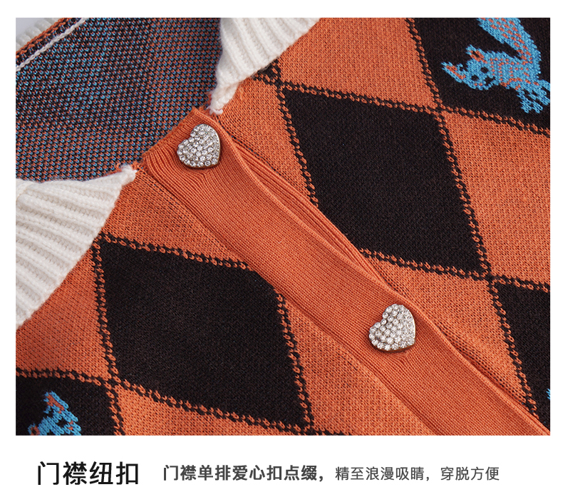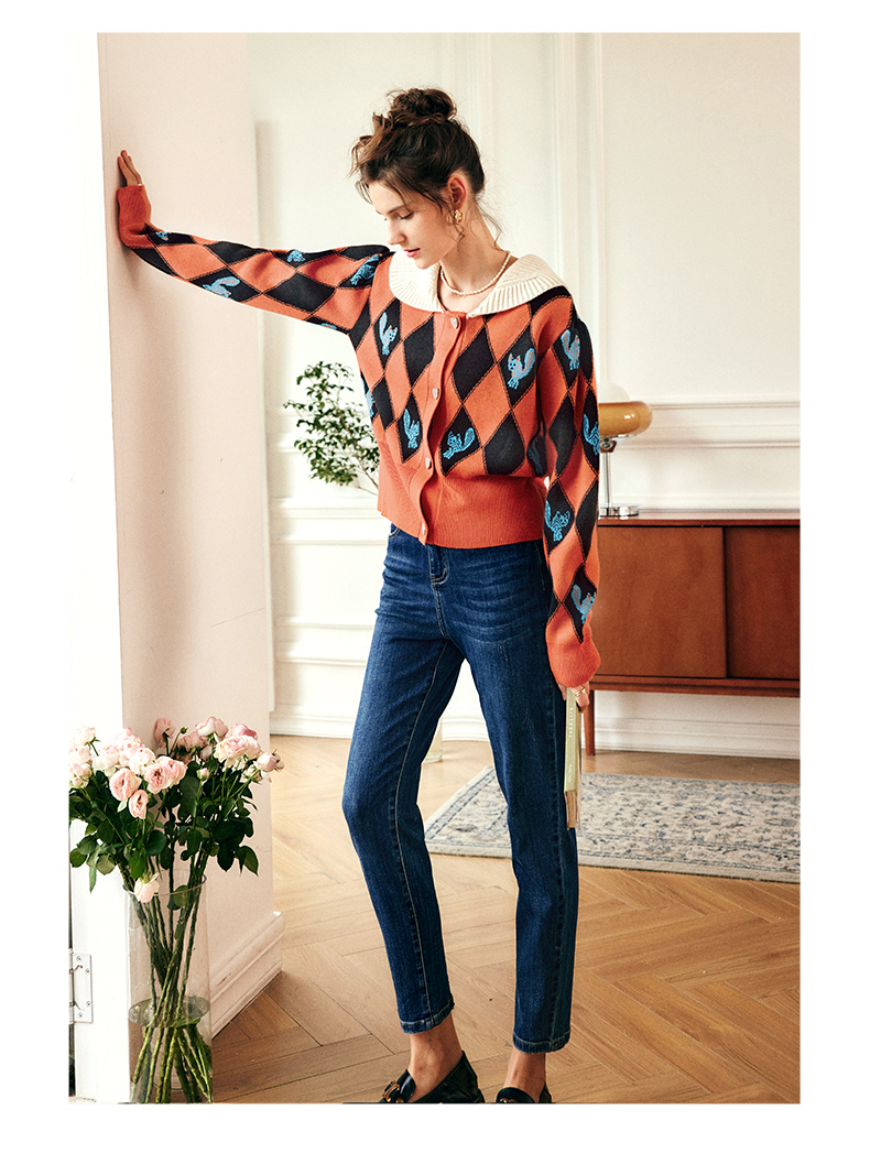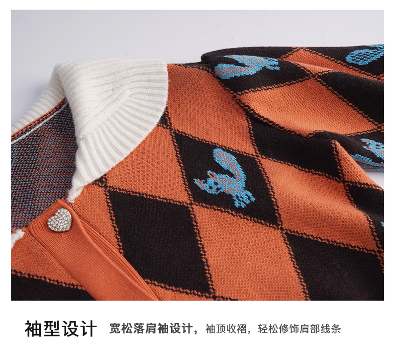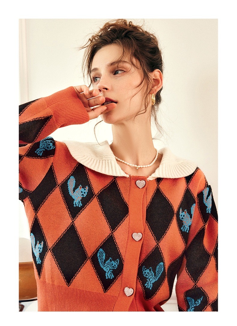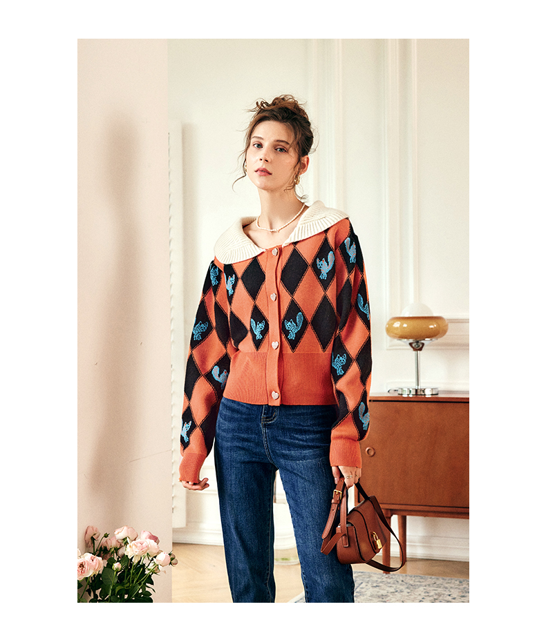 OLrain欧芮儿法式娃娃领菱格毛衣外套女春季2023新款撞色针织开衫